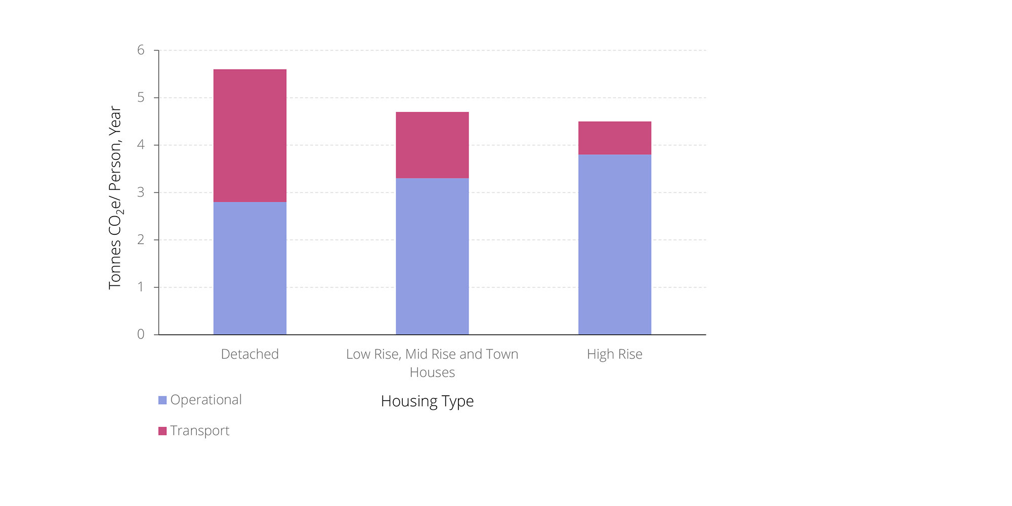The same question was addressed by Colin Beattie and Peter Newman in Sydney, Australia, where the carbon footprint of 4,000 living spaces – a mix of high-rise, mid-rise, low-rise and individual houses – was compared. Once again, the study found that the higher emissions due to private transport (in magenta) in detached houses in low density areas was the defining factor that led to these areas having the largest carbon footprint.