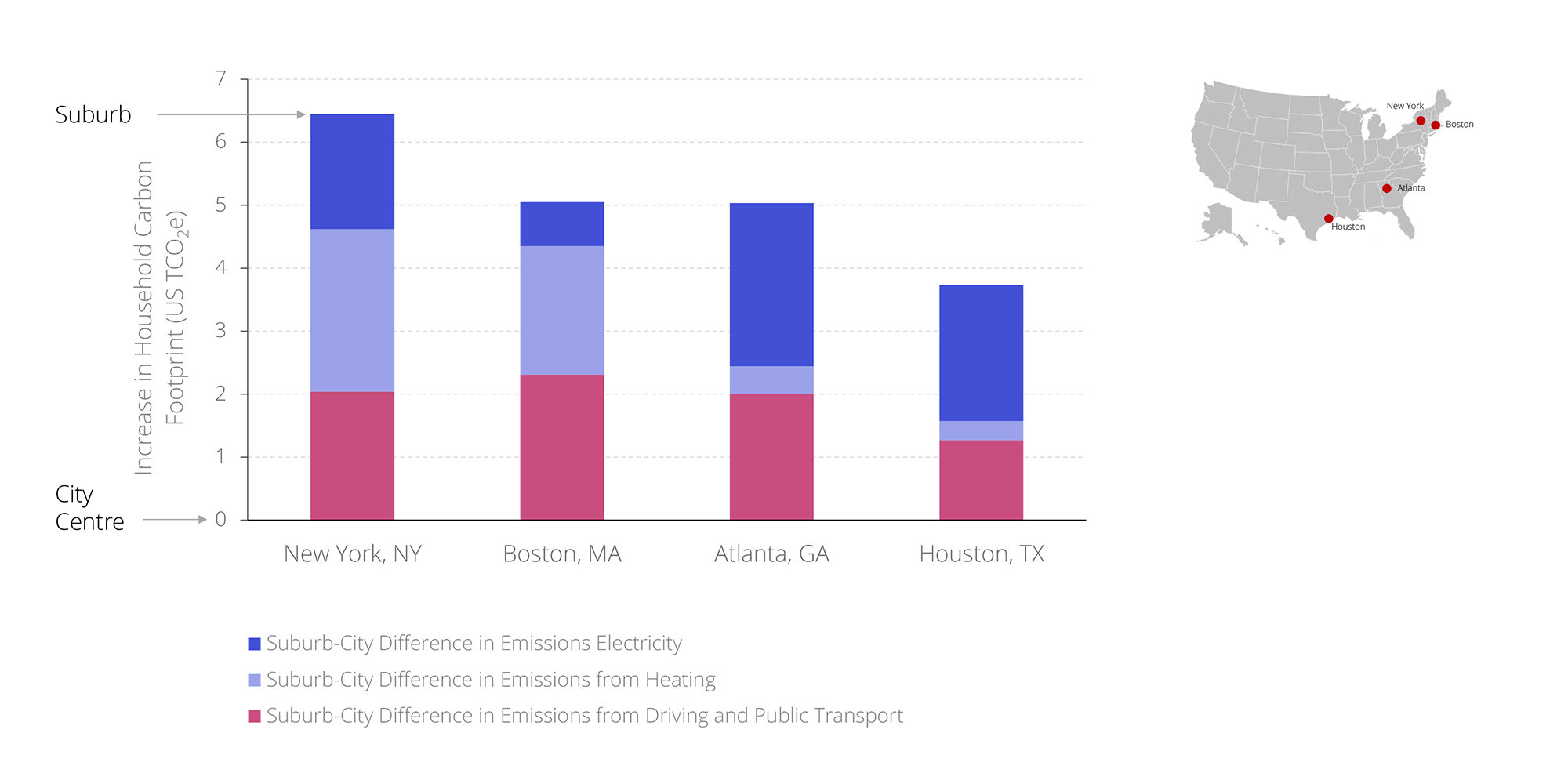 Other studies are consistent with these results. Professor Glaeser examined metropolitan areas across the United States to compare the difference in the household carbon footprints between the suburb and city centre for each area. In the graph below, each bar represents the increase in household carbon footprint between the city centre and its corresponding suburb. Households in northern cities (New York, Boston) use more natural gas for heating (shown in light blue), while households in southern cities (Atlanta, Houston) use more electricity for cooling (shown in dark blue). And the carbon due to transport (in magenta) is consistently higher in the suburbs compared with the city centres.