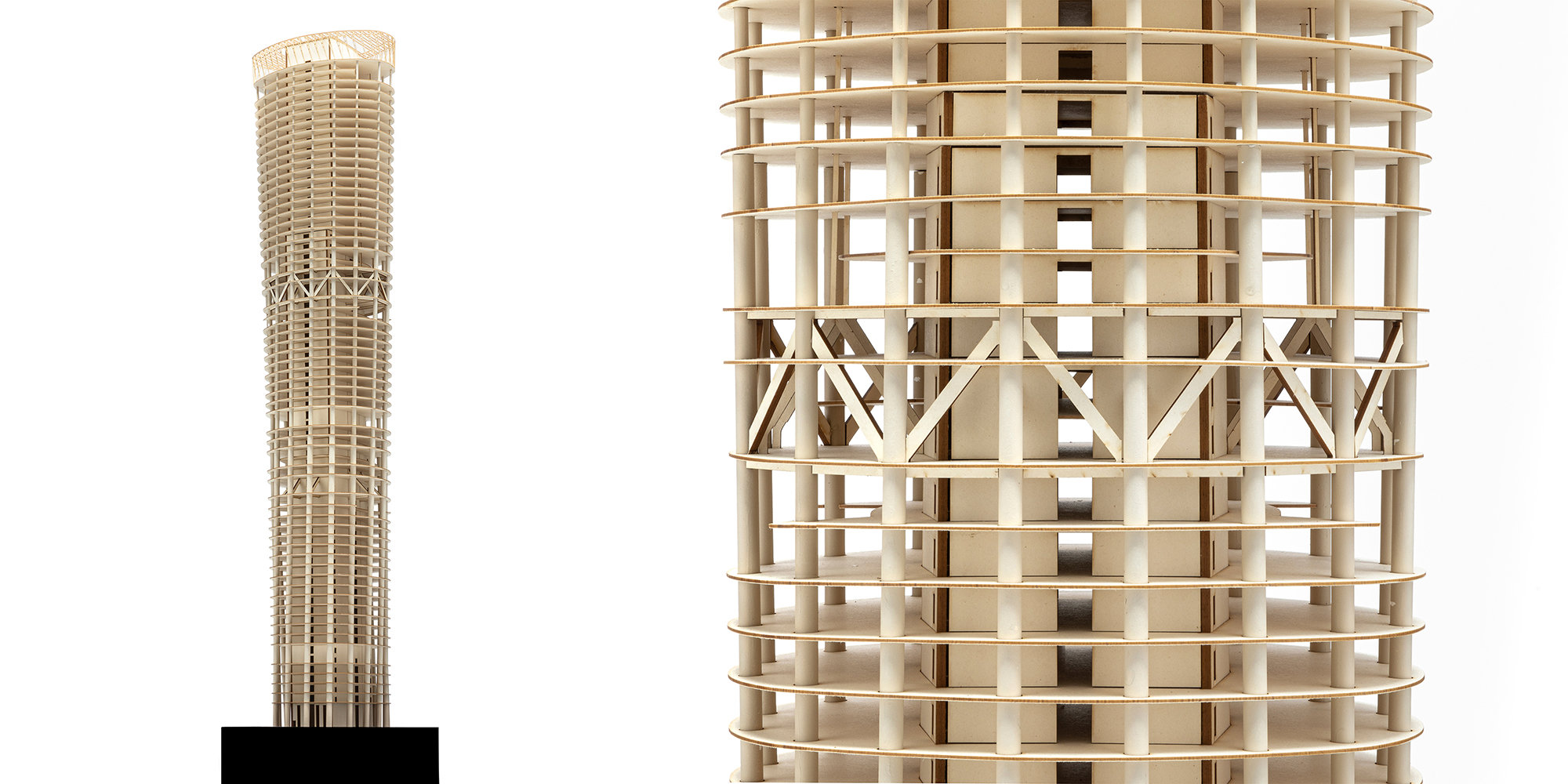 Cardboard model and structural section drawing of one of the Lusail Towers. These models are created by the in-house structural team at Foster + Partners to show only the structure of a project, with the façade removed, exposing the skeleton. © Foster + Partners