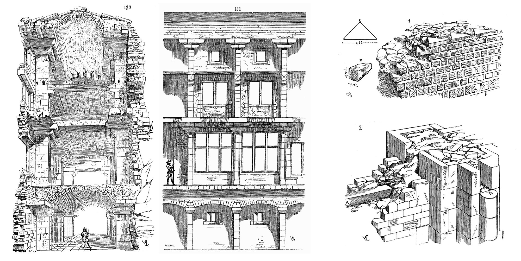 Illustrations from Eugène Viollet-le-Duc’s Dictionnaire raisonné de l’architecture française du Xie au XVIe siècle (1858). The constructive (left) and longitudinal (centre) section drawings show the Château du Haut-Koenigsbourg in Alsace, France. The structure dates from the Fifteenth Century but follows medieval Gothic construction techniques from the Thirteenth Century. On the right are two detail wall-construction drawings, illustrating Roman rubble and brick methods (above) and medieval walls (below) with ashlar stone facing at the main points of support.