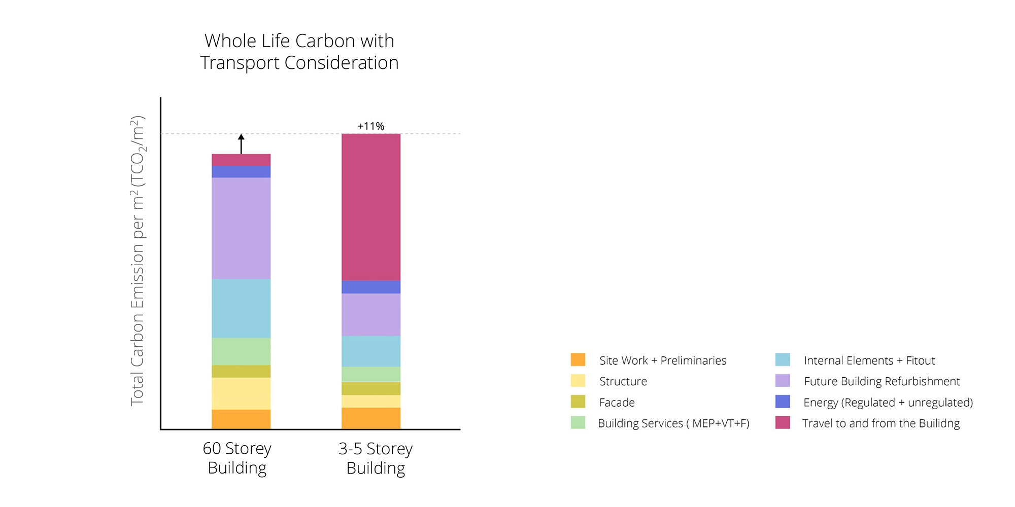 The results show that even though the embodied carbon of the structure (shown in yellow) is greater for the high-rise than for the low-rise, the carbon footprint of private transport (in magenta) for the less-dense development outweighs the embodied carbon savings from low-rise construction.