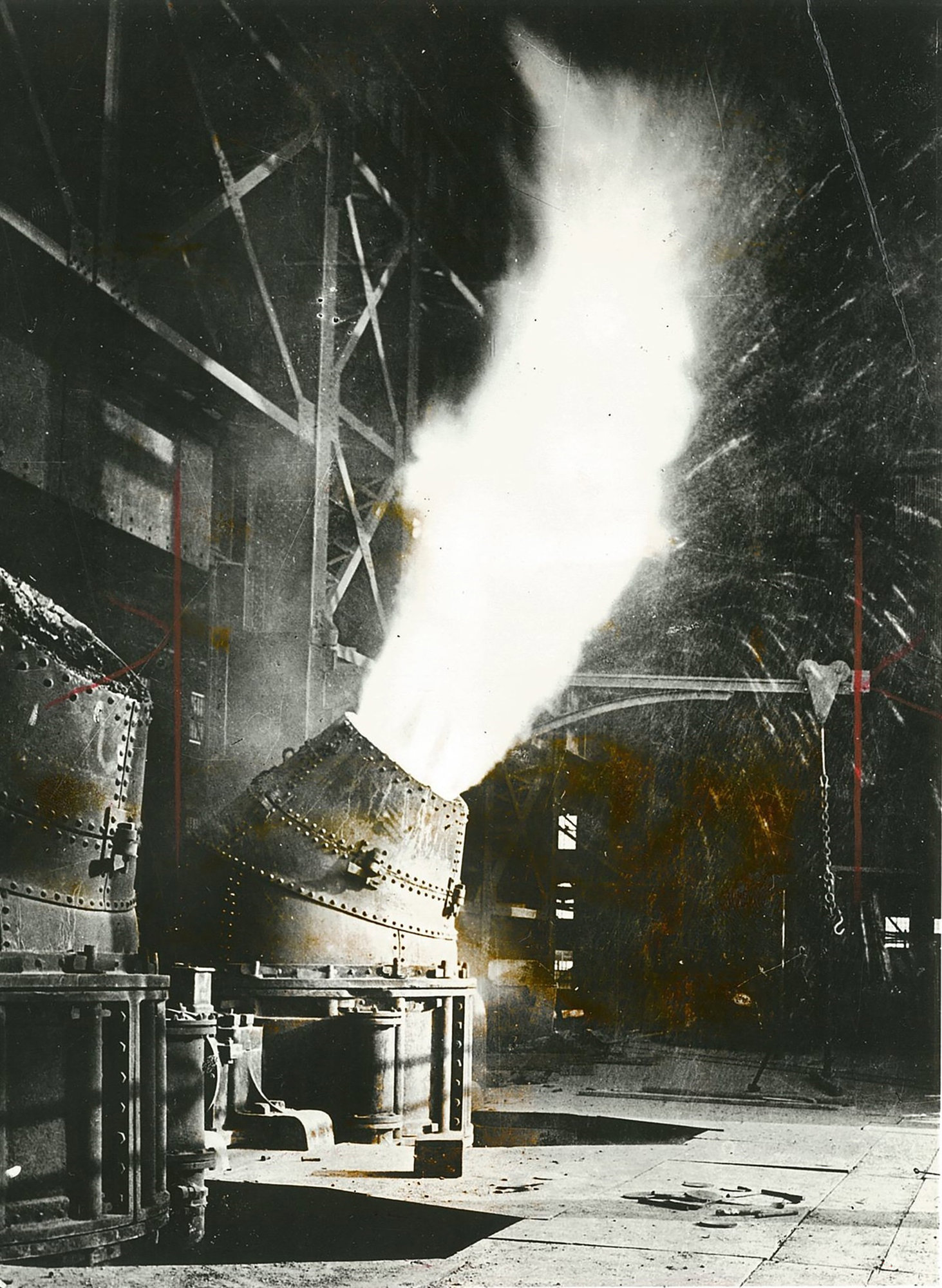 A Bessemer converter at the American manufacturer Lackawanna Steel in New York, 1903. The primary process involved blowing air through molten pig iron, which results in oxidation, removing impurities. Bessemer’s process took between 10 and 20 minutes to convert three to five tons of iron into steel, replacing what would previously have been a full day of heating, stirring and reheating.