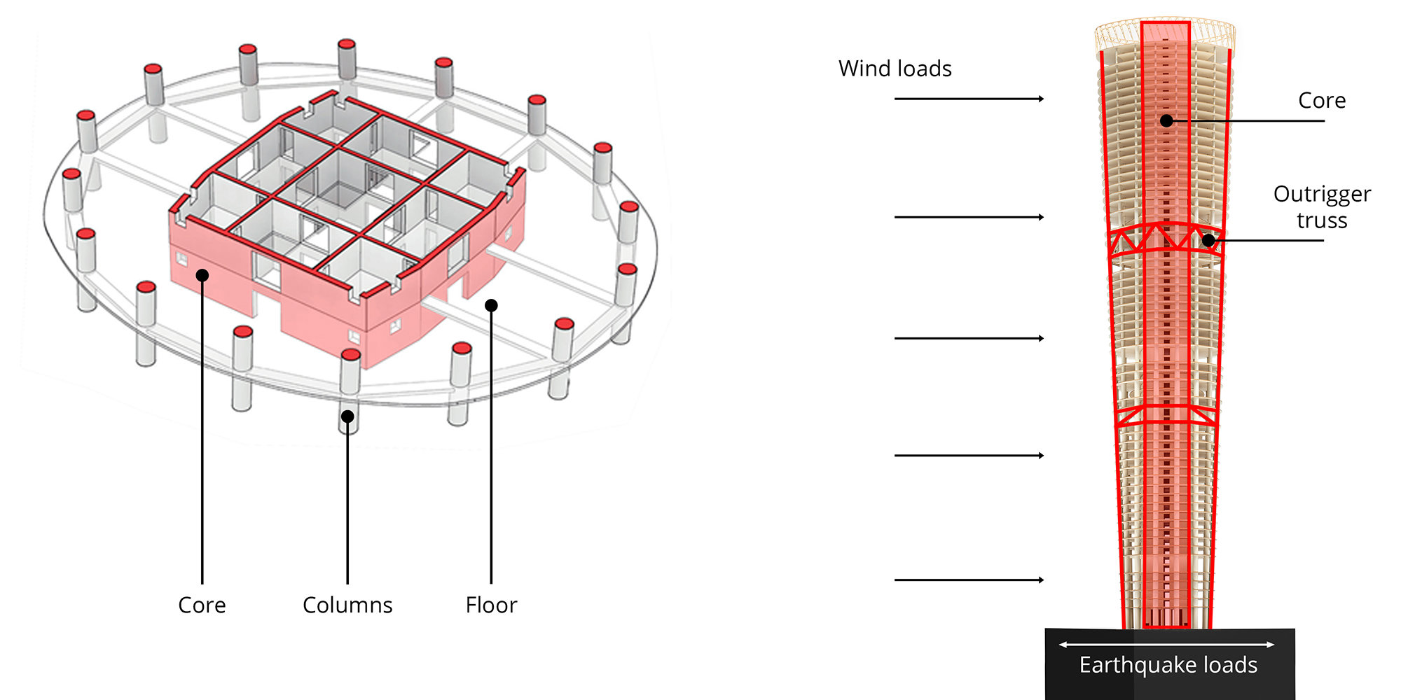 A tower is a cantilever, fixed at the base, and subjected to both vertical and lateral loads over its height. The applied ‘live’ loads are divided into the vertical loads due primarily to the building users, and the lateral loads that are due mainly to wind and earthquakes. The building also must support the ‘dead’ loads, that is the self-weight of the structure, the cladding, the finishes, and the services. These loads are carried by the structure down to the foundations. The following case studies of high-rise projects designed by the integrated team at Foster + Partners show the structural principles employed.