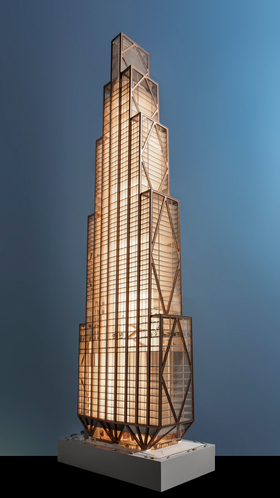 The card model of 425 Park Avenue demonstrates the tower’s structural principles. A single line of columns starts at the top of the building and bifurcates at two levels as it descends. Each bifurcation creates diagonals that also connect to the core so that the columns and the core act together to provide stiffness and strength in both orientations. © Foster + Partners