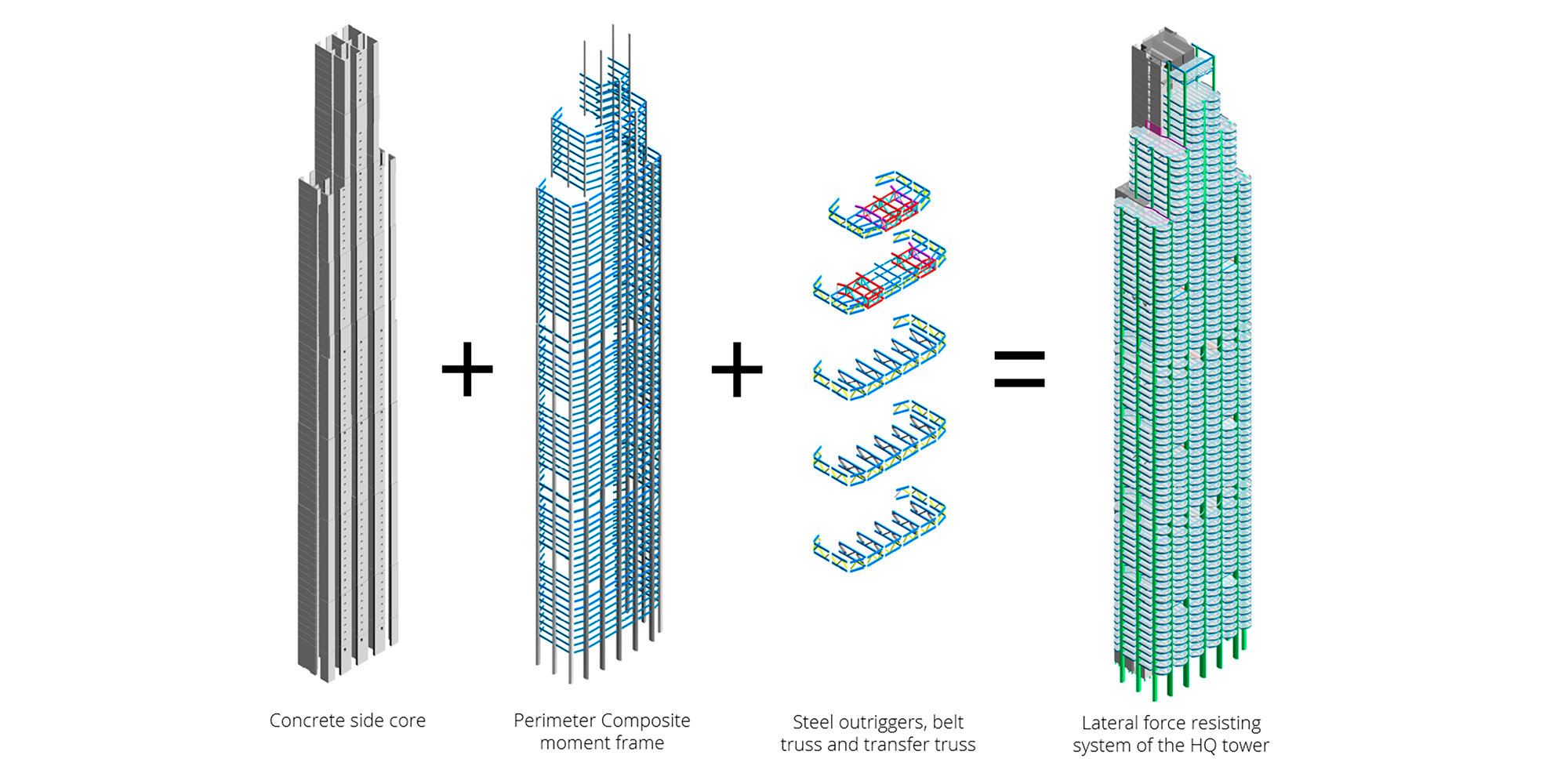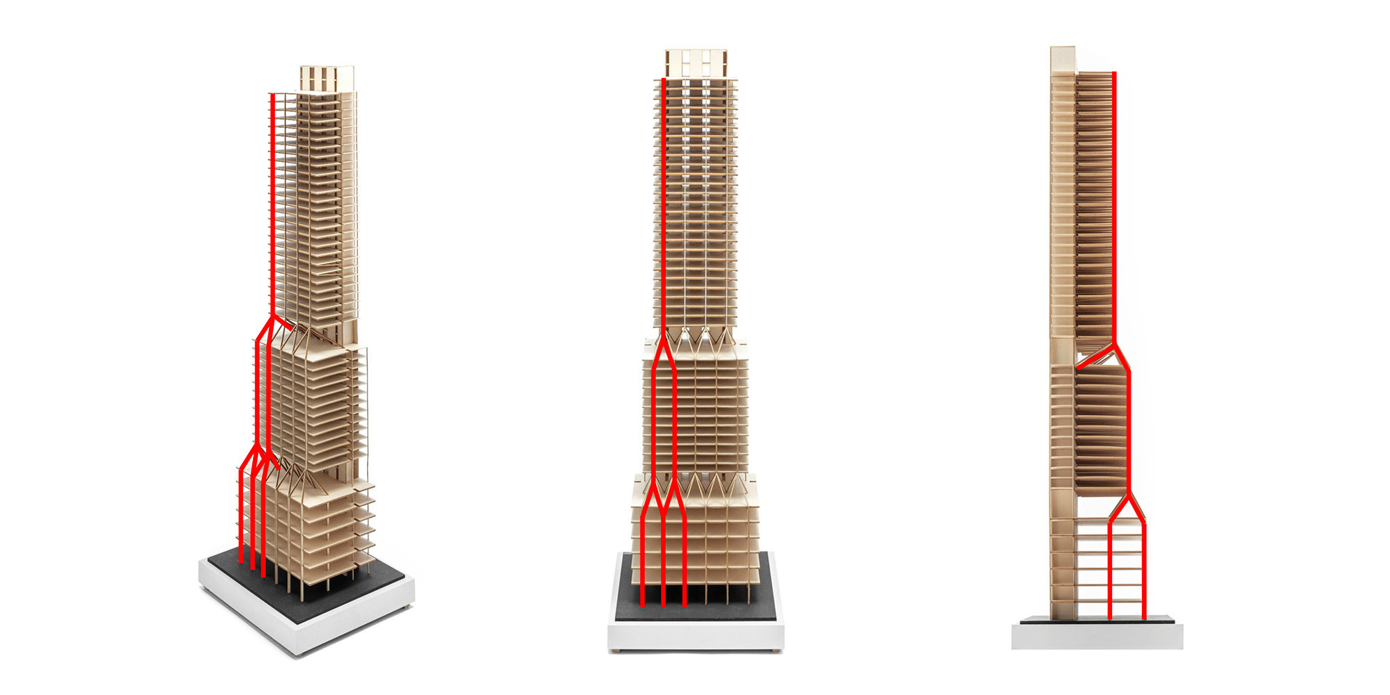 The resulting structure was conceived to be as minimal a response as possible to resist the vertical and lateral loads acting on the tower and where architecture and structure are completely aligned. The facade could be removed entirely and the skeleton revealed would be completely consistent with the way the building appears from the outside.