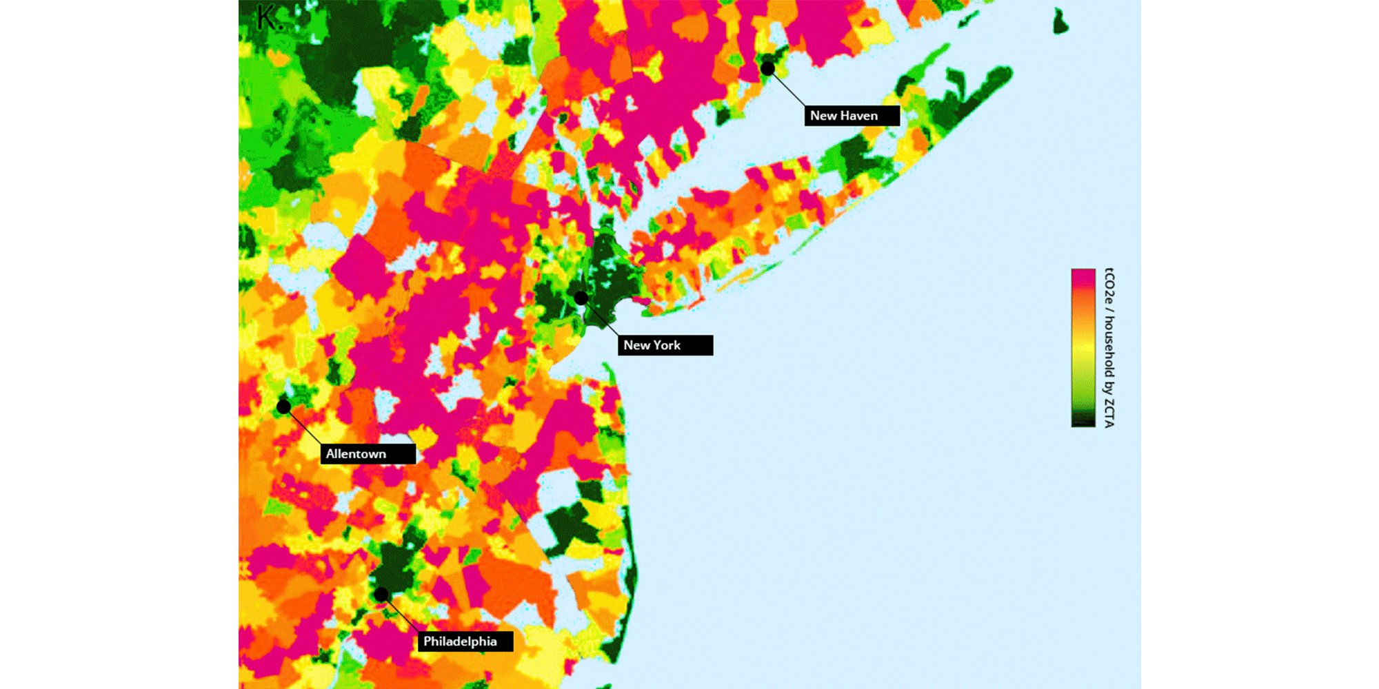 Map of household carbon footprints across zip codes in the eastern United States. ‘Spatial Distribution of U.S. Household Carbon Footprints Reveals Suburbanization Undermines Greenhouse Gas Benefits of Urban Population Density’, Christopher Jones and Daniel M. Kammen, Environmental Science & Technology 2014 48 (2), 895-902