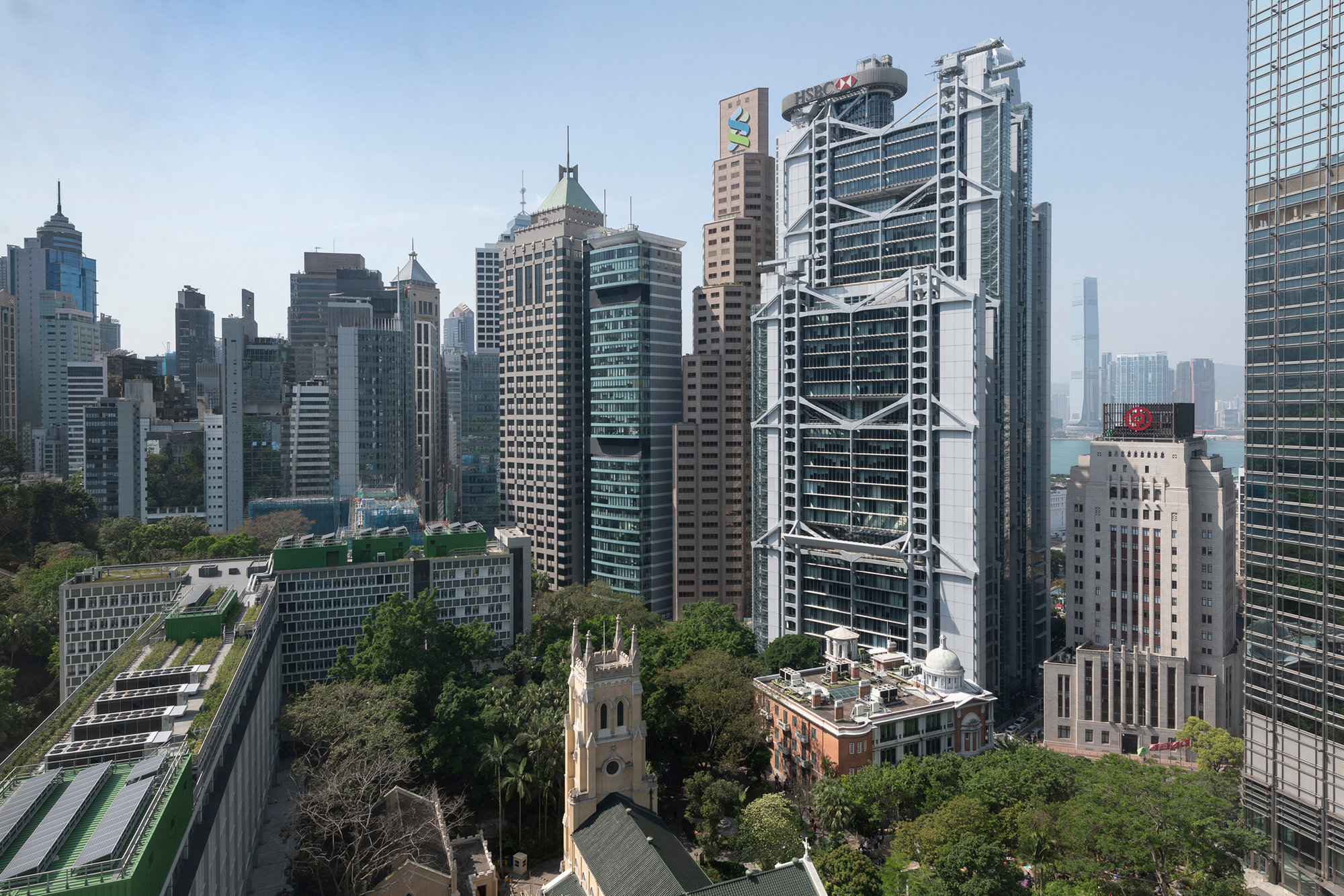 The north facade of the Hongkong and Shanghai Bank Headquarters in Hong Kong (1986). The Hongkong Bank was the first tower to challenge the central core concept that had persisted since the birth of the high-rise office building in the 1880s. By creating a suspension structure outside of the floor plates and redistributing the elevators, staircases, and bathrooms to the two narrow edges of the plan, it was possible to create uninterrupted, loft-like spaces throughout the building. © Nigel Young / Foster + Partners