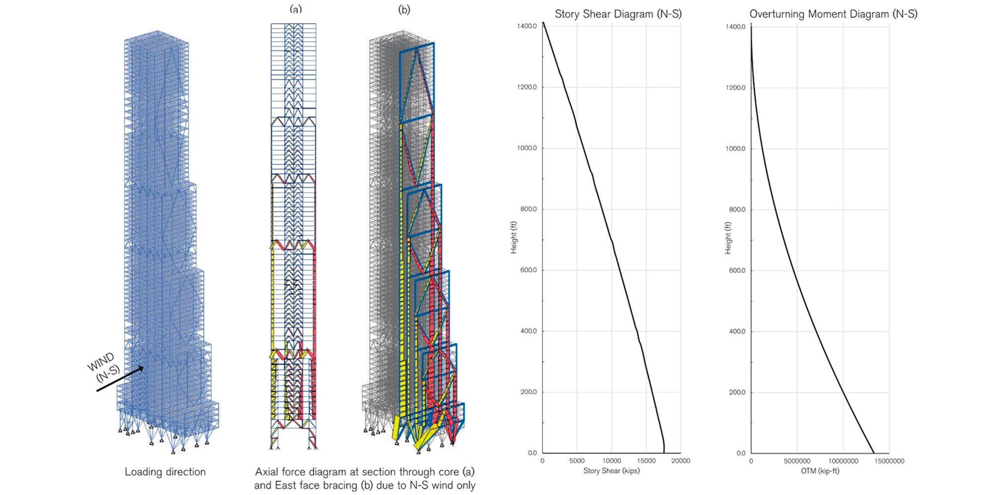 Analysis diagrams from the JP Morgan competition showing the behaviour of the structure under wind loads on the north or south façade. The central pair of diagrams show two views of the forces in the structural members – the wind load is resisted by a combination of the central cores linked to the outer columns by outriggers, visible in the left hand diagram, and the cross bracing on the east and west facades, visible in the right hand diagram. The graphs to the right show the horizontal shear force and overturning moment acting on the structure due to the wind loads, both increasing towards the base of the building.