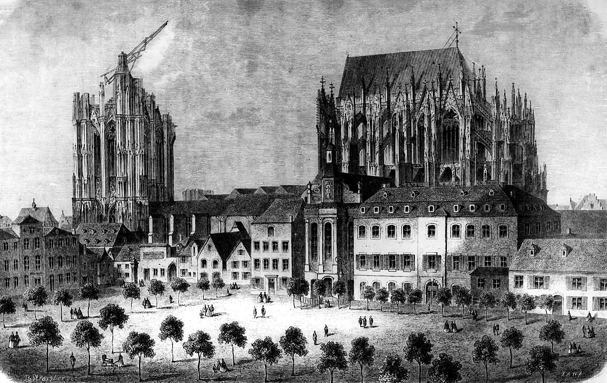 An illustration of the High Gothic Cologne Cathedral under construction and a photograph of the completed building from c.1880. Construction of the present cathedral began in the 13th century and continued for roughly 300 years, before stalling for another 300. Restoration work began in the 1820s using architectural drawings made in about 1300. All construction, including the 157-metre-tall twin towers, was completed by 1880. © INTERFOTO / Alamy Stock Photo
