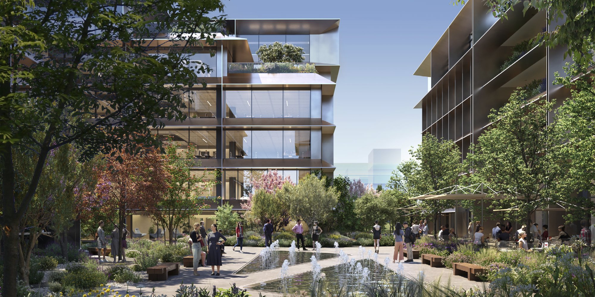 The modular elements of the building wrap around the perimeter of the site, creating a central courtyard that is the social heart of the development. The landscaped courtyard also acts as a lush green spine, connecting the east and west sides of the site. A large public park in the east encourages engagement with the scheme, while providing a space for employees to relax and socialise in. Existing olive trees, which are native to the region, have been nurtured or replanted to create a leafy, shaded oasis in the city.