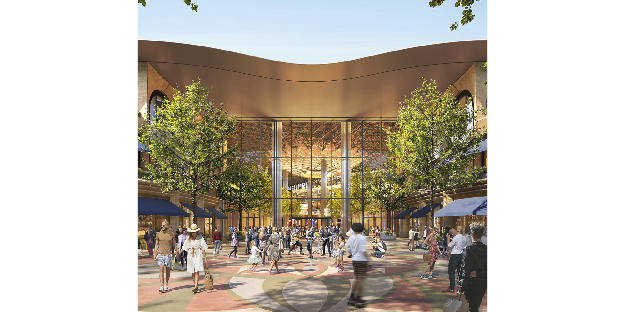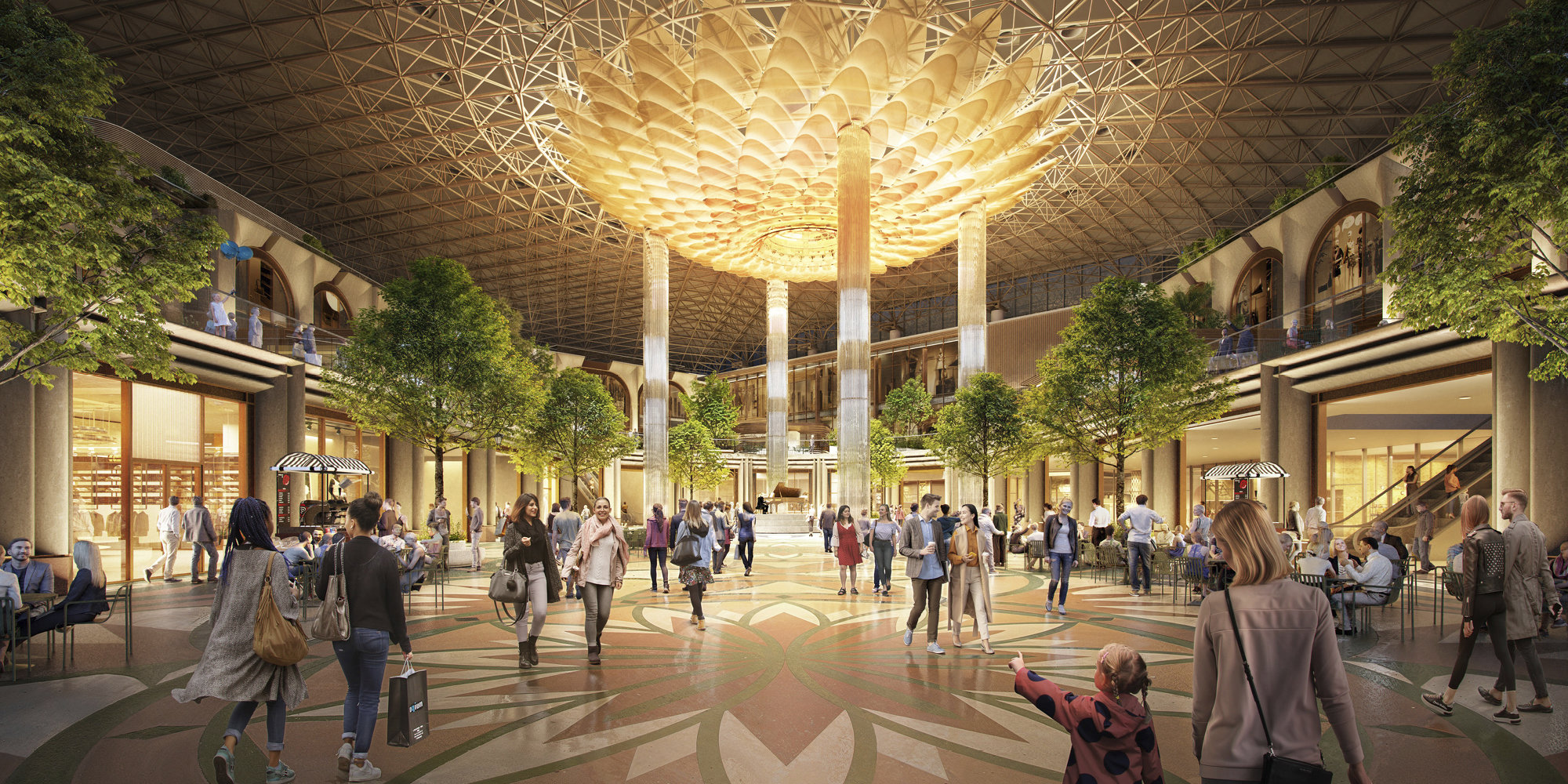 The practice’s design retains and enhances the existing fabric of Palas Mall, with the inclusion of a new indoor-outdoor market plaza, which extends from the building’s central atrium towards the palace and the park. The plaza and a new floor-to-ceiling glass façade will significantly improve the visual and spatial relationship between the mall and its surroundings. To emphasise this transformative move, the plaza’s stone floor is decorated with traditional local motifs and a sculptural glass lighting feature is displayed above. Greenery and café spaces flow between the building’s atrium and the park to enhance wellbeing.