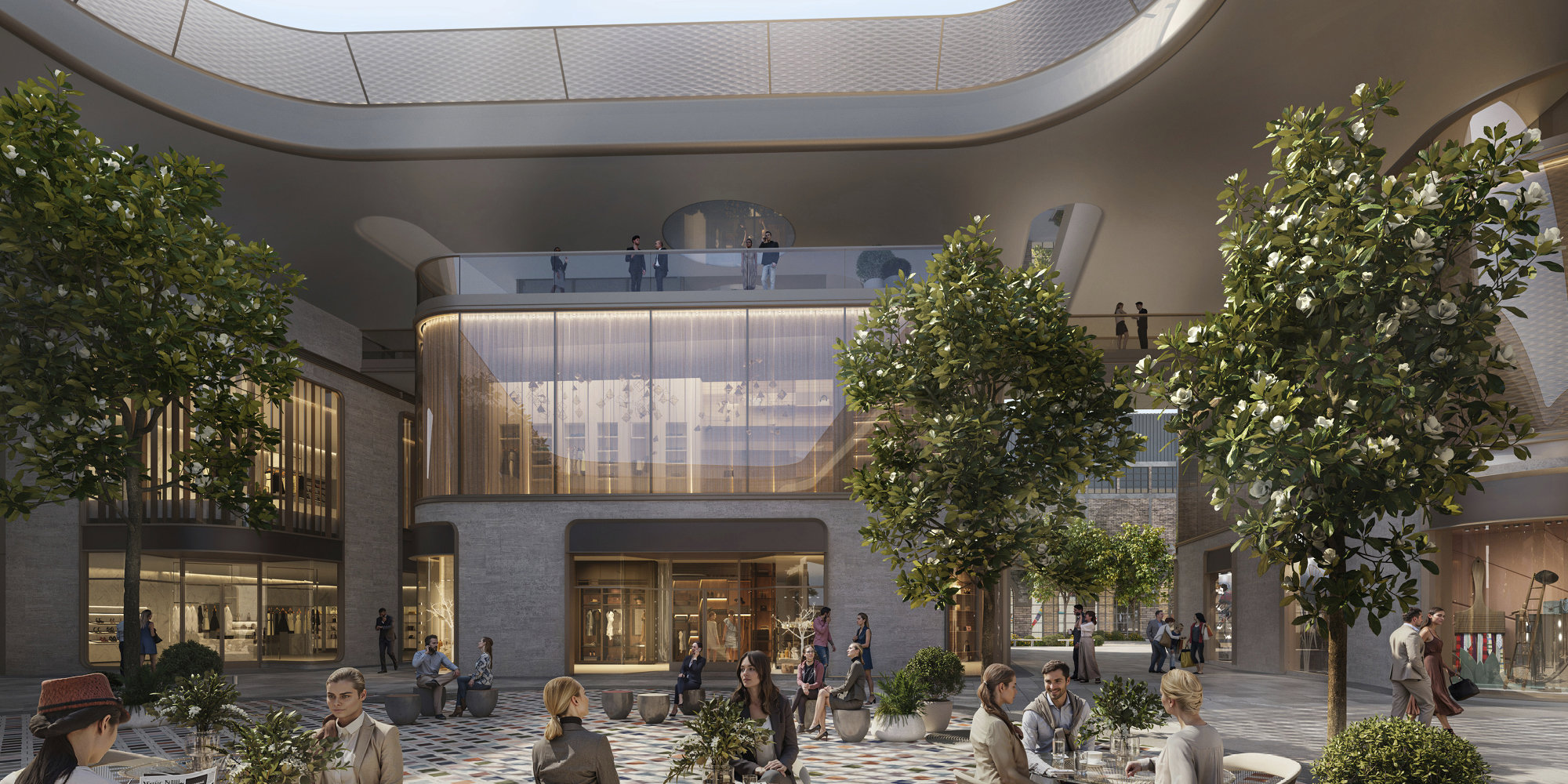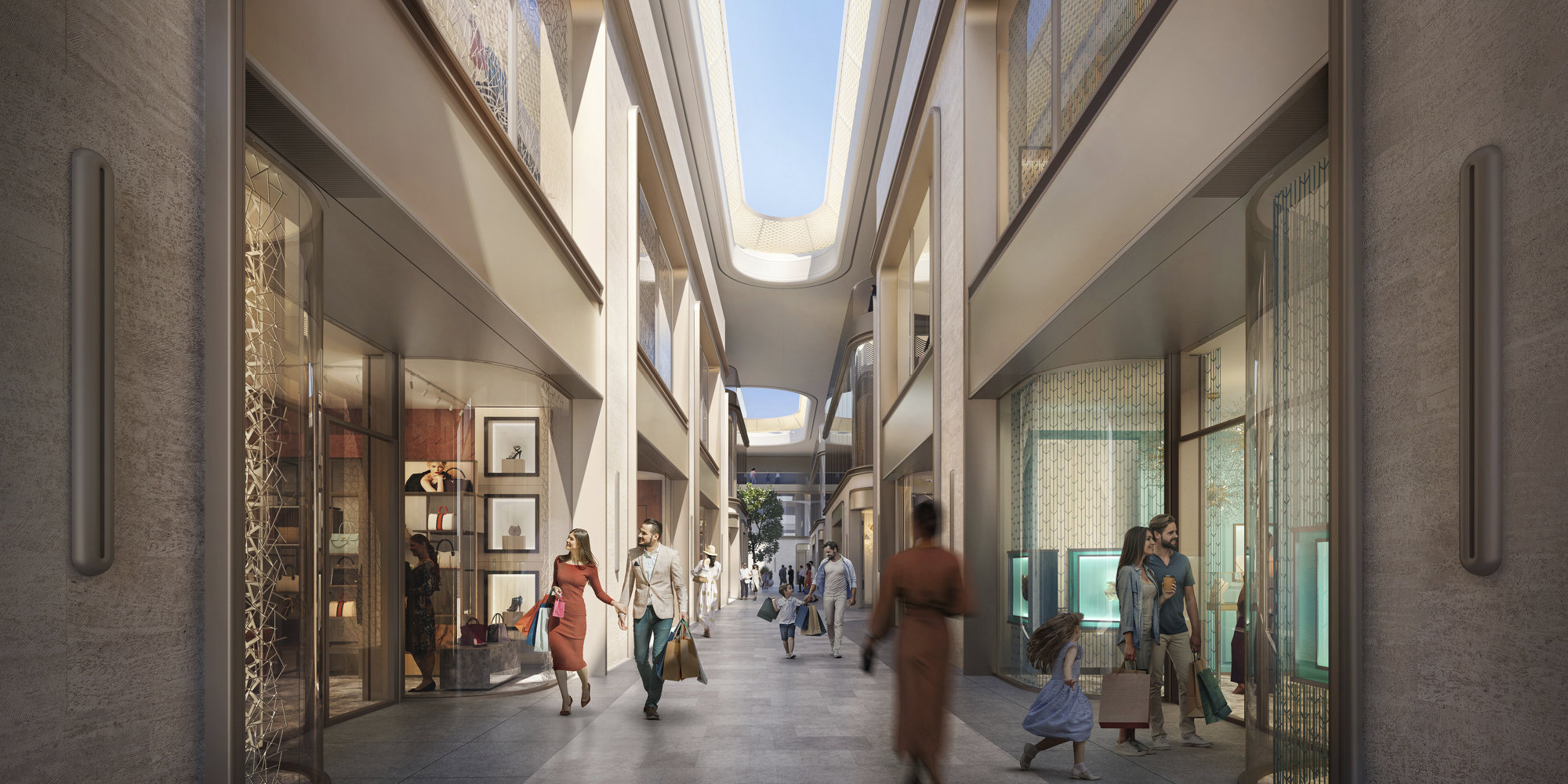 Designed to house the world’s most prestigious luxury brands, the plaza offers an exclusive retail experience that embodies artisanal craftsmanship and commitment to excellence. The plaza’s interconnected pavilions can be tailored for brands’ specific requirements – with cohesive yet adjustable storefronts and flexible interiors for long-term adaptability. The development is completely walkable – with a network of shaded streets between the pavilions. Covered terraces on the upper levels and a spectacular cantilevered restaurant offer panoramic views across the water.