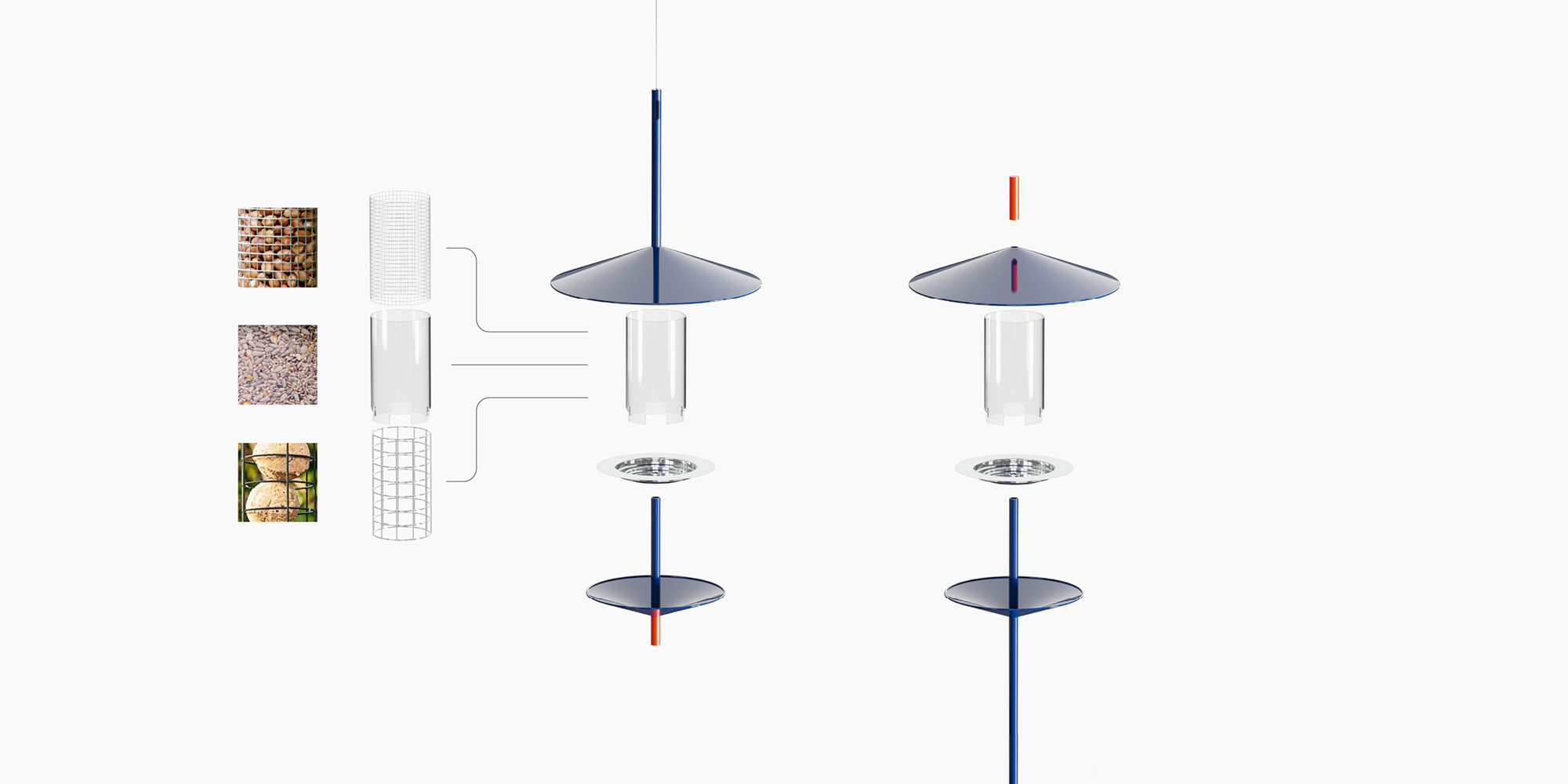 Ori was crafted through an iterative design process focused on aesthetics, functionality and purity. Composed of spun aluminium cones, stainless steel elements and threaded aluminium tubes, its vertical axis locks all components together ensuring stability and ease of maintenance. Responding to seasonal changes and bird species, the swapable feeding tube and cages allow for a variety of food types, including seeds, nuts and suet. Ori’s design simplifies cleaning, reducing the risk of disease transmission among birds. The bird feeder is designed to protect the feed from the rain while allowing for aeration through a perforated tray. The water bath features an overflow drainage system that directs excess water through a central tube to the ground.