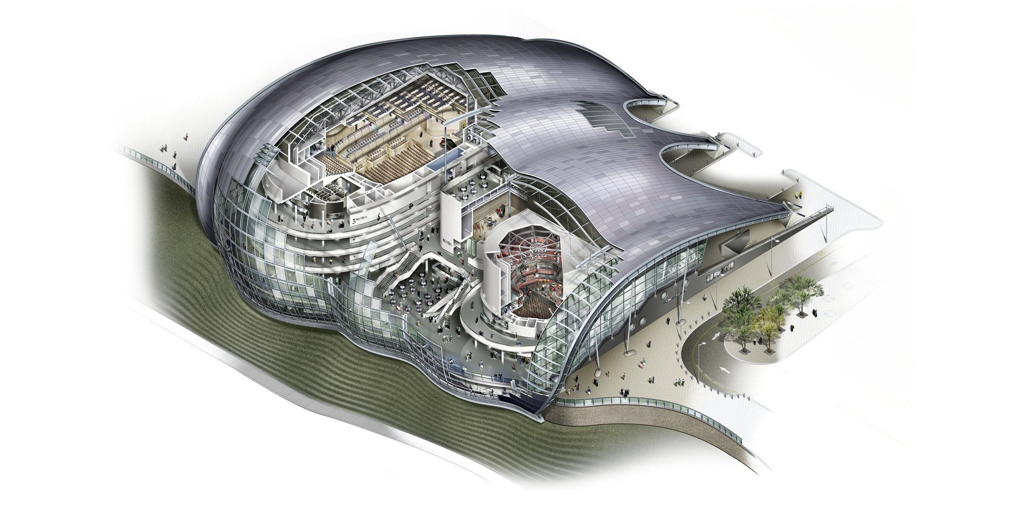 Foster + Partners and Arup Acoustics are appointed by Gateshead Council after an international selection process. The brief is to create a centre for musical performance and education, with acoustically excellent auditoria and unparalleled teaching facilities; a major public building that is fully inclusive and accessible for all; and a centrepiece for the regenerated Gateshead Quays area.