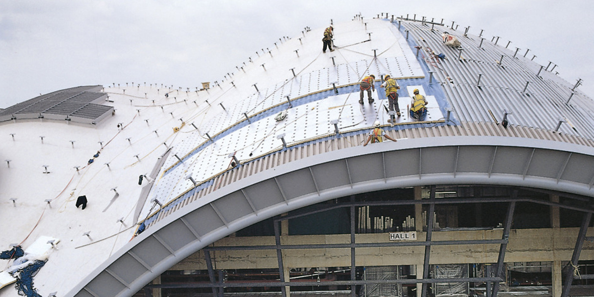 Engineered by Buro Happold – and constructed by Waagner Biro – the roof is an entirely independent structure supported by four structural steel arches spanning 80 metres from north to south with a secondary structure of single radii steel members. The 720-ton steel grid-shell is covered with 3000 linen finish stainless steel and 280 glass cladding panels.