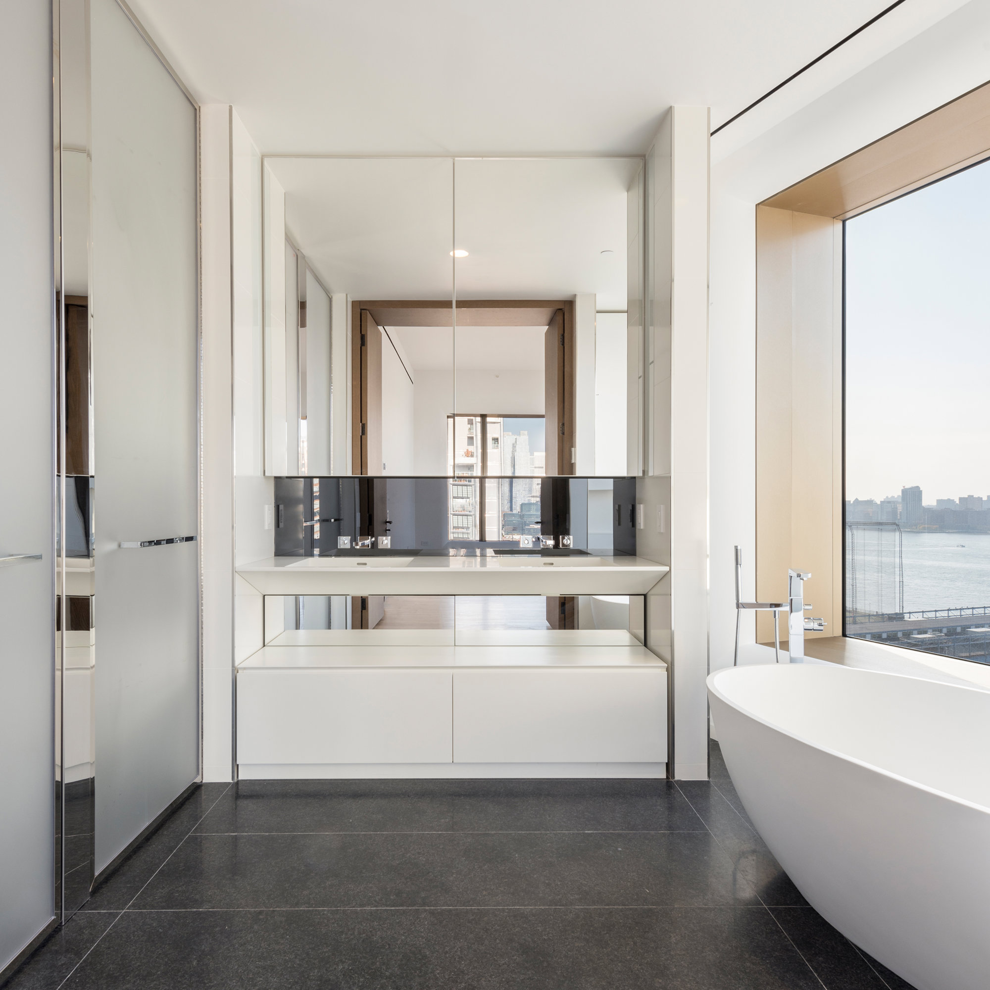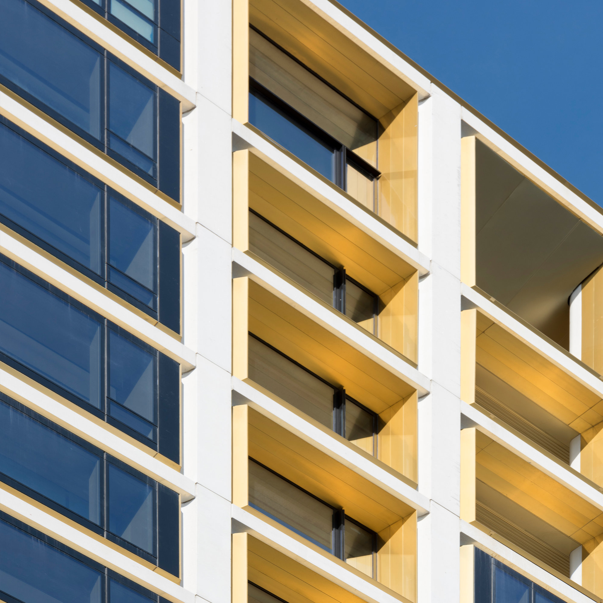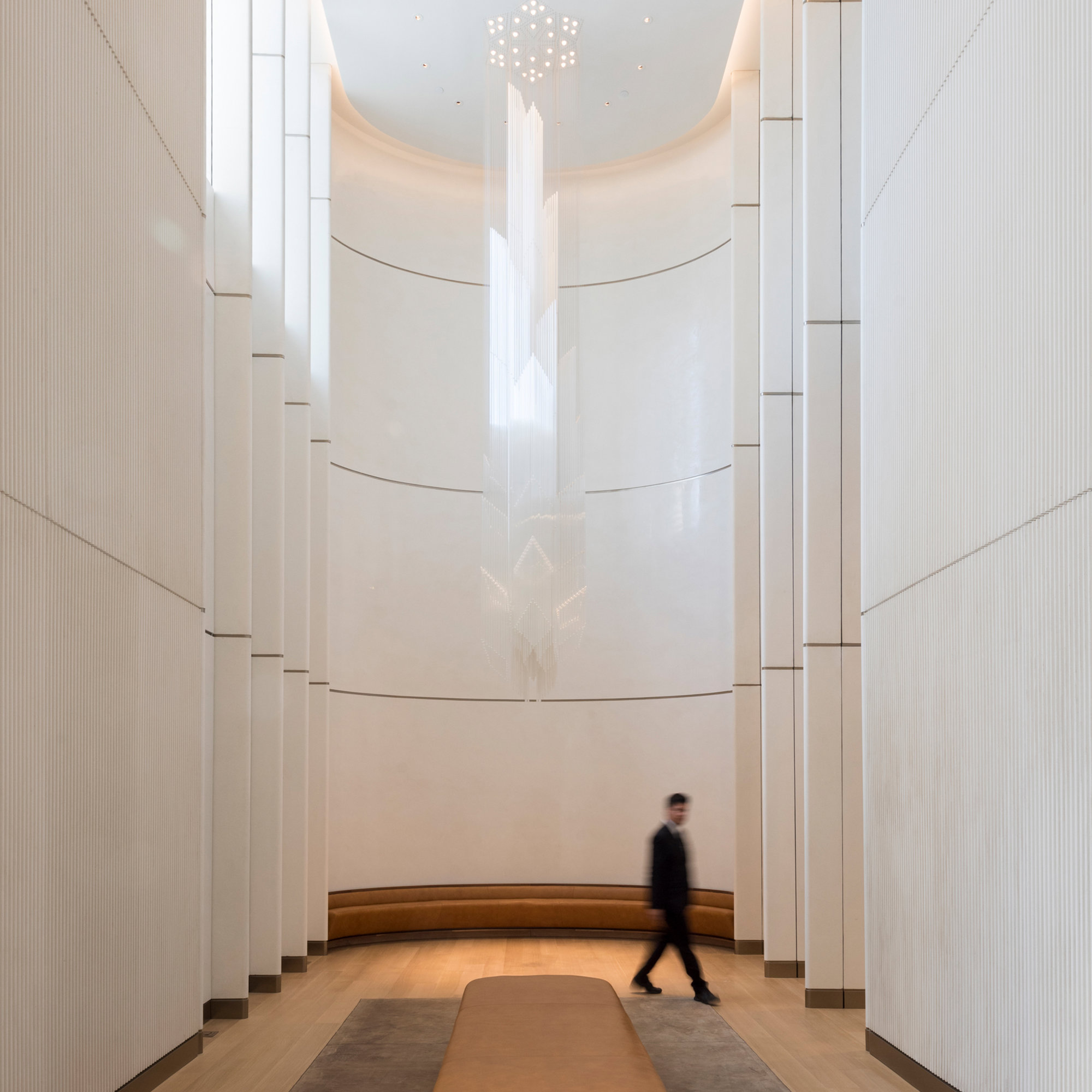 The tower stands on a plinth, intersected by a series of deep recesses, which signal the entrance lobby and define a new gallery space in the corner of the building. Externally, the structure is expressed as a grid of white precast concrete, inset with bronze coloured detailing, and a core of triple height glazed panels. The tower comprises 44 spacious residences, most with three or four bedrooms, high ceilings and wide panoramic windows. Drawing inspiration from the grandeur of the city’s historic apartments, the interior concept combines the warmth of traditional family living with privacy, comfort and contemporary luxury. The building is crowned by three penthouses, each with a sequence of grand rooms for entertaining, a library and club room, as well as large private terraces and sheltered loggia – the uppermost penthouse also leads to a private rooftop pool.
