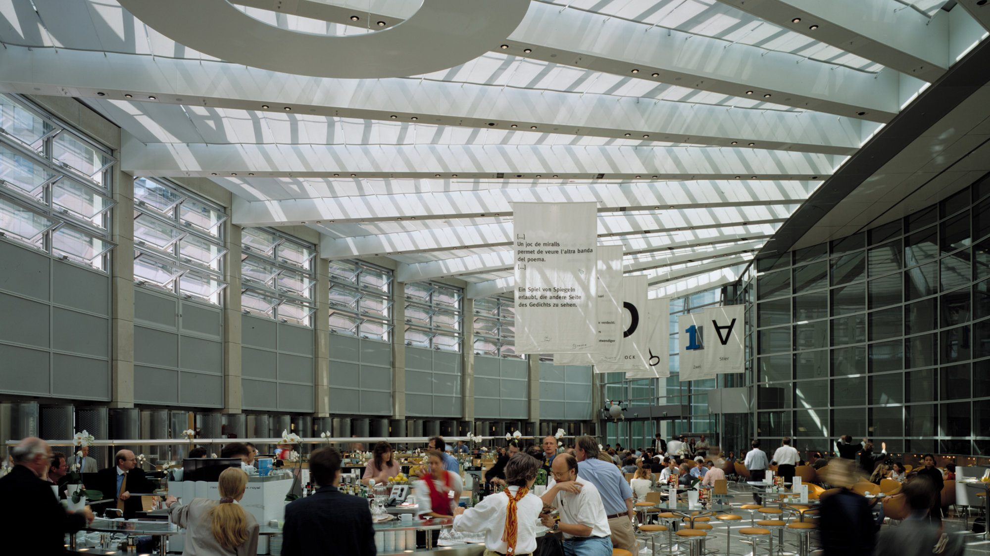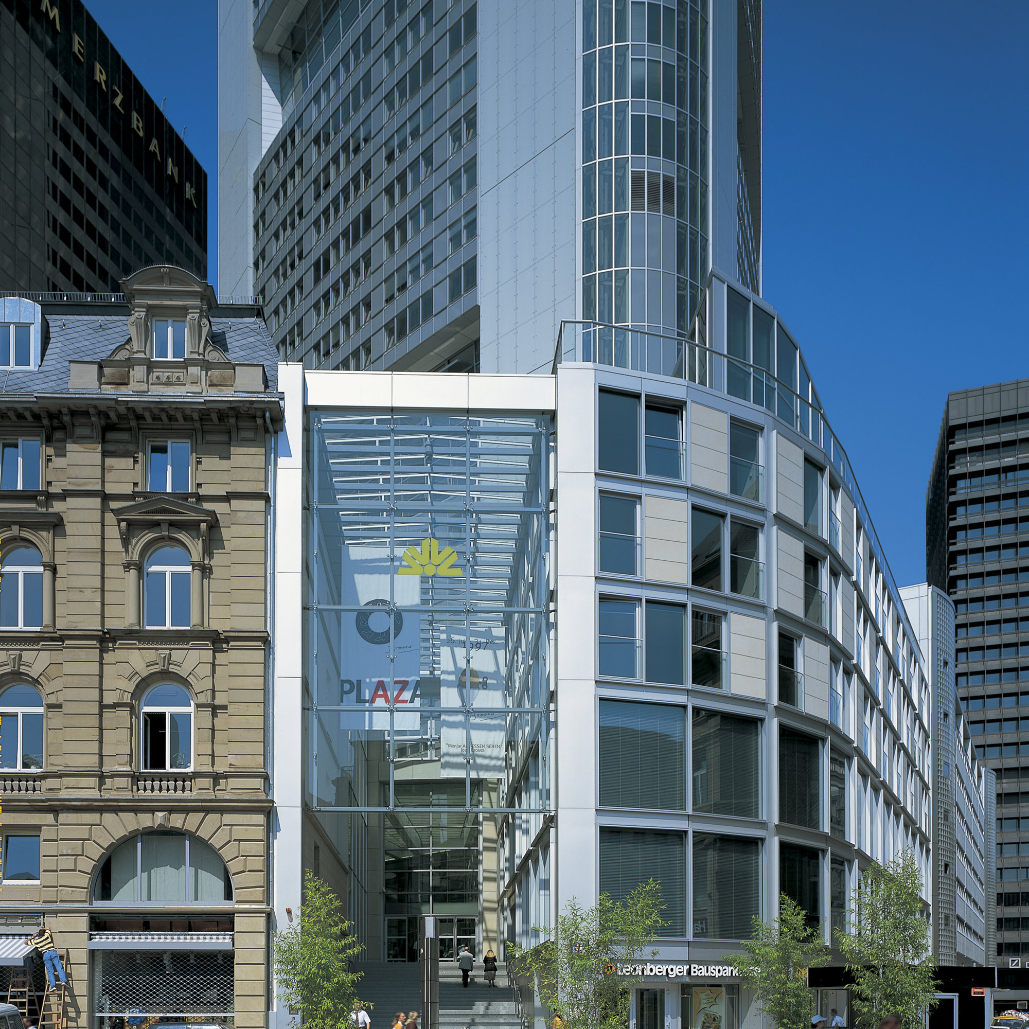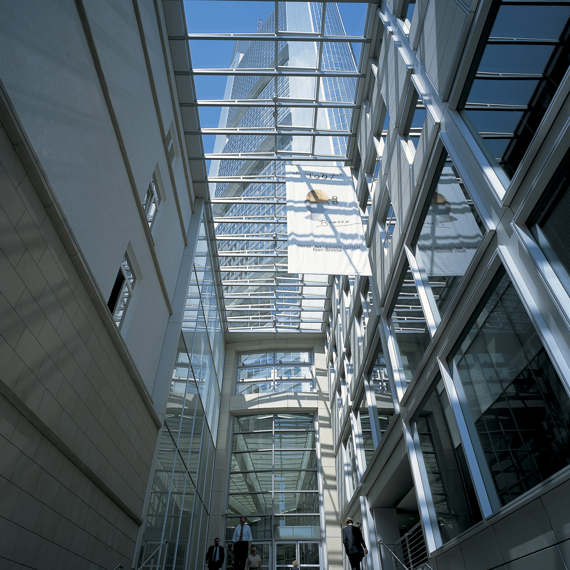 The tower has a distinctive presence on the Frankfurt skyline but is also anchored into the lower-scale city fabric, through the restoration and sensitive rebuilding of the perimeter structures to reinforce the original scale of the block. These buildings provide shops, car parking, apartments and a banking hall, and help to forge links between the Commerzbank and the broader community. At the heart of the scheme is a public galleria. With its restaurants, cafés and spaces for social and cultural events, it has become a popular pedestrian thoroughfare. Interestingly, on the day the Commerzbank opened, the Financial Times adopted it as the symbol of Frankfurt, just as it features the Houses of Parliament and the Eiffel Tower as symbols of London and Paris.