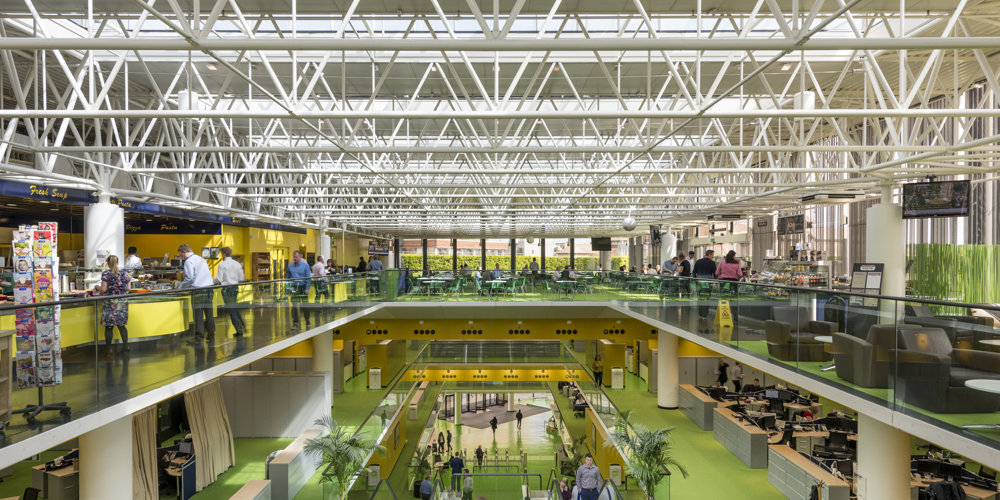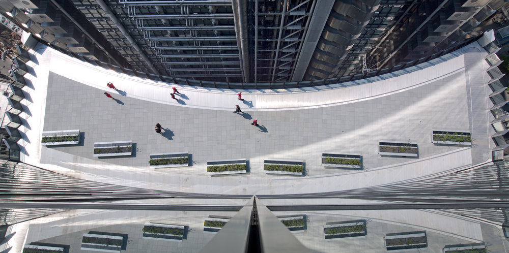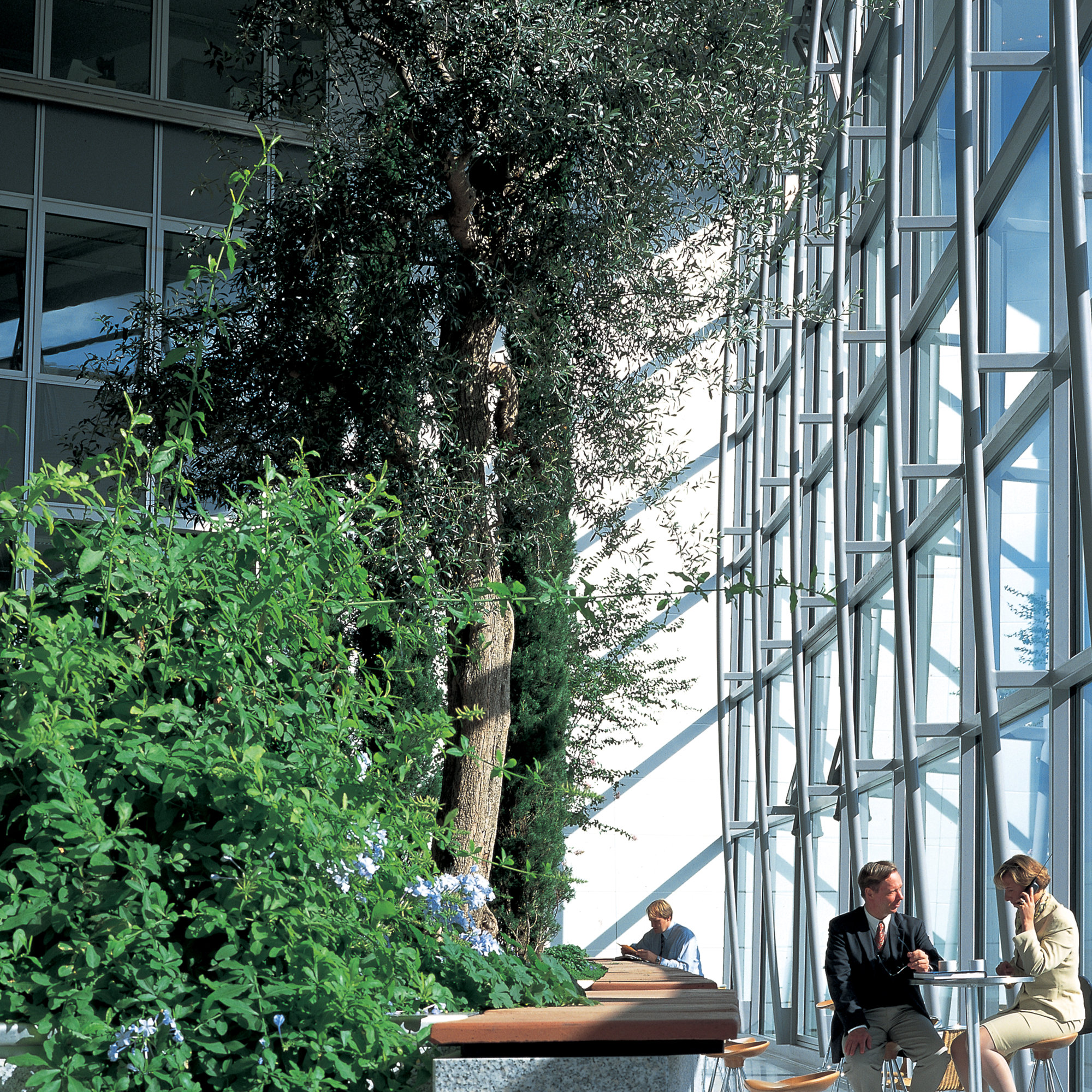 The plan of the building is triangular, comprising three ‘petals’ − the office floors − and a ‘stem’ formed by a full-height central atrium. Winter gardens spiral up around the atrium to become the visual and social focus for four-storey office clusters. From the outside these gardens in the sky give the building a sense of transparency and lightness. Socially, they form focal points for village-like clusters of offices, providing places to meet colleagues or relax during breaks. Environmentally, they bring light and fresh air into the central atrium, which acts as a natural ventilation chimney for the inward-facing offices. Depending on each garden’s orientation, planting is from one of three regions: North America, Asia or the Mediterranean.