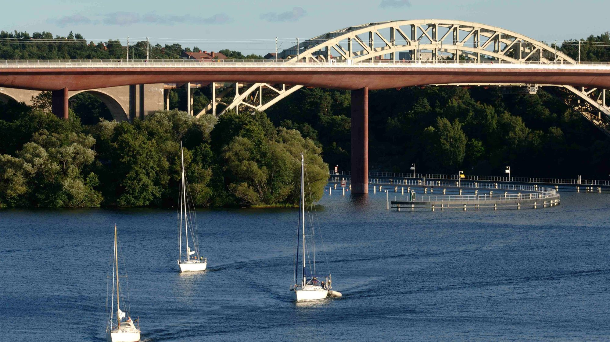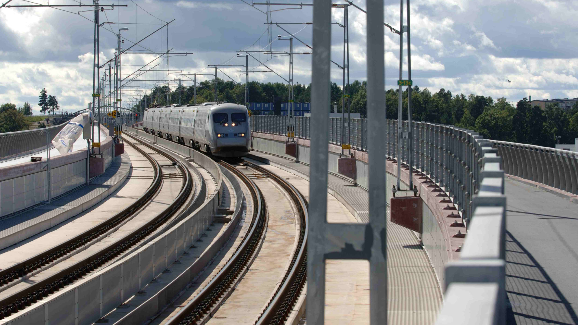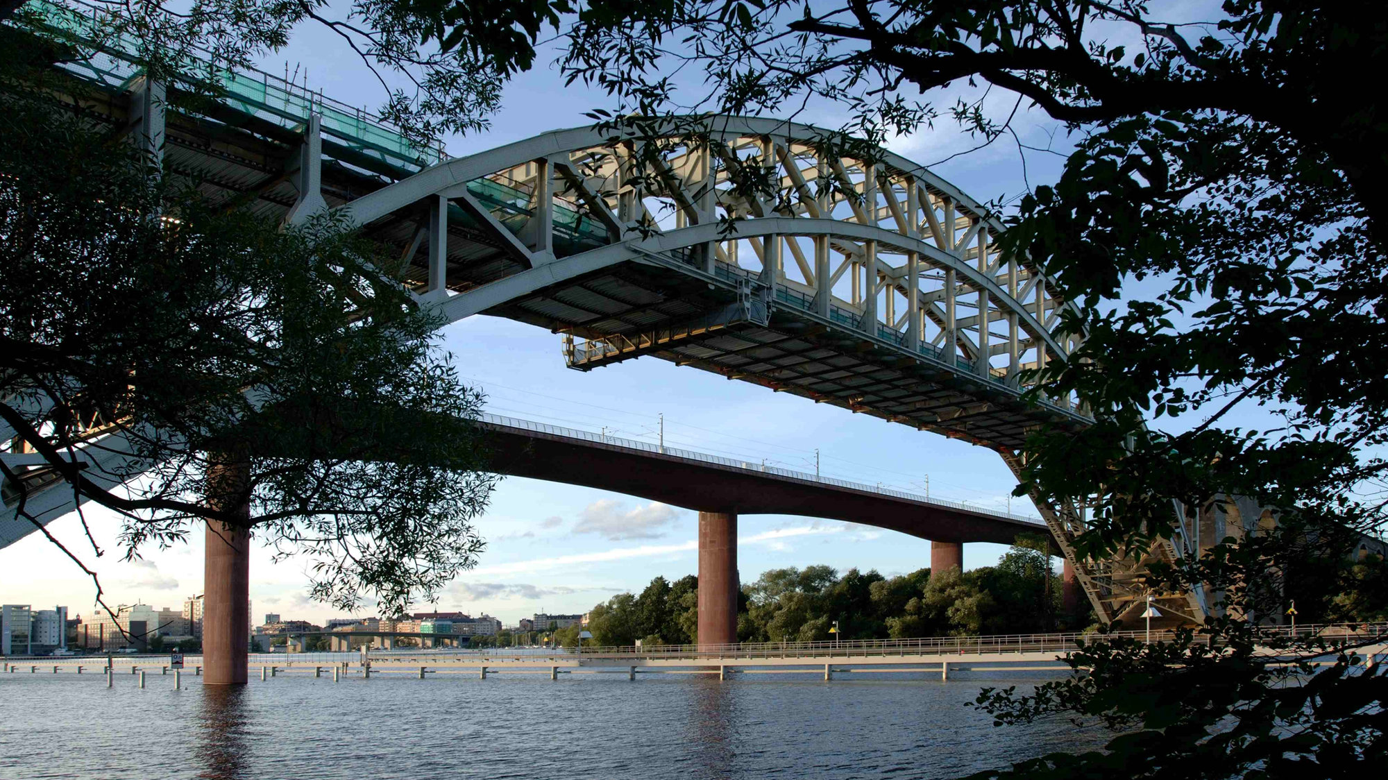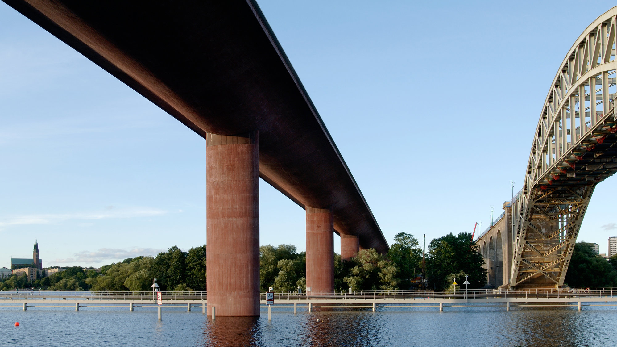 Following an international competition in 1994, Foster + Partners, together with Ove Arup, were selected to design the new Arsta Bridge, which would incorporate two new train tracks, a pedestrian and cycle way, and a maintenance access road. On plan, the bridge incorporates a curve, and the rounded soffit responds to the sequence of bending forces as the bridge deck sweeps over the ten pier supports, which are elliptical in section. This calming geometry is a response to the tranquillity of the Arstaviken bay, and the bridge appears to recede into the setting.