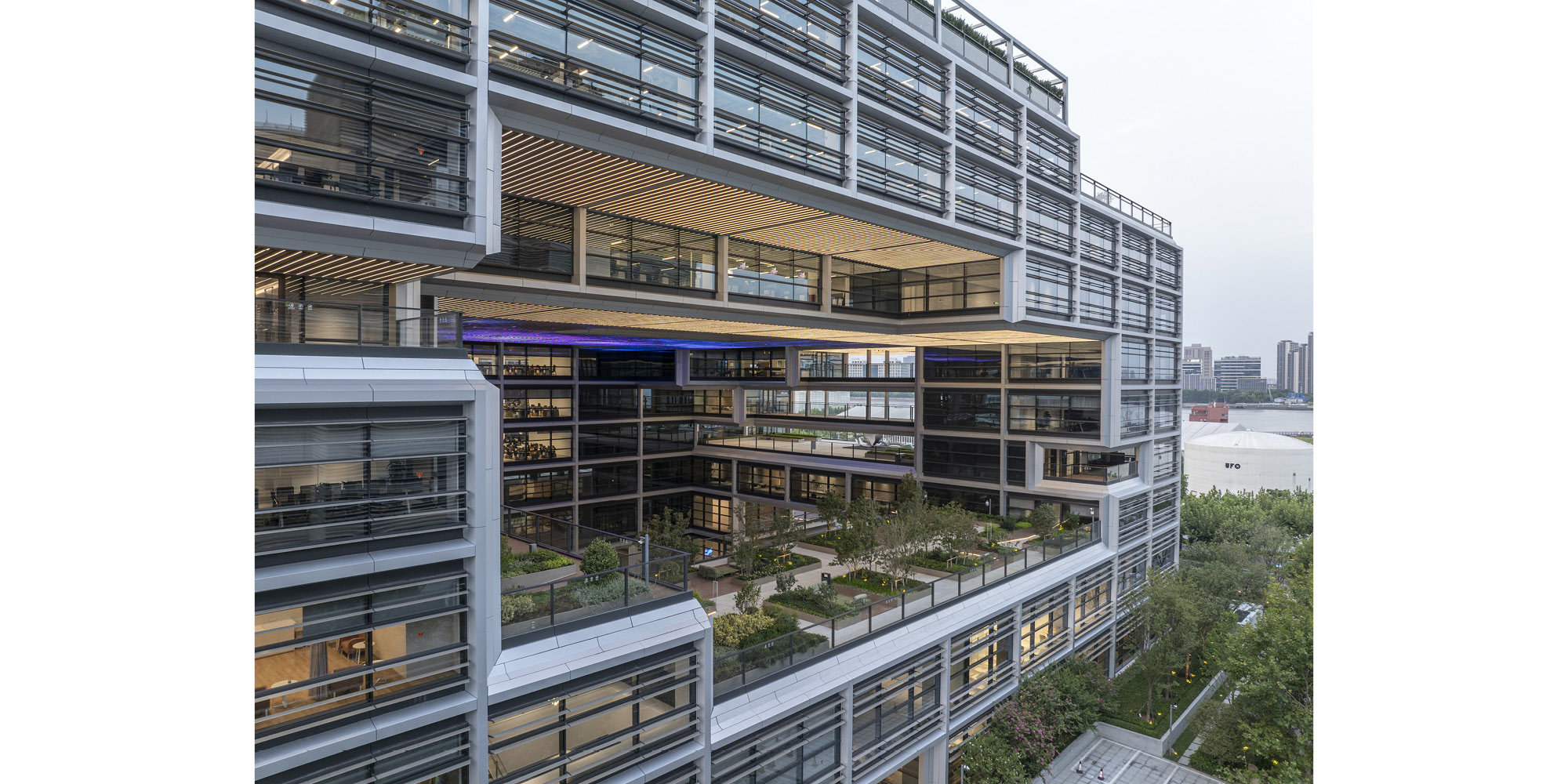 Health and wellbeing are cornerstones of the project, with vast green outdoor terraces – where employees can take in spectacular views of the Huangpu River and Pudong CBD – and the central public space encouraging connections with the outside world. All workspaces have operable windows and can be naturally ventilated, creating a healthy and productive working environment.
