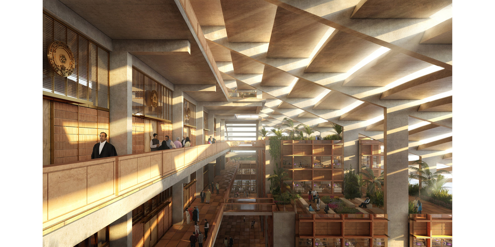 The high court complex is located off the central axis, with its stepped roof form inspired by India’s ancient stupas. The deep overhangs of the roof provide shade while also allowing the building to be naturally ventilated. Influenced by the traditional temple arrangement, the plan of the building is formed of alternating concentric layers of rooms and circulation spaces. The most publicly accessible parts, the administrative offices and the lower courts, are located on the outer edges of the building, while the inner areas are reserved for the Chief Justice’s court and private chambers. The building has a courtyard and a roof garden, that allows the greenery to penetrate the interior spaces.