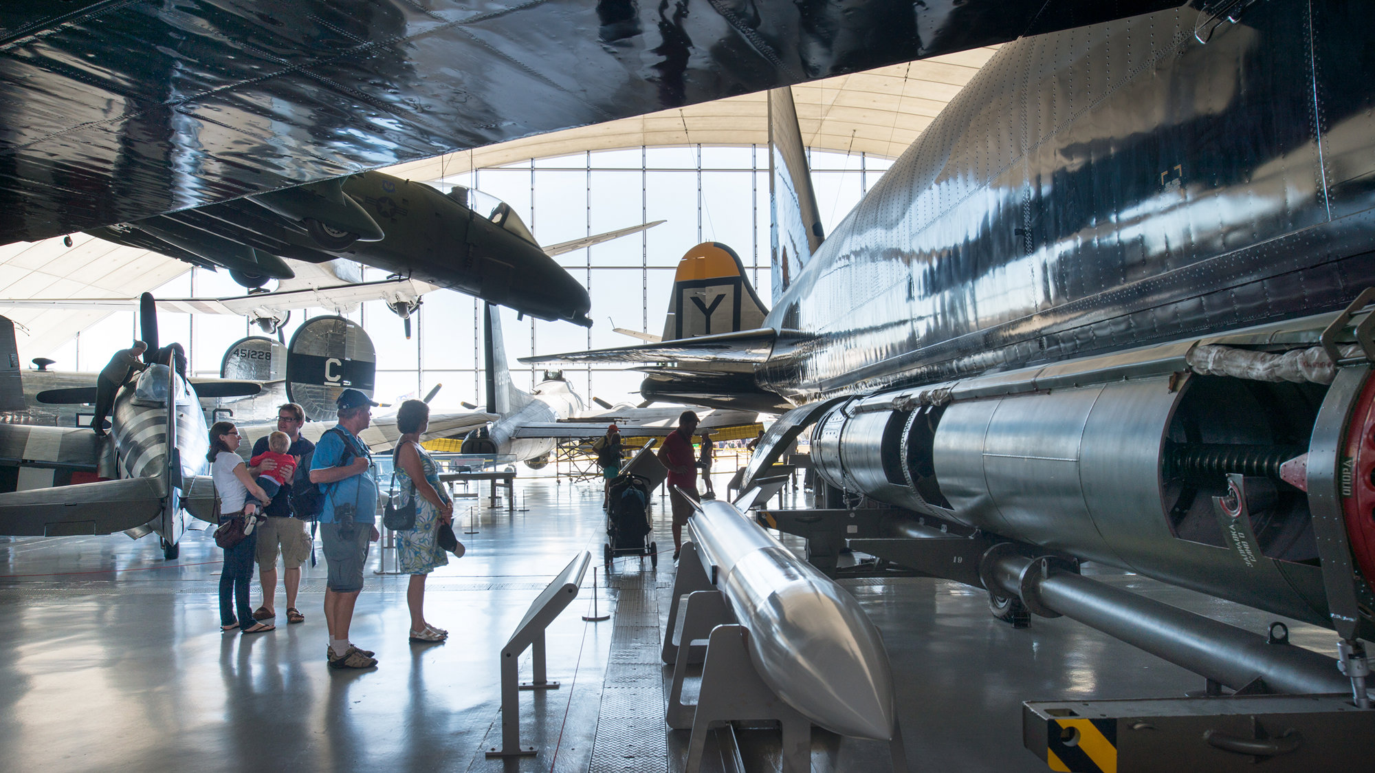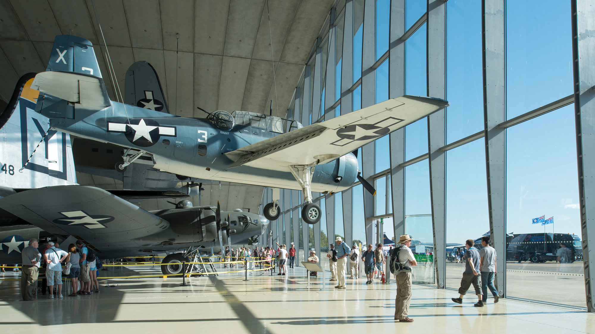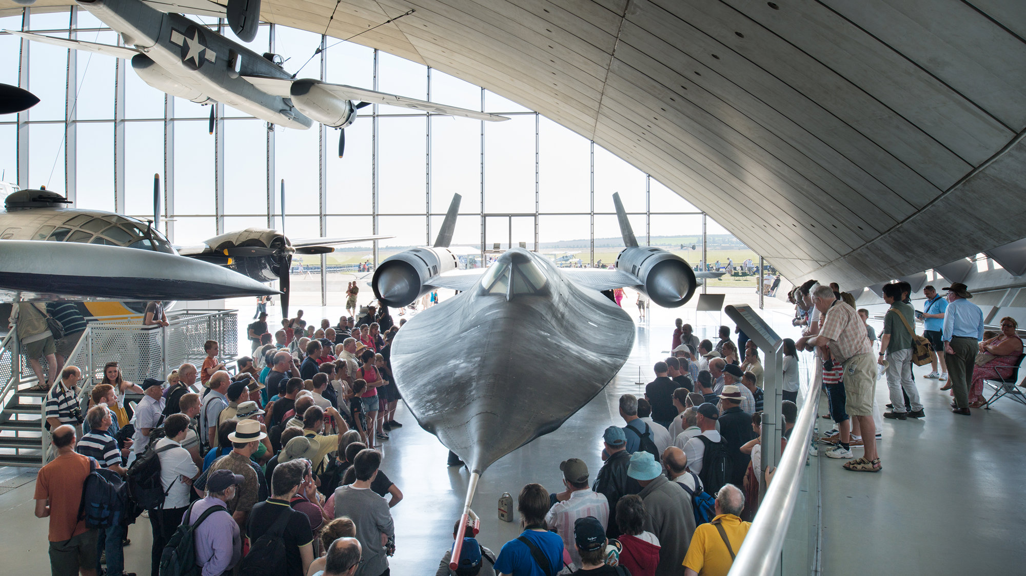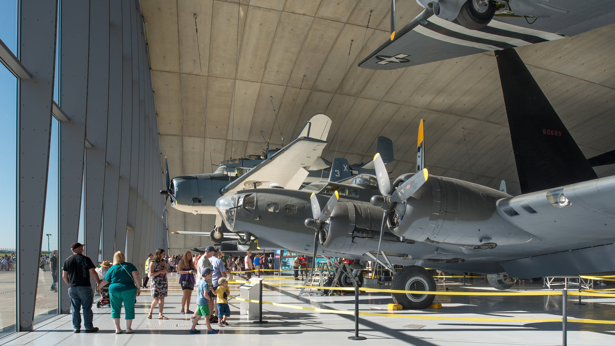 The brief for the Air Museum was to provide a permanent home for the B-52 and twenty other aircraft dating from the First World War to the Gulf War and to commemorate the role of the US Air Force in the Second World War and the thousands of airmen who lost their lives. There was also a desire for the Museum to highlight the take-offs and landings during air shows and create a window on to the runway. The dimensions of the B-52 (a 61-metre wingspan and 16-metre-high tail fin) established the building's height and width, and provided the principle axis through which the Museum is entered.