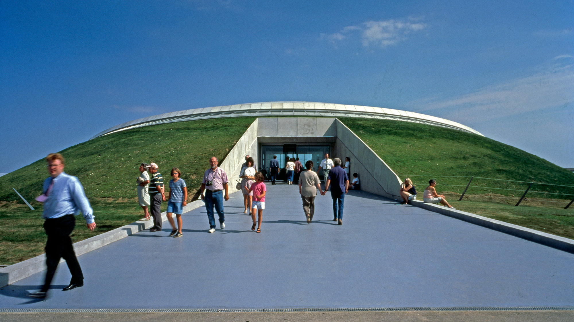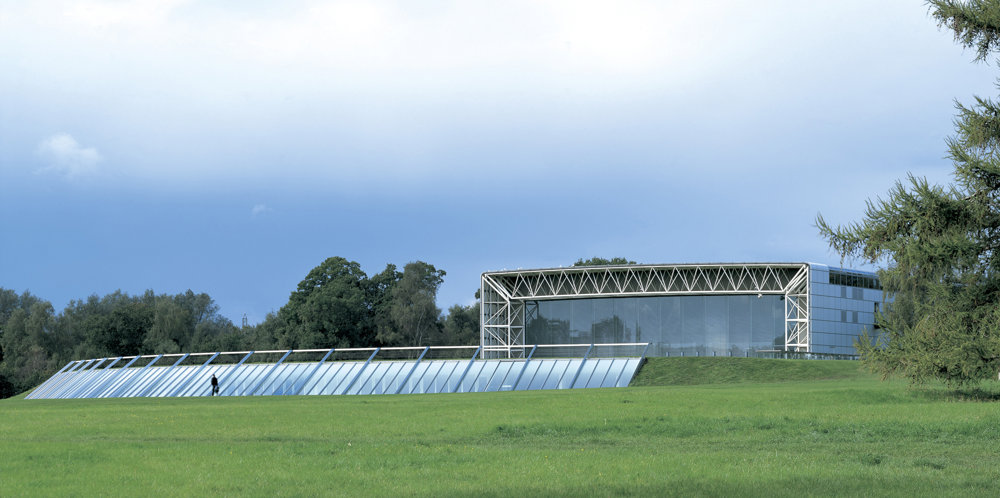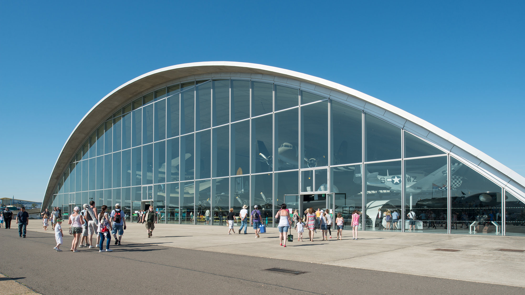 The building's drama comes from the powerful arc of the roof − engineered to support suspended aircraft − and the sweep of the glazed wall overlooking the runway. A continuous strip of glazing around the base of the vault washes the interior in daylight. The result is a light and open space, despite the fact that the structure is partly dug into the ground, a formal device that has been compared to the Royal Air Force's 'blister hangars', which were designed to be invisible from the air. In 1998 the Museum won the RIBA Stirling Prize. The jury wrote: 'The success of this project lies in the resonance between the elegant engineered form of the building and the technically driven shapes of the aeroplanes. The building itself sustains the fascination of these objects.'