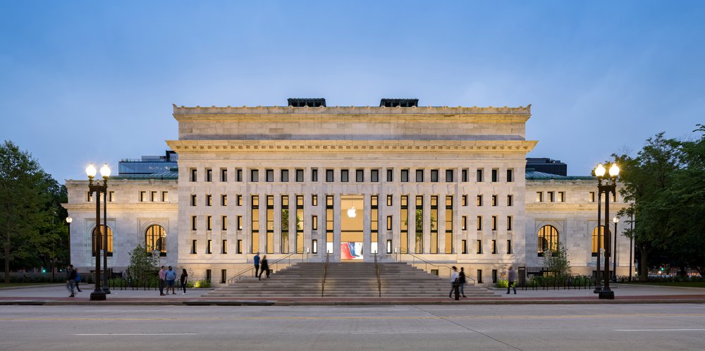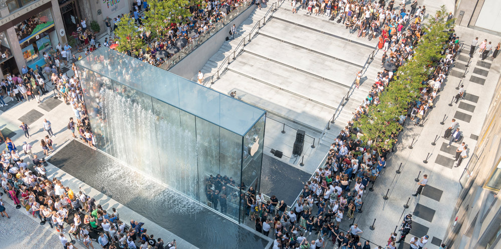 Inside, a sweeping flight of steps form a generous amphitheater, looking onto the Forum screen. Linking the internal entrance to the plaza below, the steps form the social heart of the store. They have leather seating and integrated charging stations where people can watch and experience Apple’s varied program of talks and Apple Music events and have their appointments with Apple Geniuses, all within a naturally lit and calm environment.