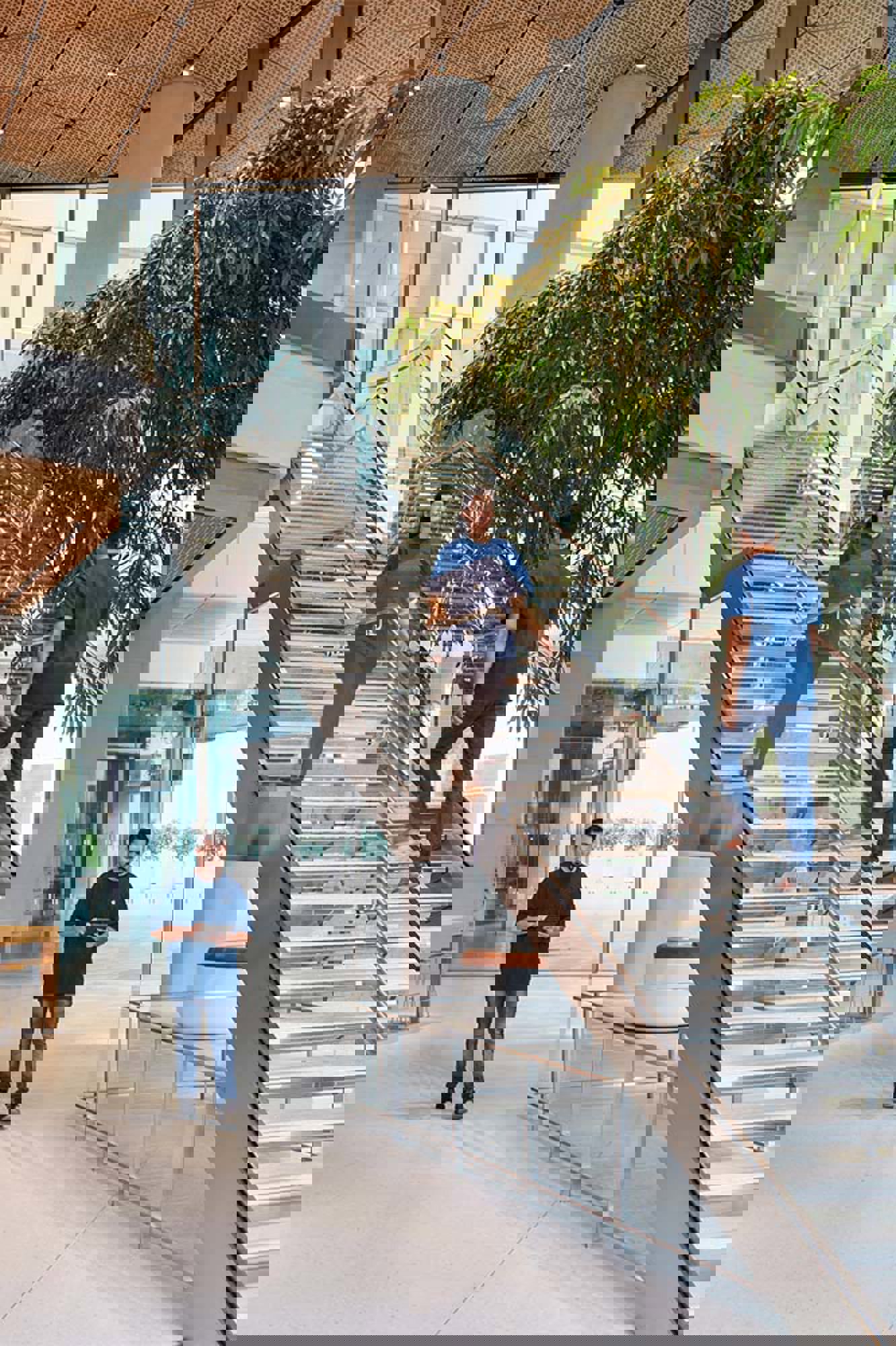 A striking staircase, made of stainless steel and two 14-meter-long glass balustrades, creates a delicate connection between the ground level and the cantilevered mezzanine. From the upper level, visitors have a spectacular view of the ground floor and the landscaped public realm.