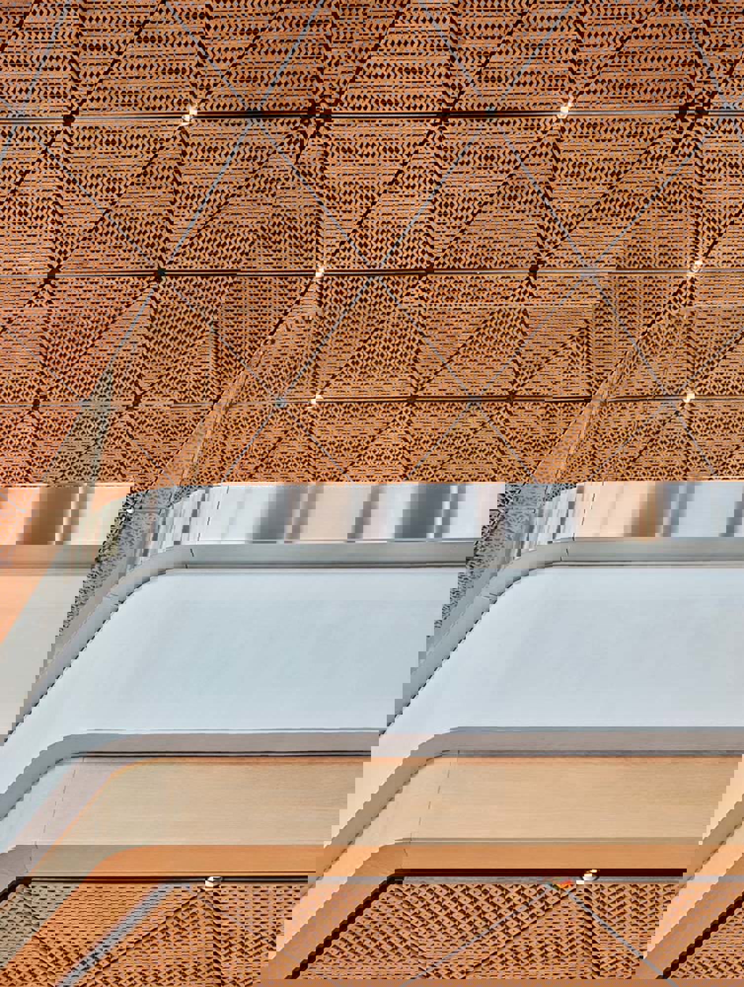 The elaborate ceiling is made up of a triangular grid of 450,000 individual timber elements, reflecting the unique geometry of the store. Each of the 1,000 ceiling tiles is assembled using 400 pieces of sustainably sourced oak timber arranged in a lattice woven pattern, inspired by the work of cane and ratan weavers found in Mumbai.