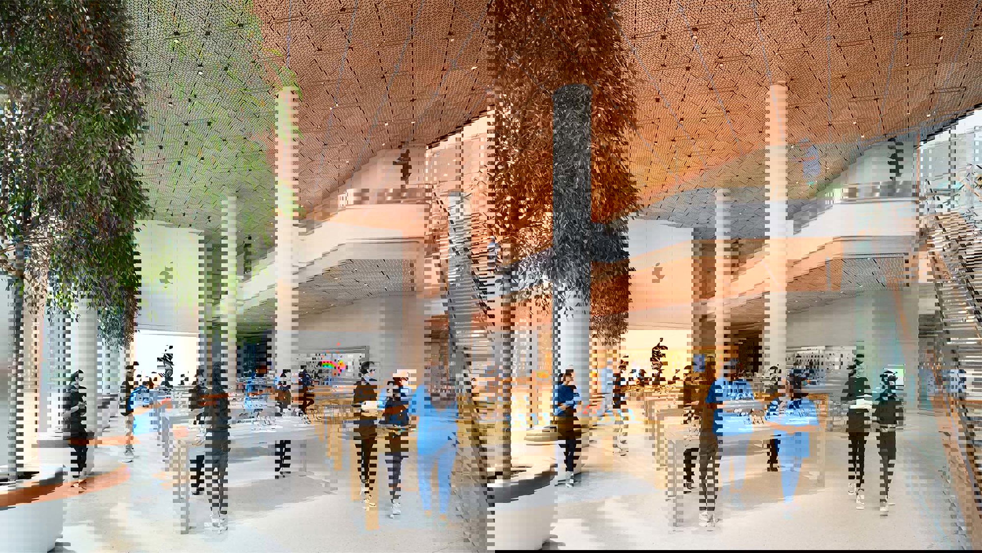 The store is a symbiosis of Apple’s unique design approach with finely crafted elements and locally sourced materials. The sense of continuity between the interior and exterior spaces is emphasised by a hand-crafted timber ceiling that extends beyond the glass façade to the underside of the exterior canopy.