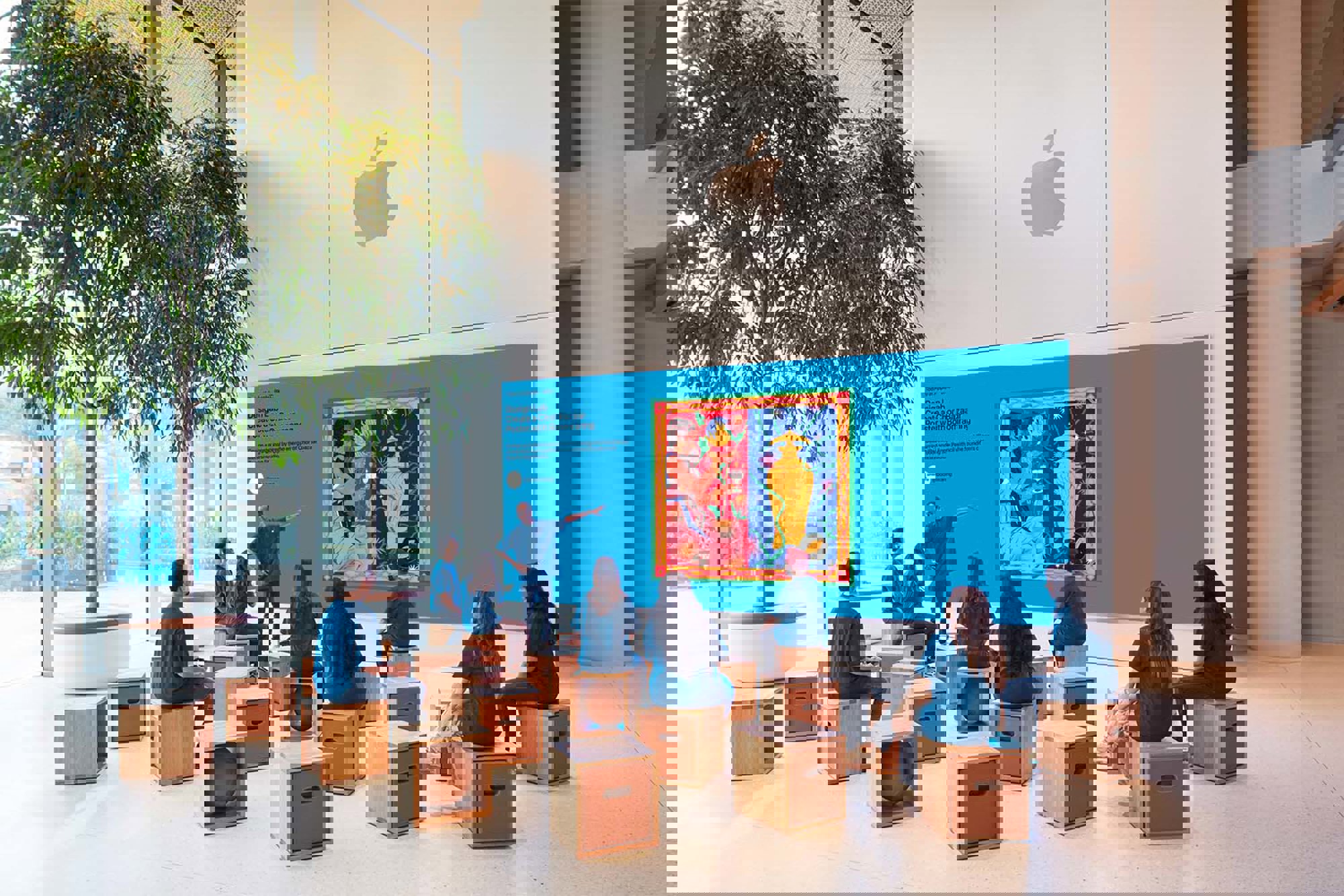 At ground level, display tables and avenues feature Apple’s wide range of incredible products. The Forum hosts ‘Today at Apple’ and acts as a learning and event space with a large video wall. Framed by a colonnade the visitor’s eye is naturally drawn towards the striking feature wall, which is wrapped in a dazzling white acoustic fabric.