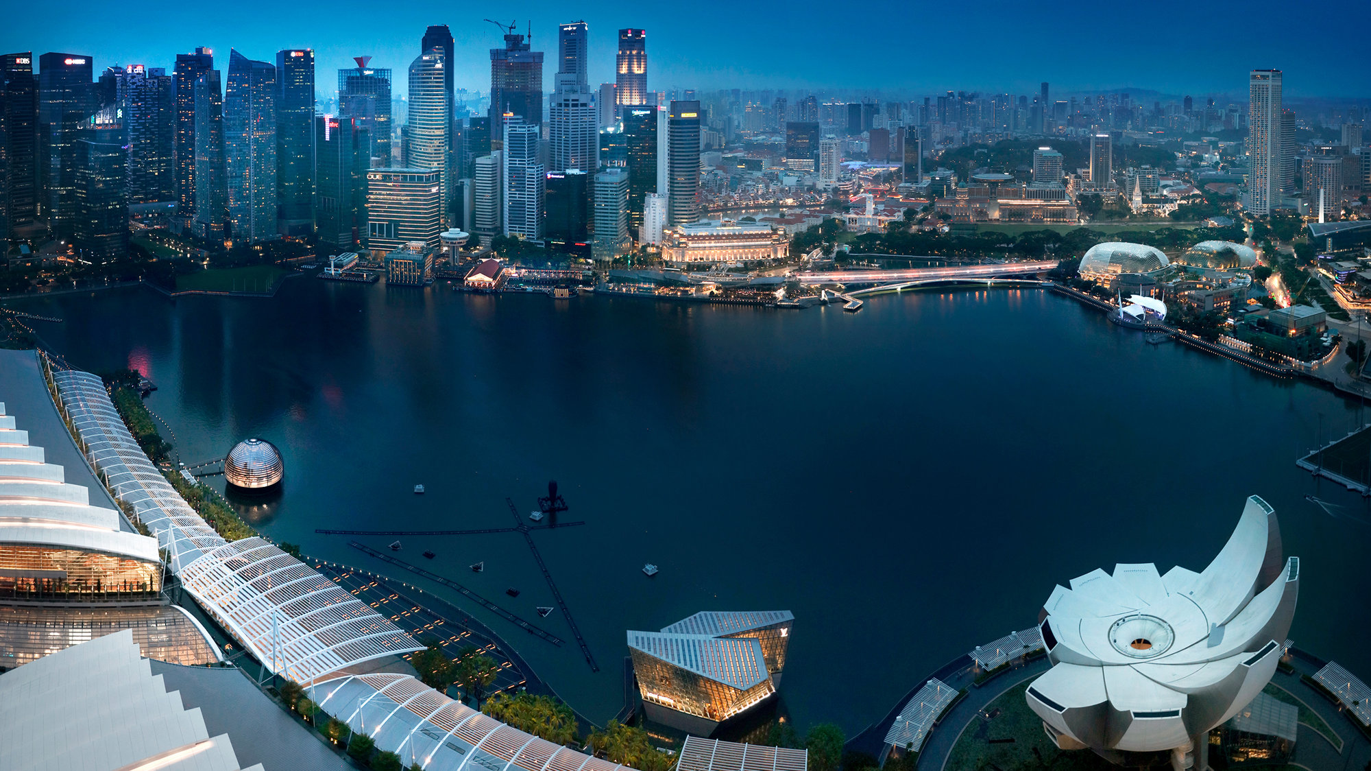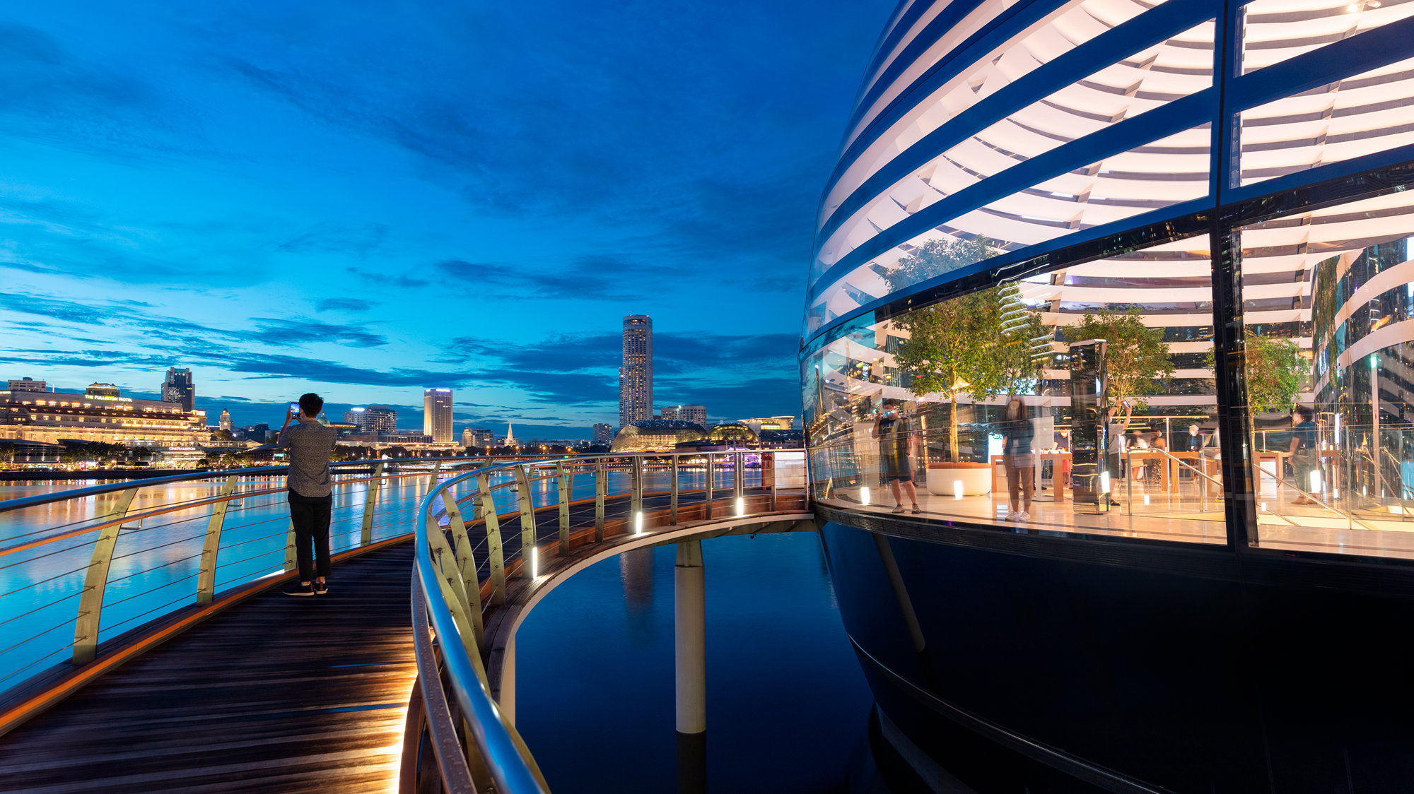 Apple Marina Bay Sands a distinctive presence on the bay, with a 30-metre diameter dome that is a contemporary interpretation of the geodesic dome, using minimal material to enclose the maximum space. Imagined as a clear bubble in the water, it references the sister pavilion through its materiality and site. It is fully glazed, with a black glass base, creating an island joined only by a small bridge.