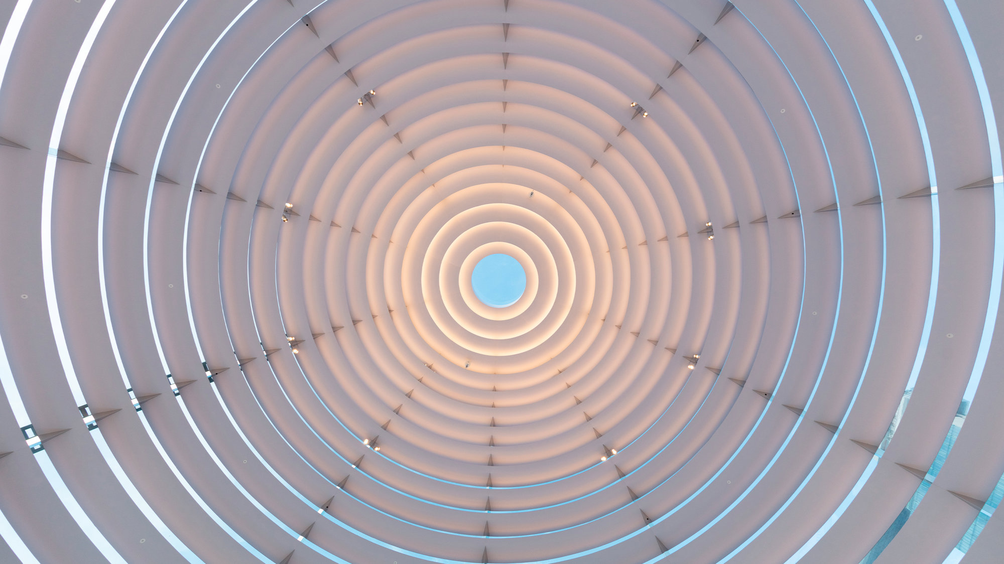 A gentle ramp from the boardwalk leads up to the fully glazed dome, which affords a 360-degree view of the entire marina through large 12 metre x 3 metre panes of curved glass. The glass dome comprises 112 pieces of glass treated with frit and coatings to allow a fully glazed external appearance with dramatic, integrated solar shading to the interior. On the inside, the dome features fabric baffles that spiral up to the top, providing solar shading and acoustic control within the store. The baffles provide glare control and reduce the area of exposed glazing, lowering the energy required to cool the space. The transparent glazing at store level allows visitors to have a direct connection with the outdoors, gradually transitioning to darker panels at higher levels to reduce solar gain. At the top a fully glazed semi-opaque oculus provides a dramatic shaft of light that travels through the space in much the same way as the famous pantheon in Rome.