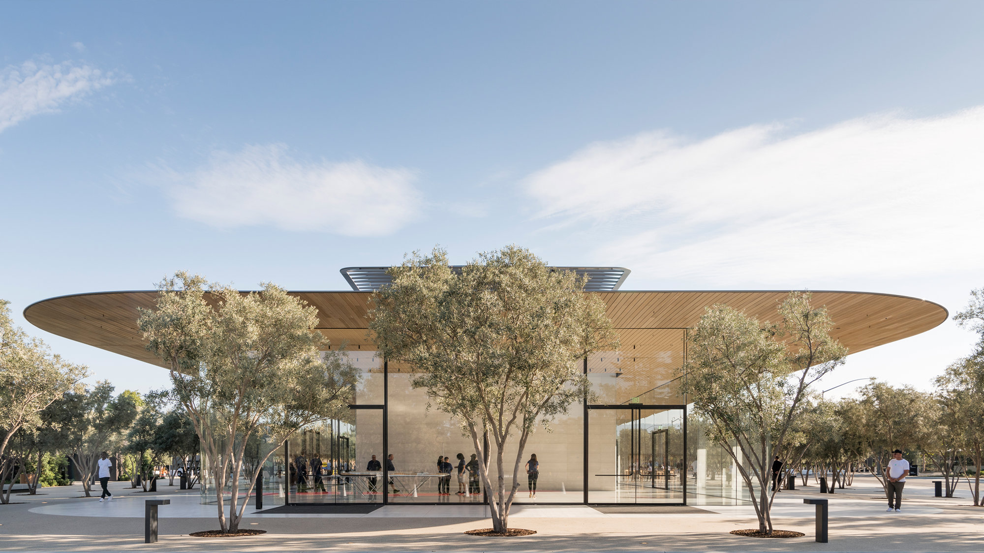 Several other buildings form an integral part of the experience at Apple Park: The Fitness & Wellness Center is a pavilion retreat in the Apple Park landscape. Approached from the south it appears as a pair of single-storied, lightweight buildings; expansive glazing opens light-filled exercise and treatment rooms onto the parkland. Between its two volumes, a juice bar serves healthy drinks and snacks around a courtyard shaded by olive trees.