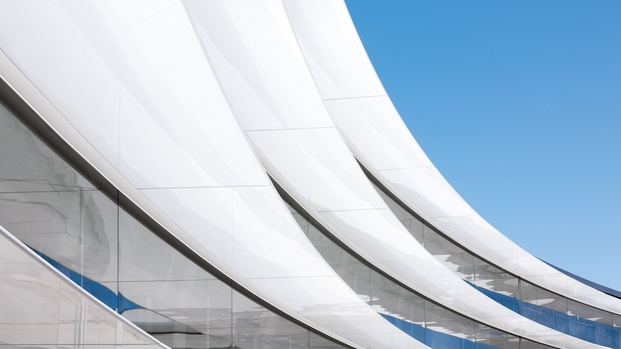 The simple form of the Ring Building conceals immense expertise and innovation. It comprises a few core elements: communal ‘pod’ spaces for collaboration, private office spaces for concentrated work, and broad, glazed perimeter walkways – featuring the largest sheets of curved glass ever constructed – that allow uninterrupted connection to the landscape. One of the most advanced precast concrete structures in the world, over 4,000 slabs, which span up to 15 metres (48 feet), make up the Ring’s floors. Known as ‘void slabs’, these multi-use elements form the structure and exposed ceiling, incorporate radiant heating and cooling and provide air return. At the eight cardinal axis points, full-height atria create light-filled entrance commons: social spaces that connect the park to the garden space within. Breaking this rhythm, the Restaurant – a campus town square – occupies the Ring’s entire north-east axis. Its quadruple-height dining hall and outdoor terraces encourage interaction. Most impressively, the Restaurant’s north-eastern facade can slide quietly away. Huge doors of glass, 15 metres (50 feet) high and 55 metres (180 feet) wide, roll effortlessly on tracks beneath the floor. They are the biggest of their kind ever constructed, and enhance the sense of landscape sweeping through the building.