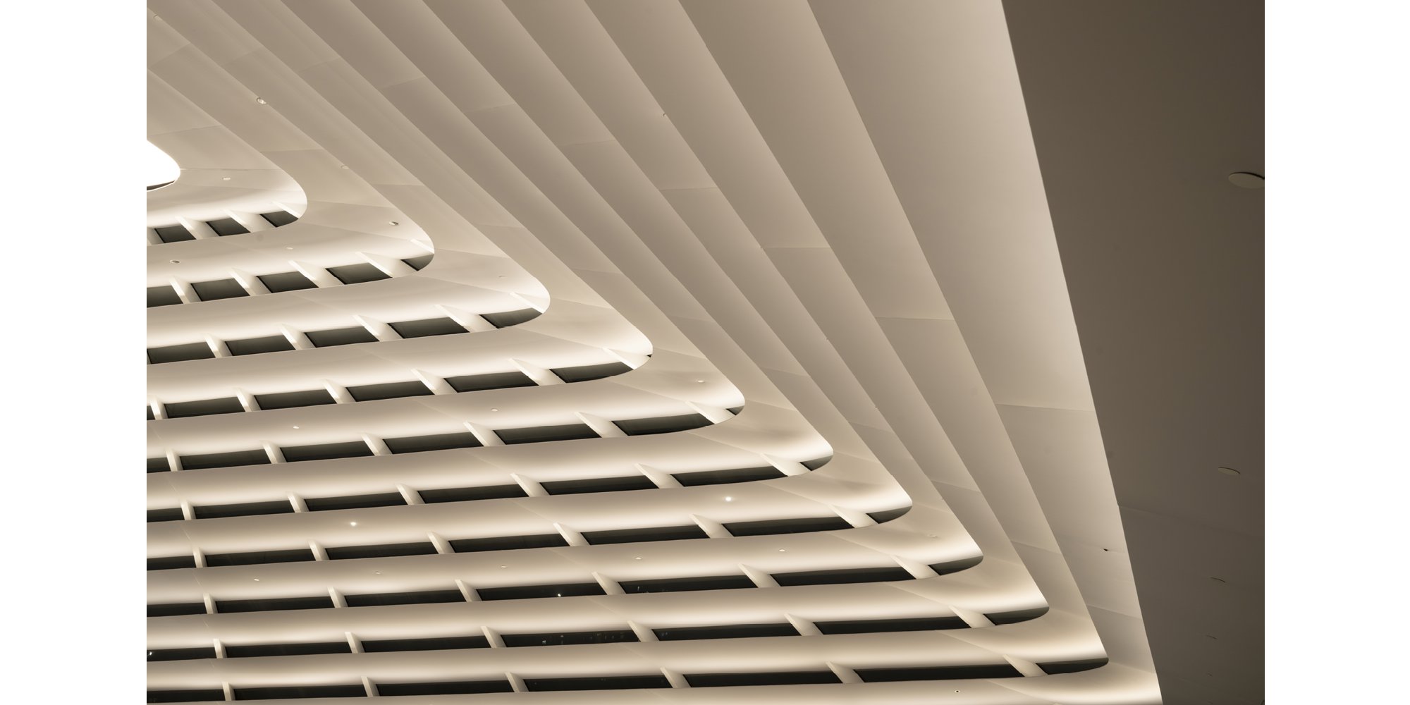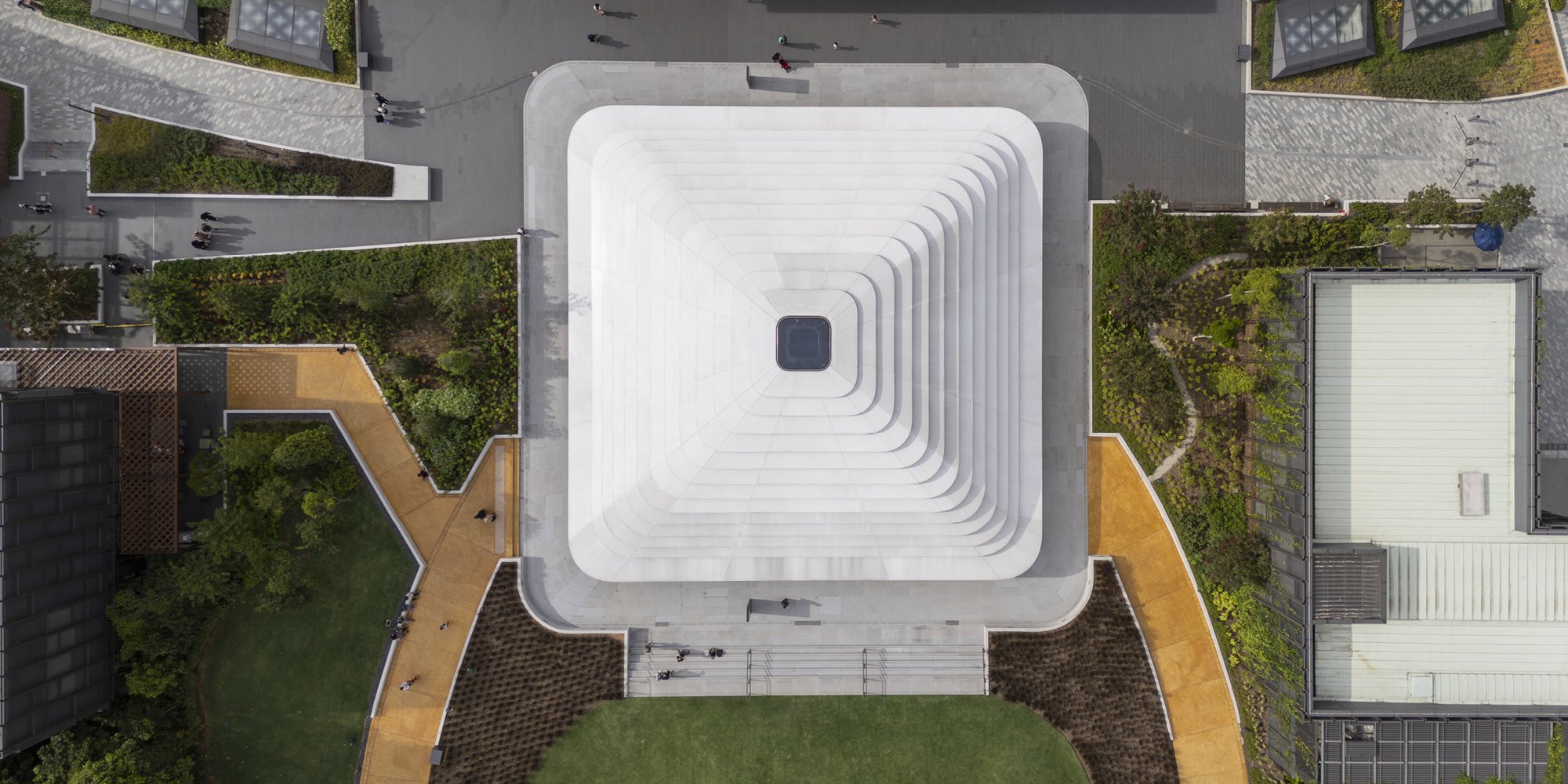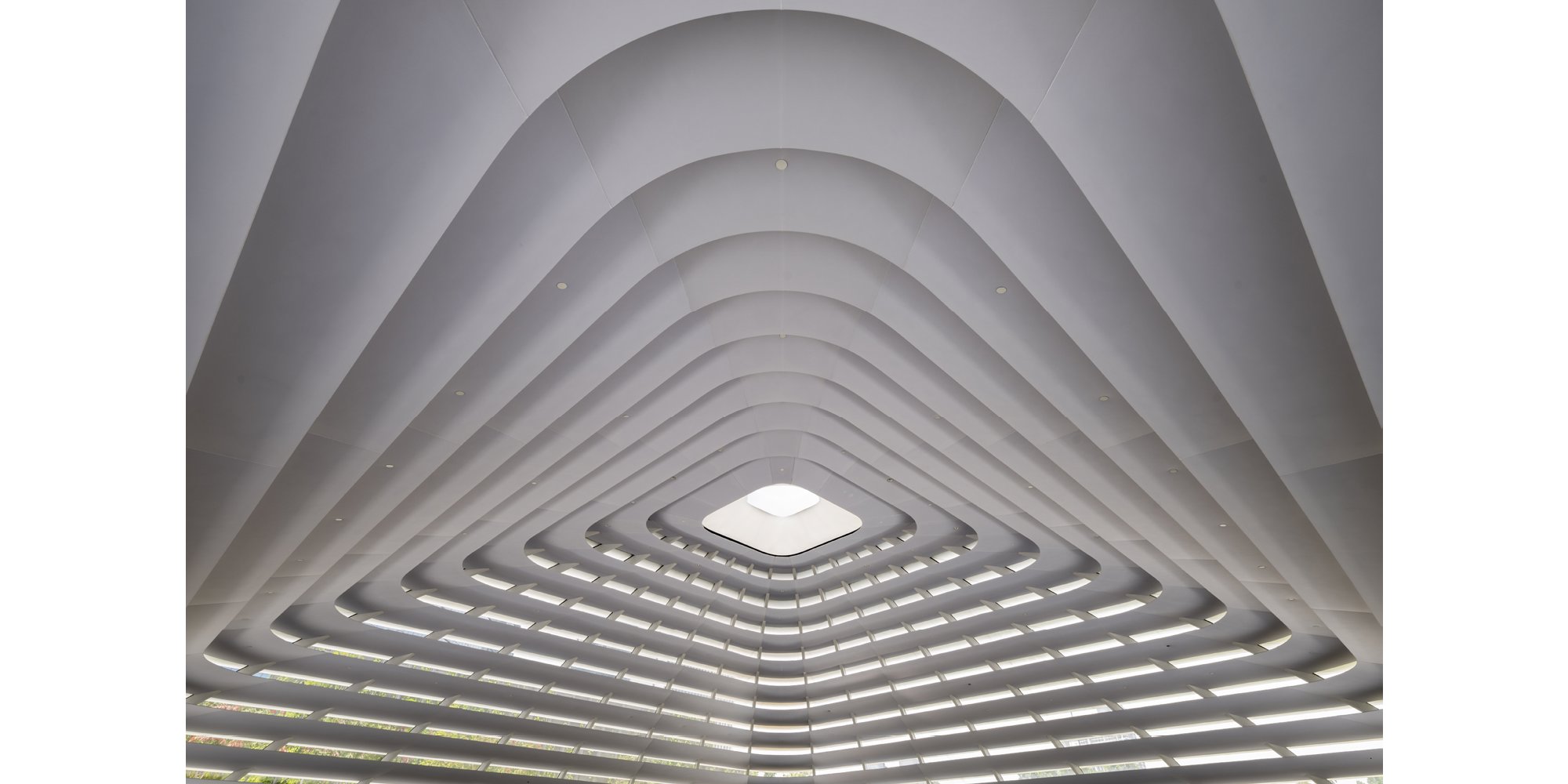 Designed as a glazed dome, the 87 x 87-foot (26.5 x 26.5 meter) roof transitions seamlessly between square and round geometries from the base to the top. Responding to Malaysia’s tropical climate, it is shaded by a series of fins that are carefully angled to control solar radiation. The roof appears to be solid at the lower levels, becoming more permeable as visitors rise through the store. The lowest fin spans outward to shield the glass façade and create a shaded walkway around the edge of the store. A central glazed oculus, with 30% ceramic frit, brings soft daylight into the interior and incorporates a dynamic lighting feature.