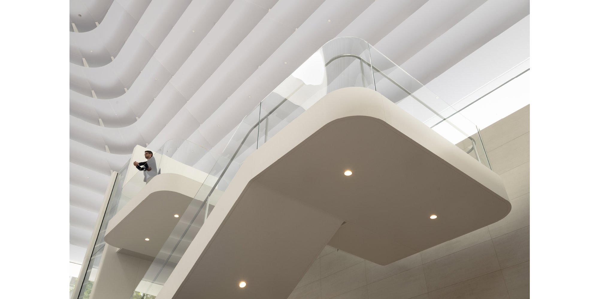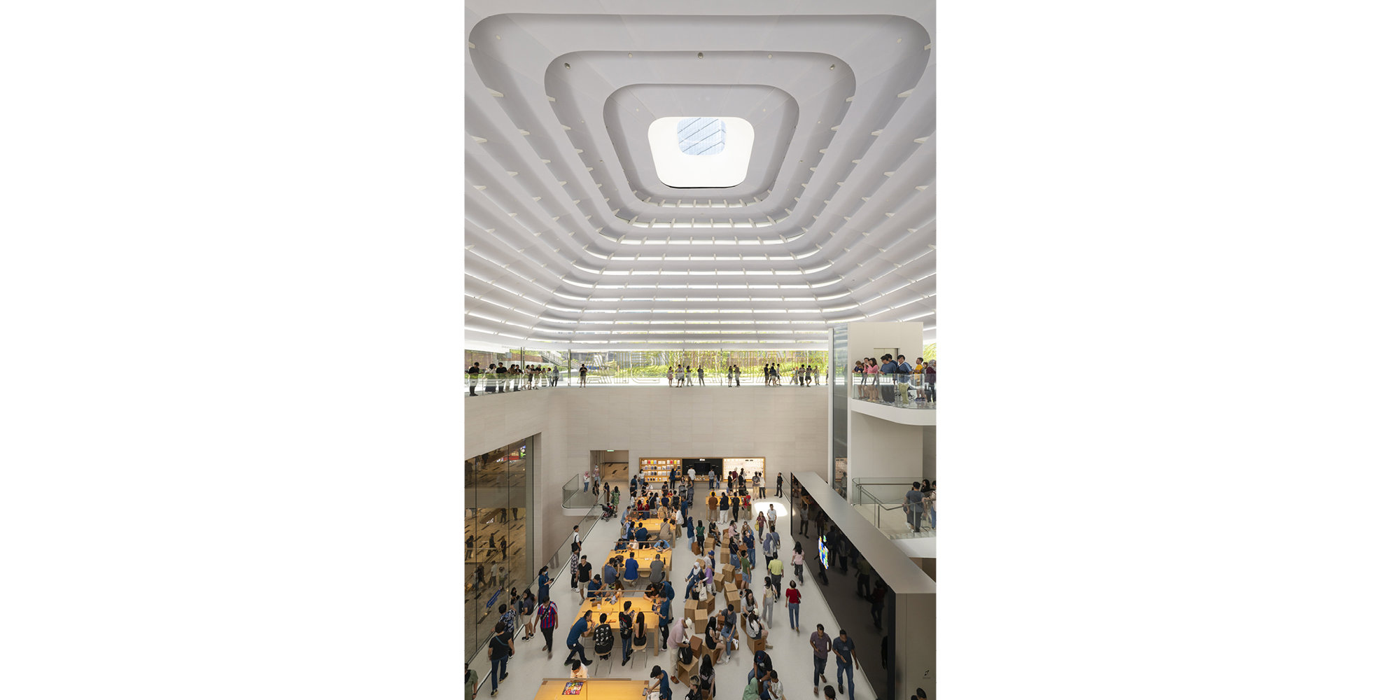 The store is laid out across three levels with a viewing deck at the top that directly connects with the edge of the park, bringing daylight and greenery into the store through the soaring interior. A sculptural quartz and glass staircase – and a bespoke glazed elevator – connect the various levels, with layered landings creating multiple lines of sight through the space. The Forum is located on a floating deck and the avenue and display tables are on the lowest level with direct connections to the mall. The store includes a video wall and boardroom, as well as a dedicated Apple Pickup station.