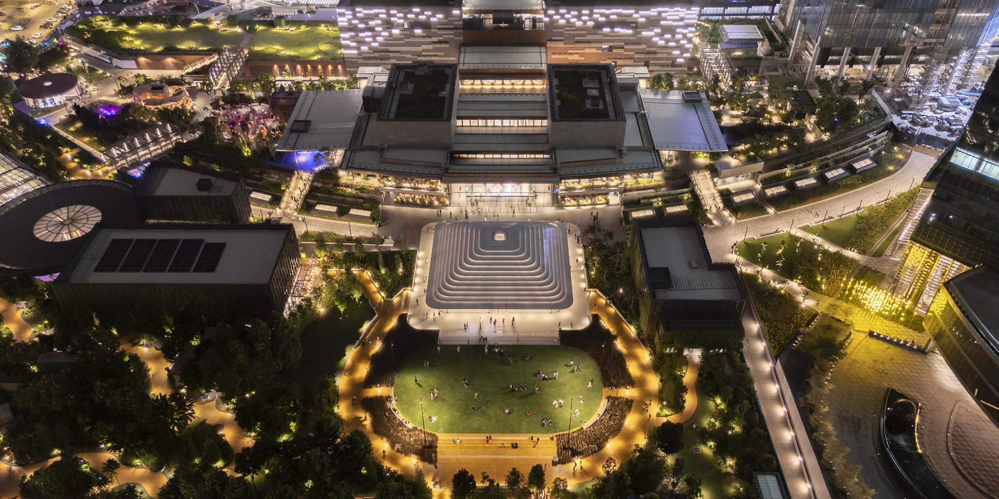 Apple The Exchange TRX is the first Apple Store location in Malaysia, located within Kuala Lumpur’s new Tun Razak Exchange (TRX). The store’s three-dimensional layered roof emits a warm glow at night and draws people into the development. The design creates new visual and spatial connections between the mall’s central atrium and a rooftop park, which includes a lush tropical garden and a communal lawn that wraps around the store’s upper level.