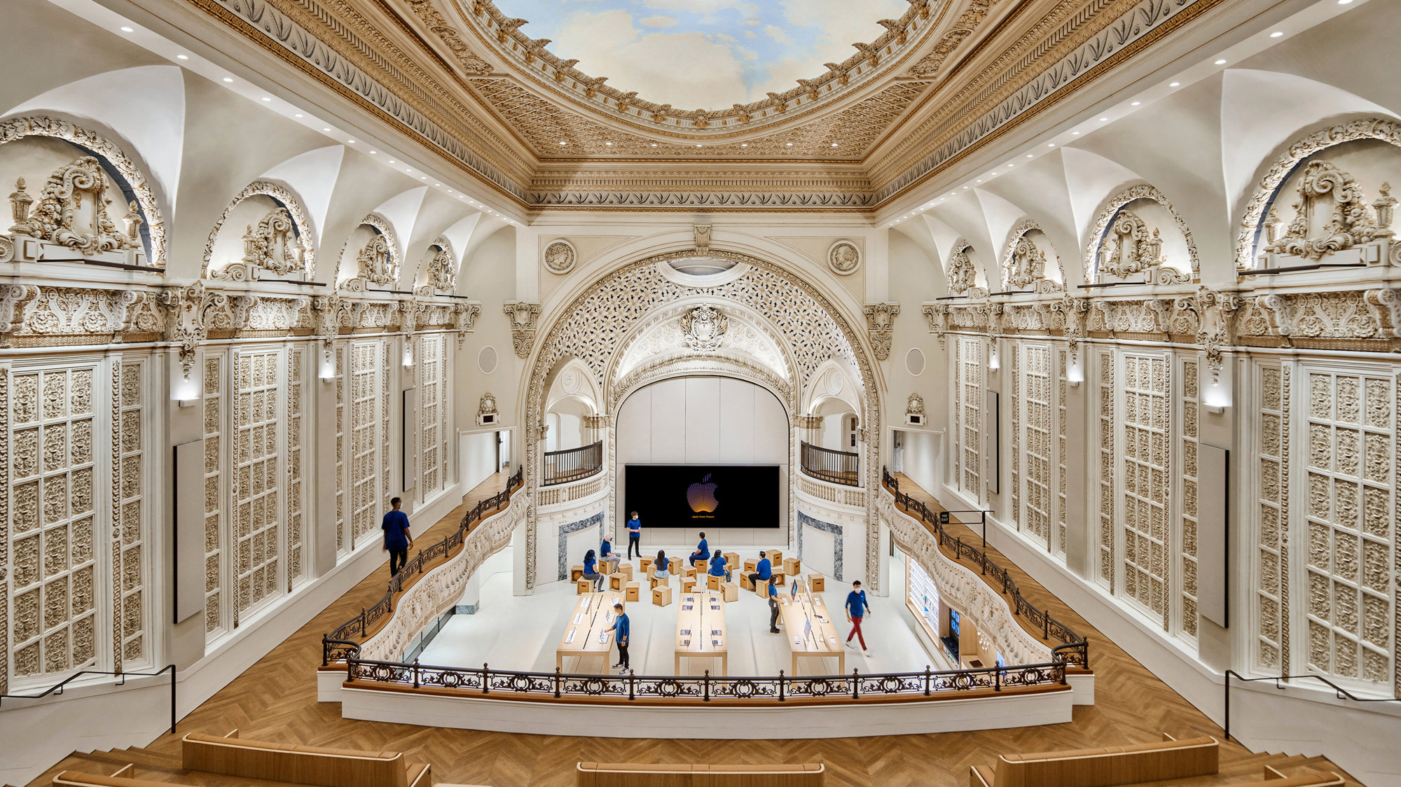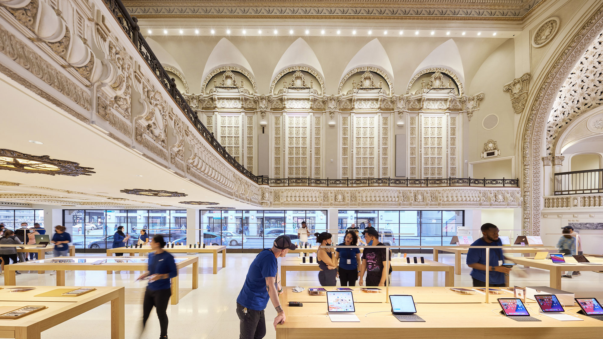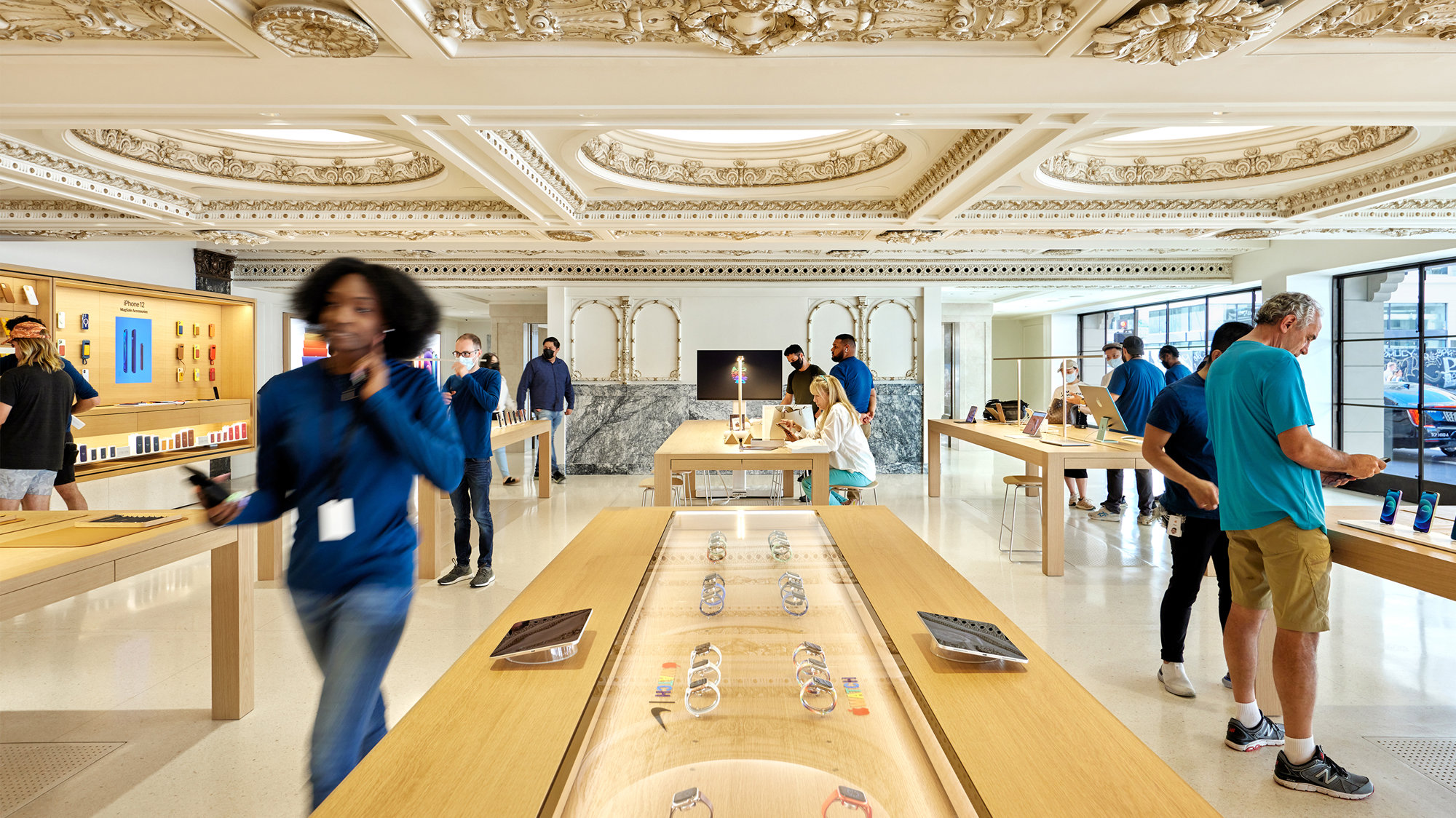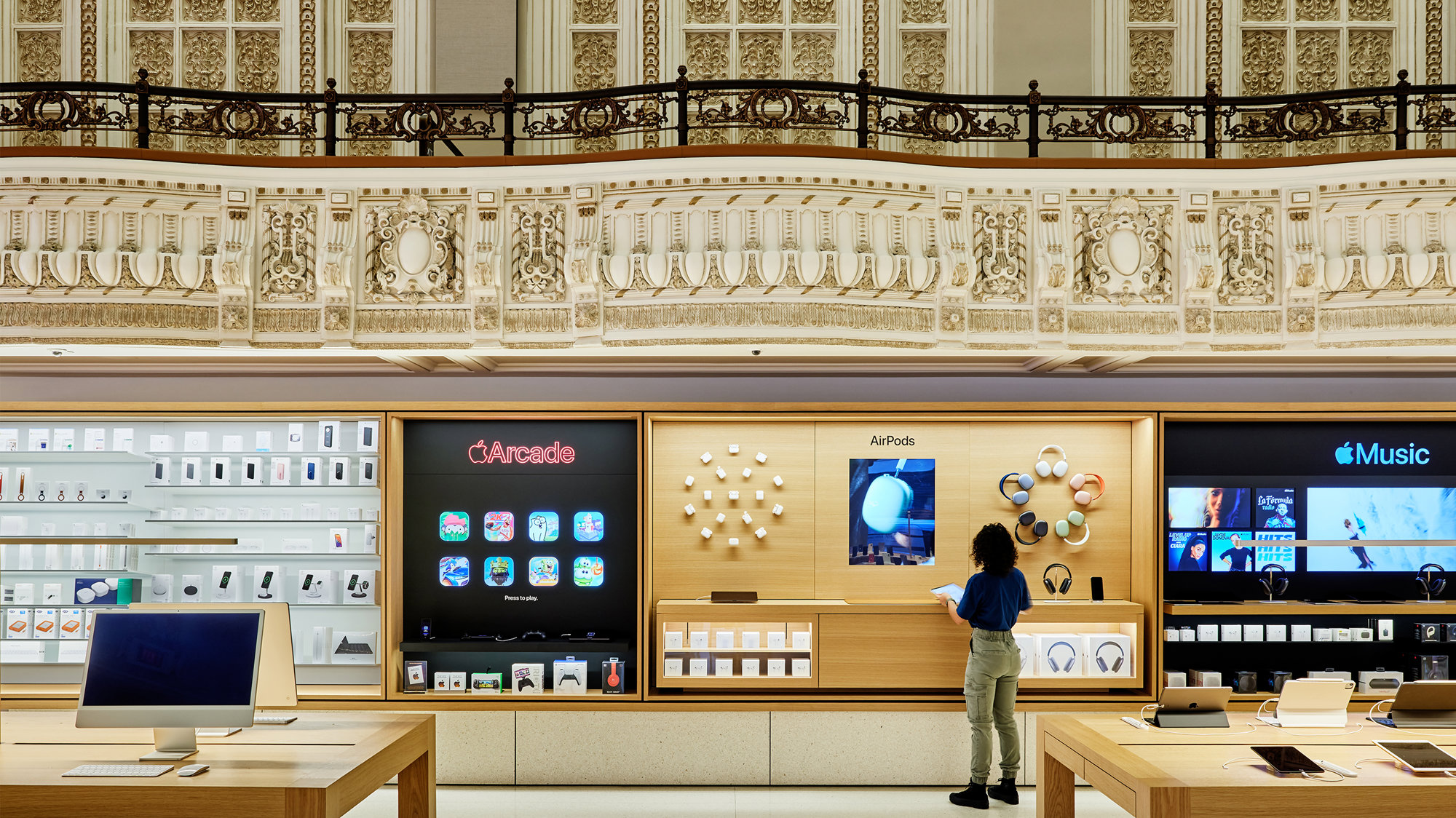 Referencing the golden era of talkies and films, the new Forum reinstates the screen under the proscenium arch. A discreet set of stairs and elevators also bring visitors to the balcony level, which hosts the best seats in the house to view the Forum. The generous leather theater-style seats with integrated electrical and data points are the perfect spot for visitors to relax while they wait for their Genius appointments. At the top of the balcony is the Genius Level. Located just beneath the theater’s projectionist windows, it offers a complete snapshot of the theater in all its restored glory. The Today at Apple will be a new magnet for the public, inspiring people and transforming the entire store, including the upstairs balcony, into a theatrical event space.
