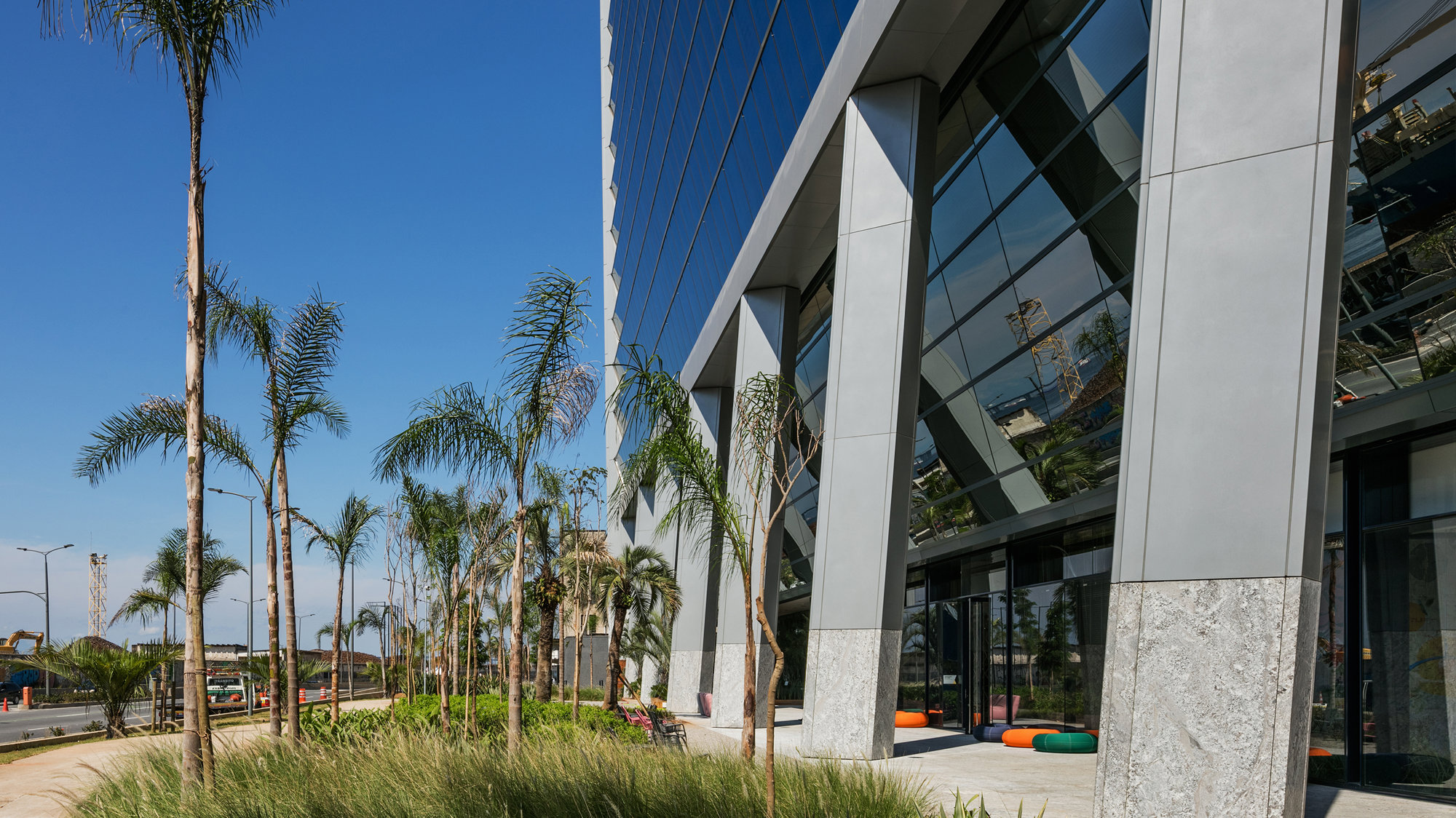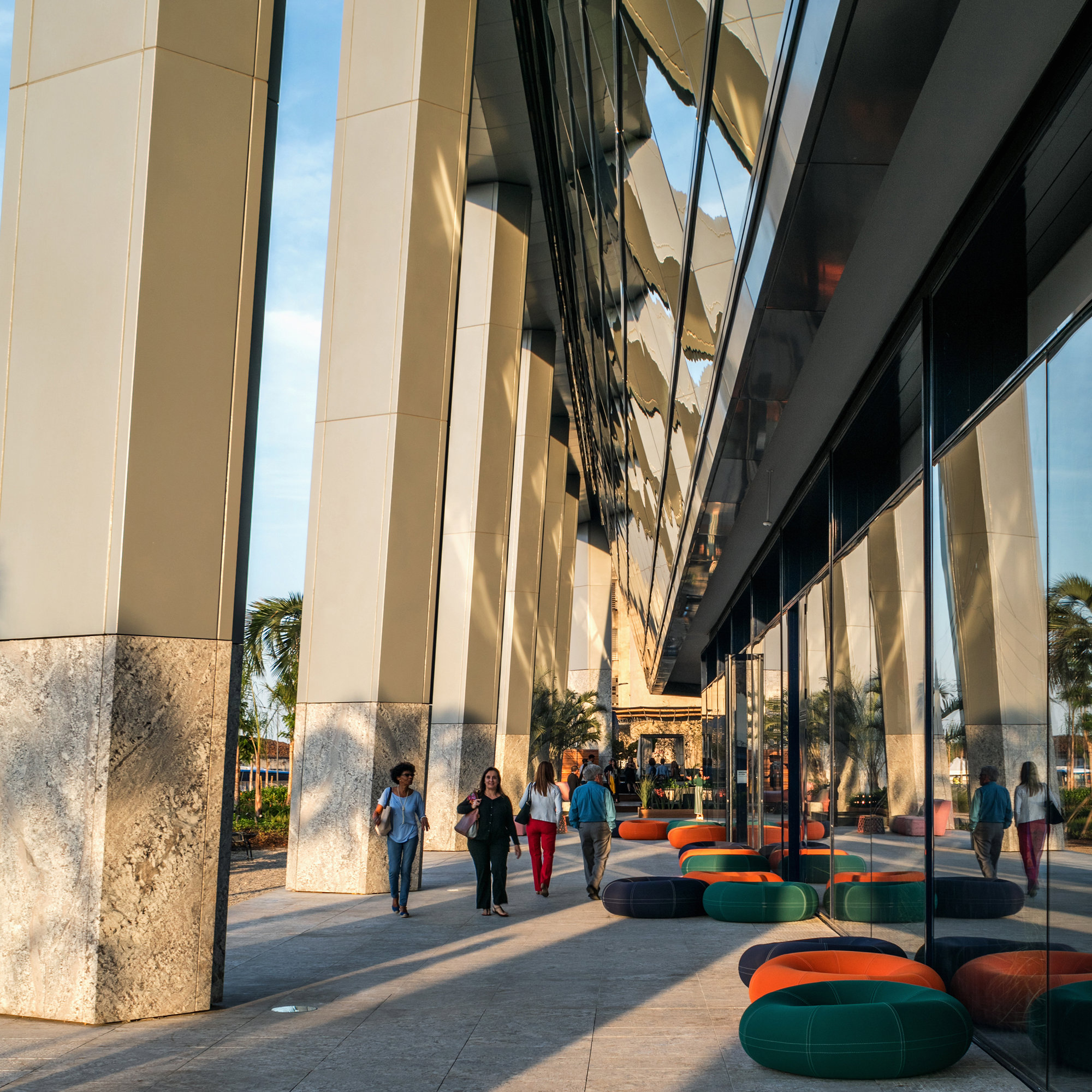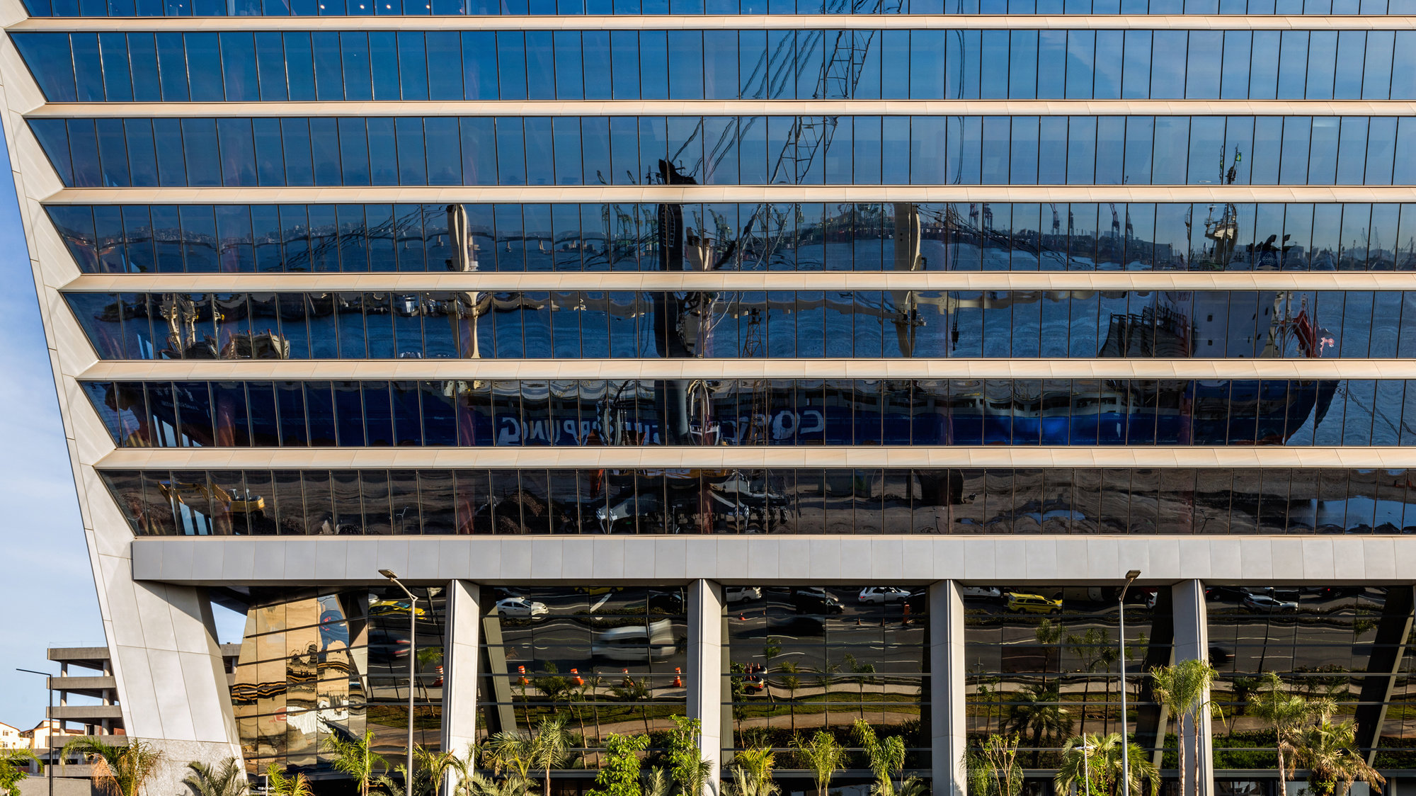 The site is bounded by the newly established Av. Rodrigues Alves urban expressway to the north, and the Avenida Binário to the South, with excellent connections to public transport via a new Light Rail Station to serve the site. At the heart of the project is the grand central plaza – a vibrant pedestrian public realm with a linear retail arcade, recreating the street‐based civic experience of this former light‐industrial port area. A 400-metre long linear park abuts the site, establishing a landscape corridor alongside the sea facing the retail arcade. This includes bike lanes, pedestrian paths and landing zones at different levels to create a visual-sound barrier that shields the site from the expressway while retaining views towards the Guanabara Bay. The 22-storey, twin-building development consists of 125,000 square-metres of office space, with retail and public spaces at the base. The entrance lobby to each building has been lifted above the central public plaza, with views over the adjacent linear park towards the port and Guanabara Bay.