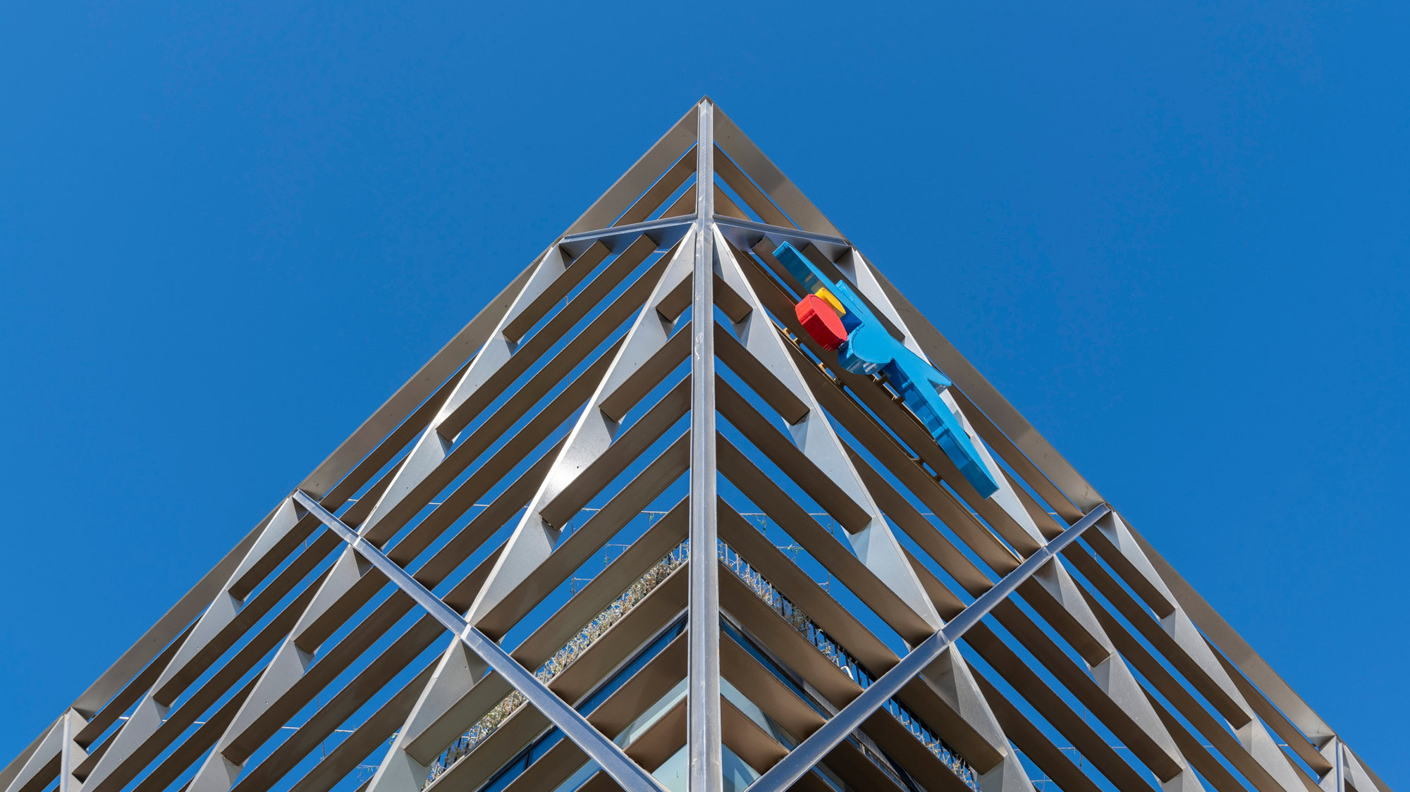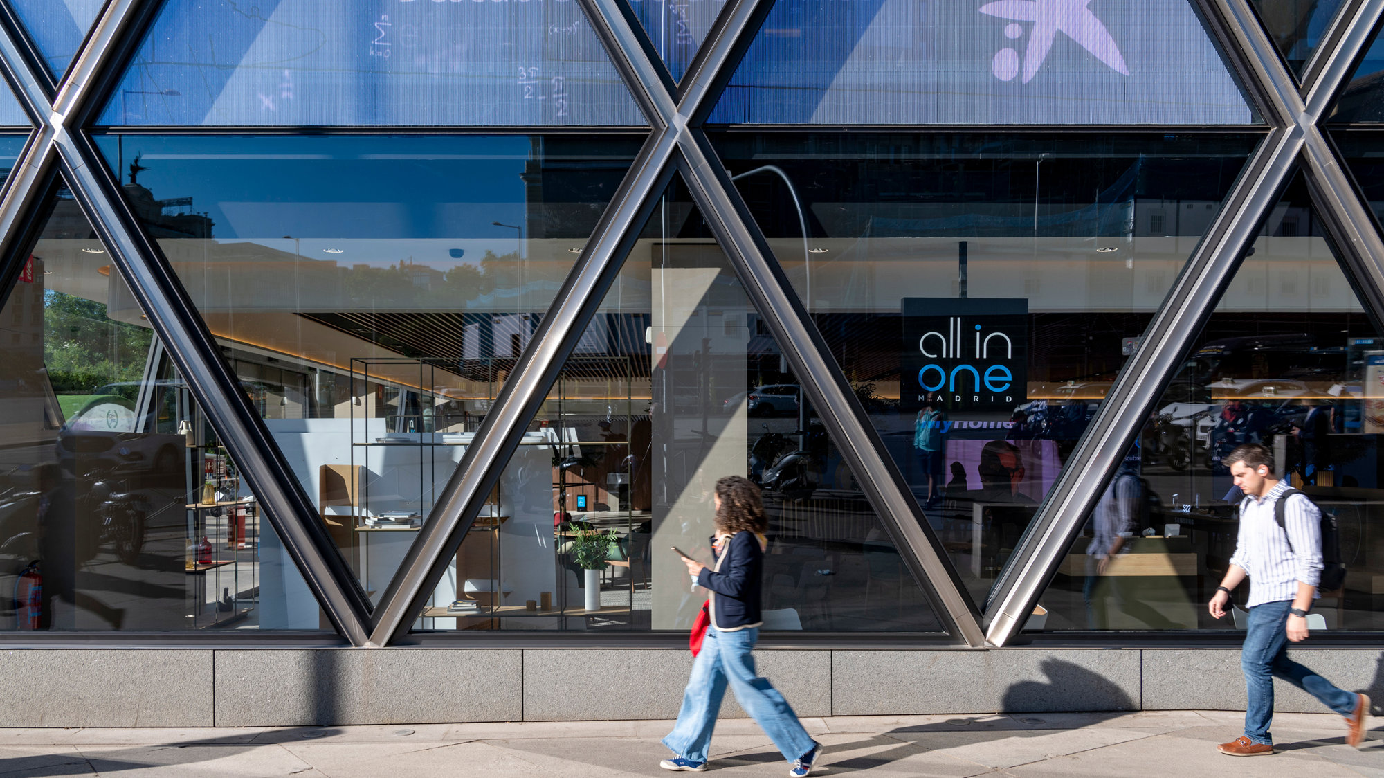 The four-storey building is characterised by its distinctive stainless-steel diagrid façade that gives it a strong visual identity. The optimised geometry responds to structural efficiency, minimising energy and material consumption. Shops on the ground floor draw pedestrians into the building, with the permeable building envelope ensuring maximum visibility, allowing daylight to flood in and creating a friendly and inviting experience. Responding to Madrid’s Mediterranean climate, the building features a soaring atrium that connects the retail at the base with the offices above, pulling the natural greenery deep into the building. The building is crowned by a sky terrace – full of greenery, light and life – for informal meetings and gatherings against the backdrop of the Plaza de Colón.
