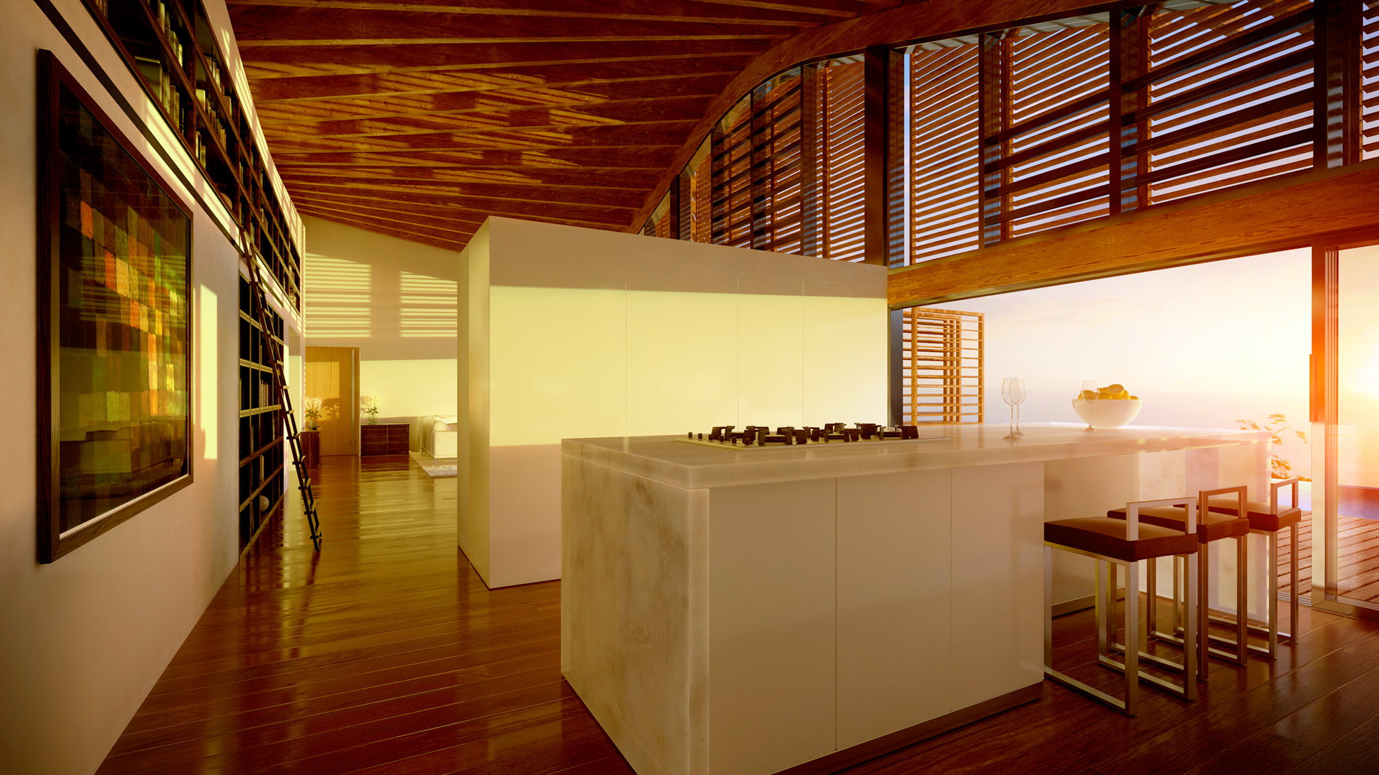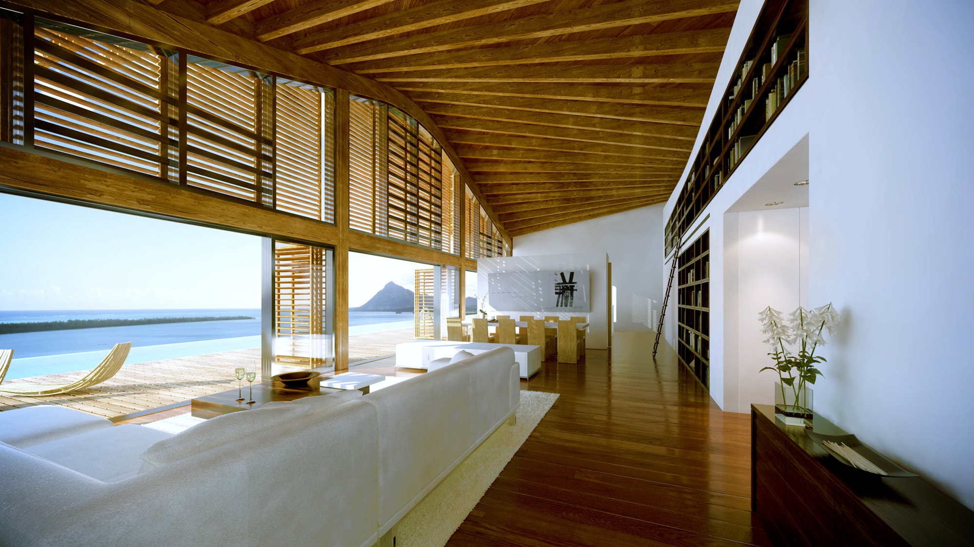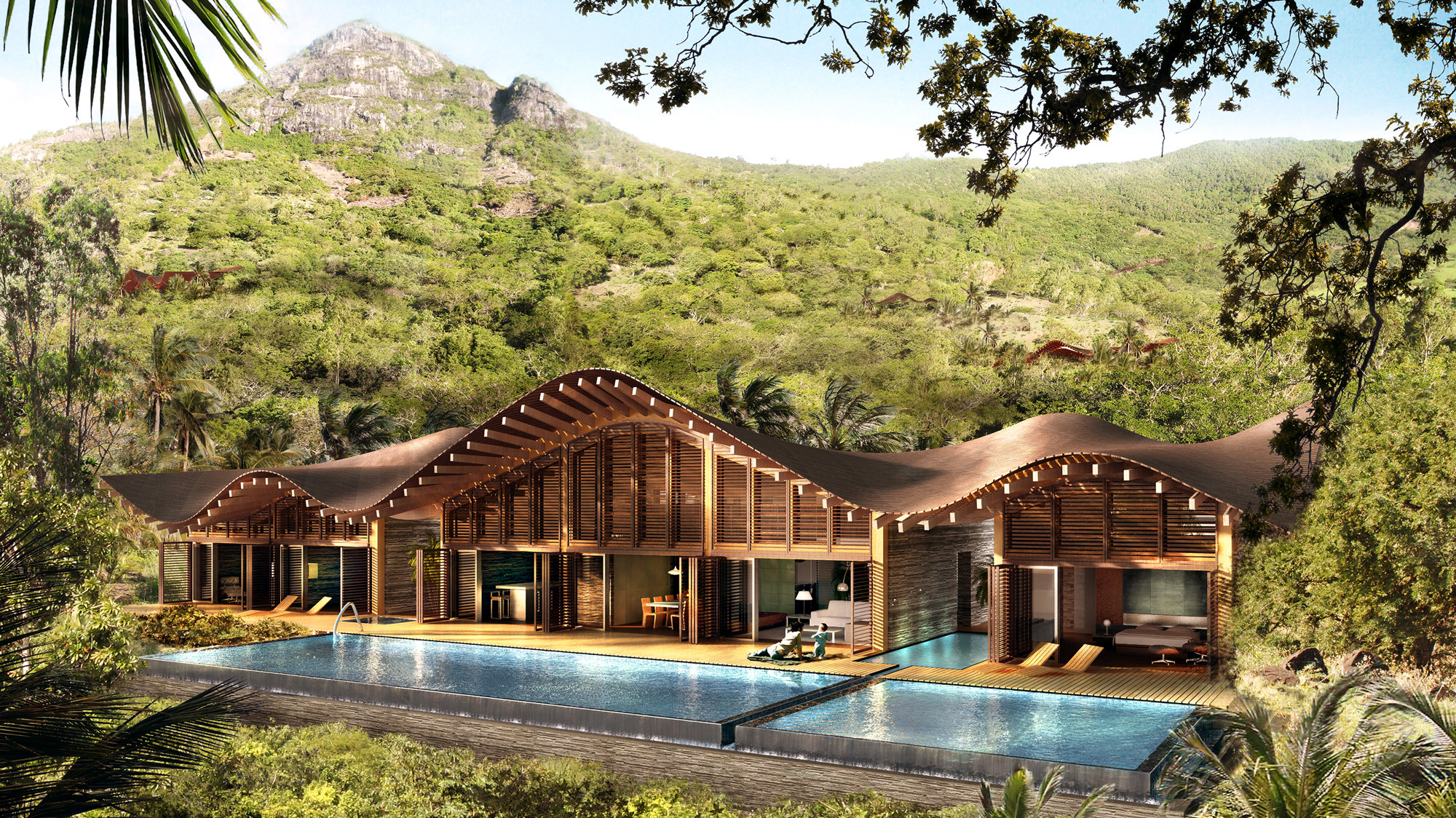 The masterplan is for a discreet and environmentally intelligent architecture that blends harmoniously with the lush and extensive landscape. Green fingers of lush vegetation extend down towards the sea, with a series of contemporary buildings inserted amid tropical plantings to create an architecture that at once responds to the contours of the landscape and recedes into the green totality. Forming a sculptural family, dramatic undulating timber-shingle roofs unify the built elements and reinvent island architecture. Combined, these elements provide an idyllic haven in a luxuriant tropical garden, a pervading sense of tranquillity and luxurious relaxation.