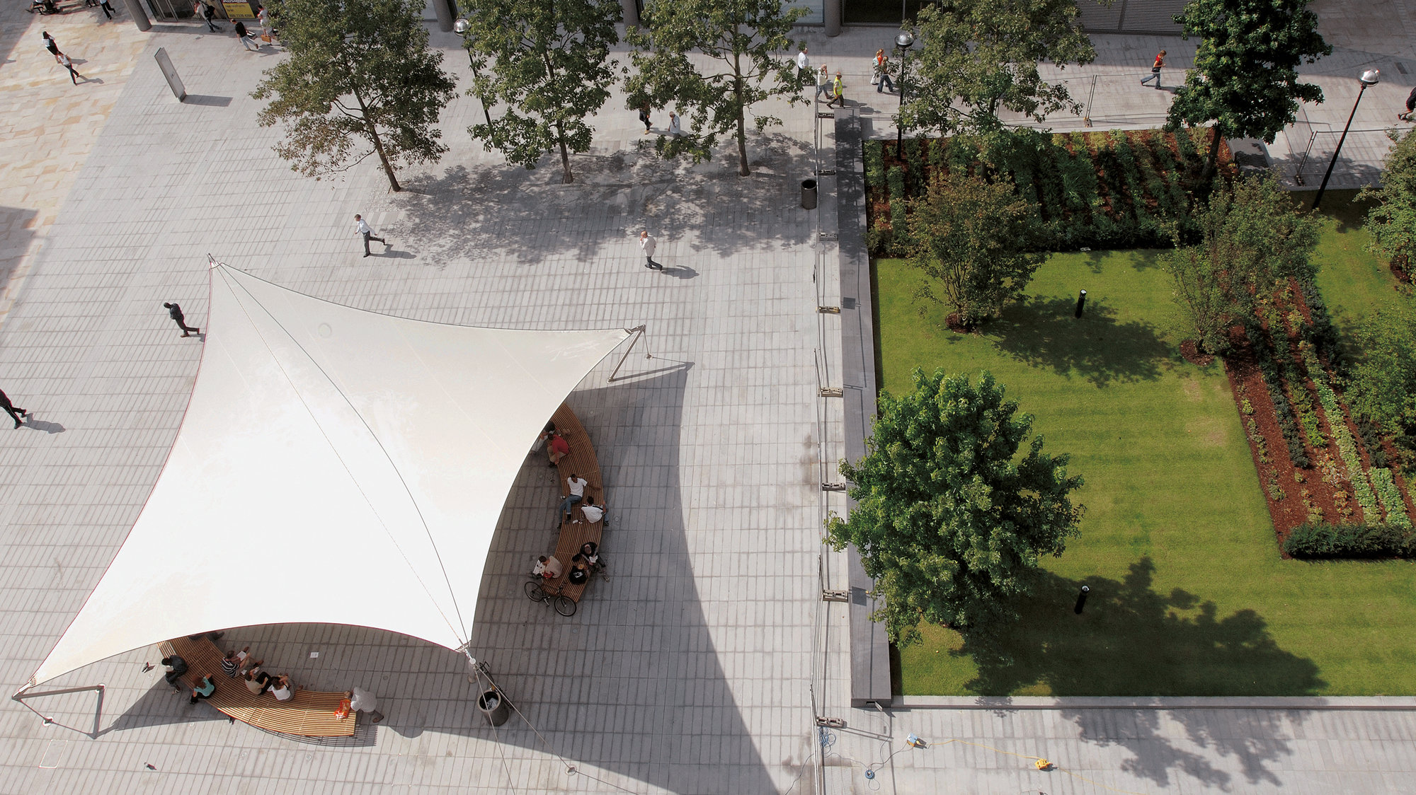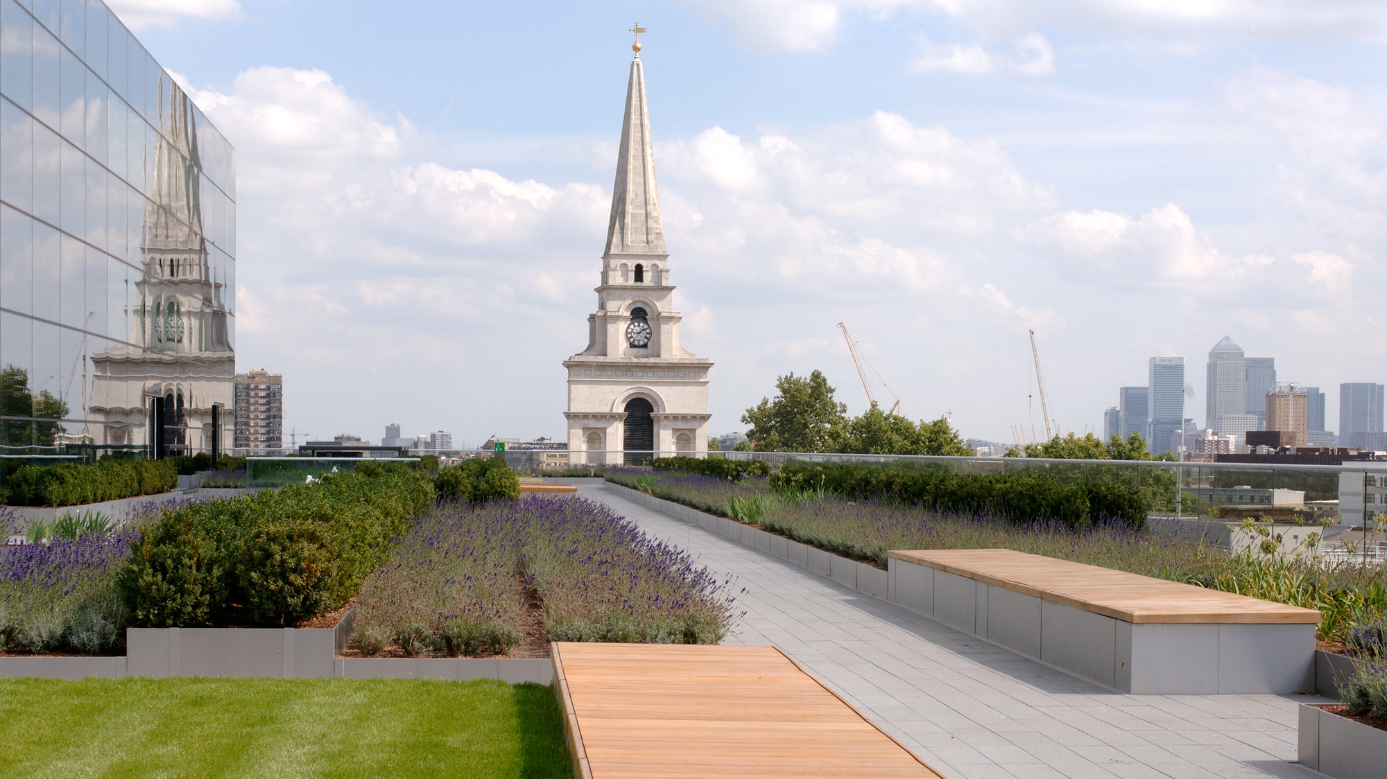 The development includes the restoration of the old market buildings along Brushfield Street, with a new covered pedestrian route behind. Lined with shops, this promenade opens up unexpected views of Hawksmoor's magnificent Christ Church Spitalfields. A new headquarters building for Allen & Overy mediates between the tall commercial buildings on Bishopsgate and the smaller-scale historic fabric around Spitalfields Market. It articulates this change in scale in a series of stepped terraces, which form gardens overlooking the square below. At ground level the building is transparent and permeable, forming connections to the surrounding network of pedestrian routes and spaces; and the northern facade is recessed to create a covered arcade for shops and cafés. With the largest commercial photovoltaic installation in Europe, the building harnesses enough energy to power the landscape lighting across the site.