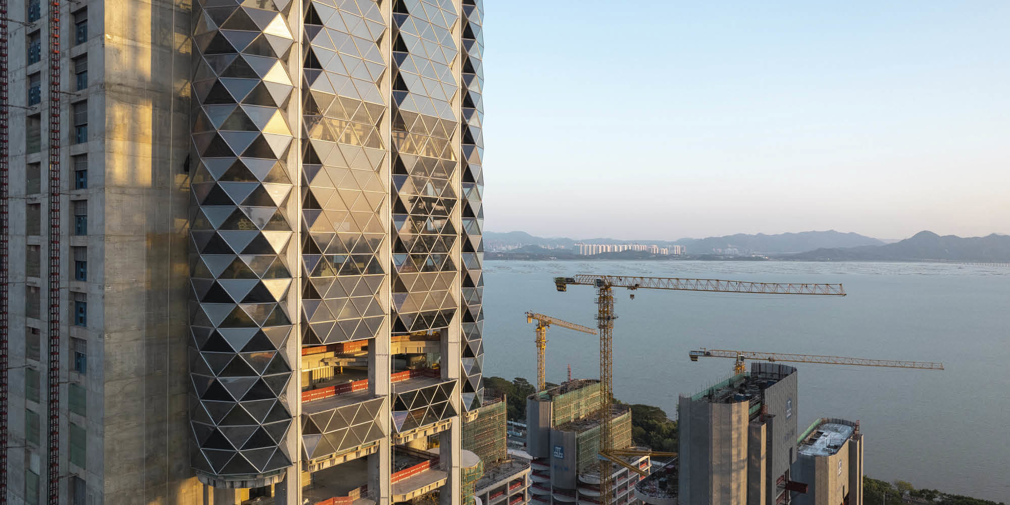 The tower’s design reinforces the impact of the site’s panoramic views across Shenzhen Bay. The south-facing façade incorporates a series of triangulated bay windows, to optimise the tower’s outlook. Workspaces connect to double-height atriums and lush landscaped terraces at regular intervals. In contrast, the building’s northern facade is characterised by its simple, rectilinear form.