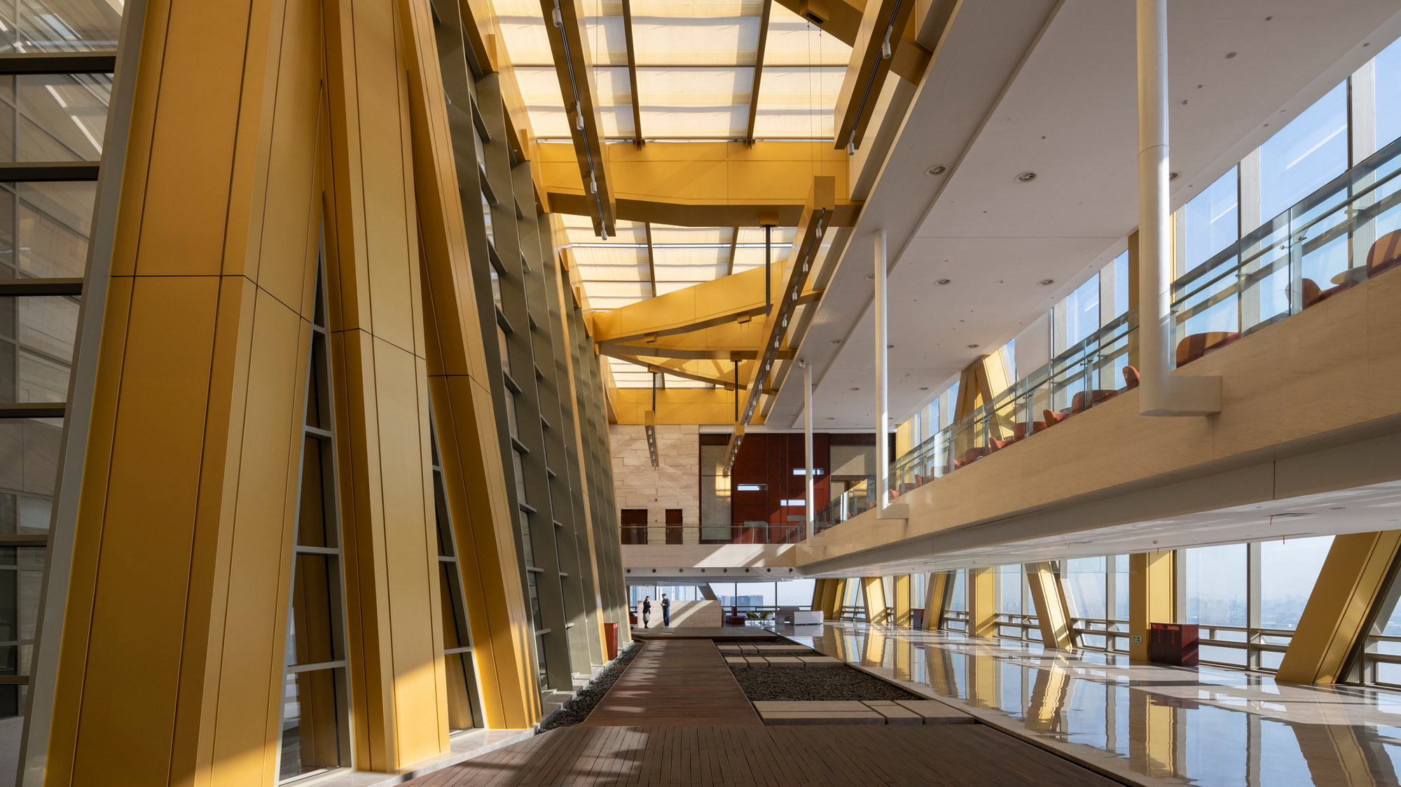 At the base of the building, a 30-metre-high A-frame canopy stretches 72 metres across the ground floor to create a dramatic entrance experience. This leads to the heart of a diamond-shaped central atrium, which rises up through the full height of the 20-storey tower and helps to encourage natural ventilation during the mid-seasons. Tiered sky-gardens line the perimeter of the upper floors and a generous winter garden with a mezzanine level accommodates VIP club and meeting spaces at the top of the building. The tower will be naturally ventilated for part of the year, grey water will be recycled and local materials utilised where possible to reduce embodied energy.
