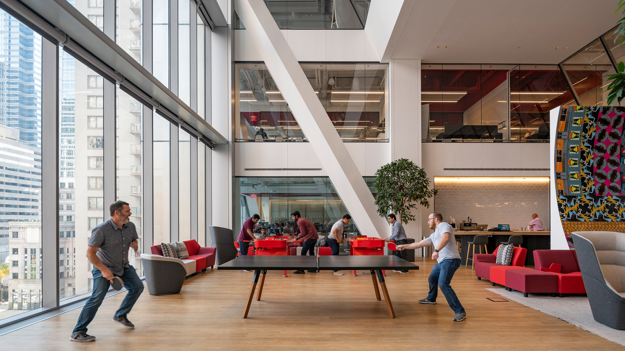 The service core of vertical circulation is split, creating a visual axis through the building to Comcast Center and a clear orientation spine. This central spine is articulated at the top of the building as an illuminated blade of glass, which extends 125 feet (38 meters) high to provide a marker on the skyline. The building’s facades are animated by panoramic glass elevators and a series of thirteen three-story sky gardens, which rise up to draw a continuous strand of active spaces through the building. The large, open floor plates are filled with daylight – each office level is equivalent in scale to twelve tennis courts. The interior is fluid and dynamic, with loft-like, highly flexible spaces designed to allow staff great freedom in choosing where and how they work.