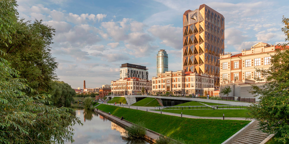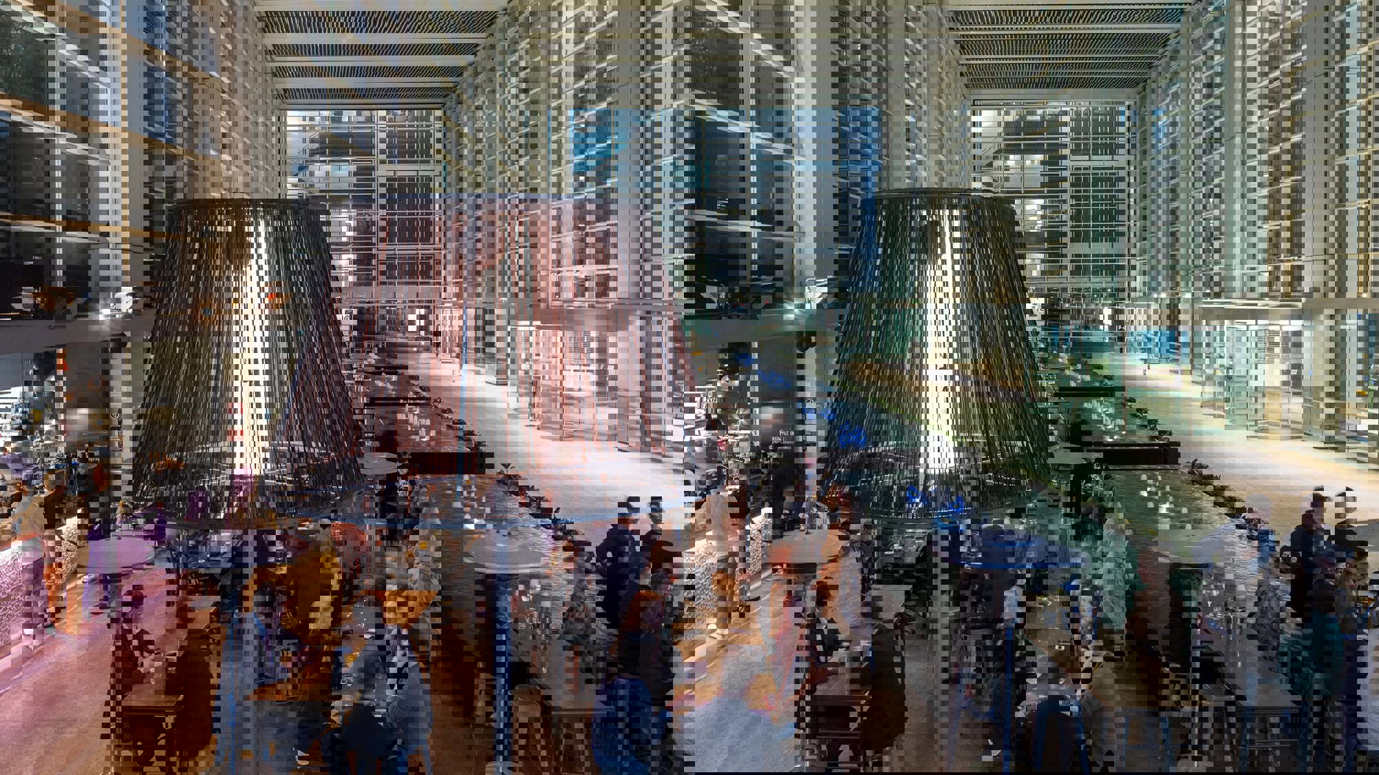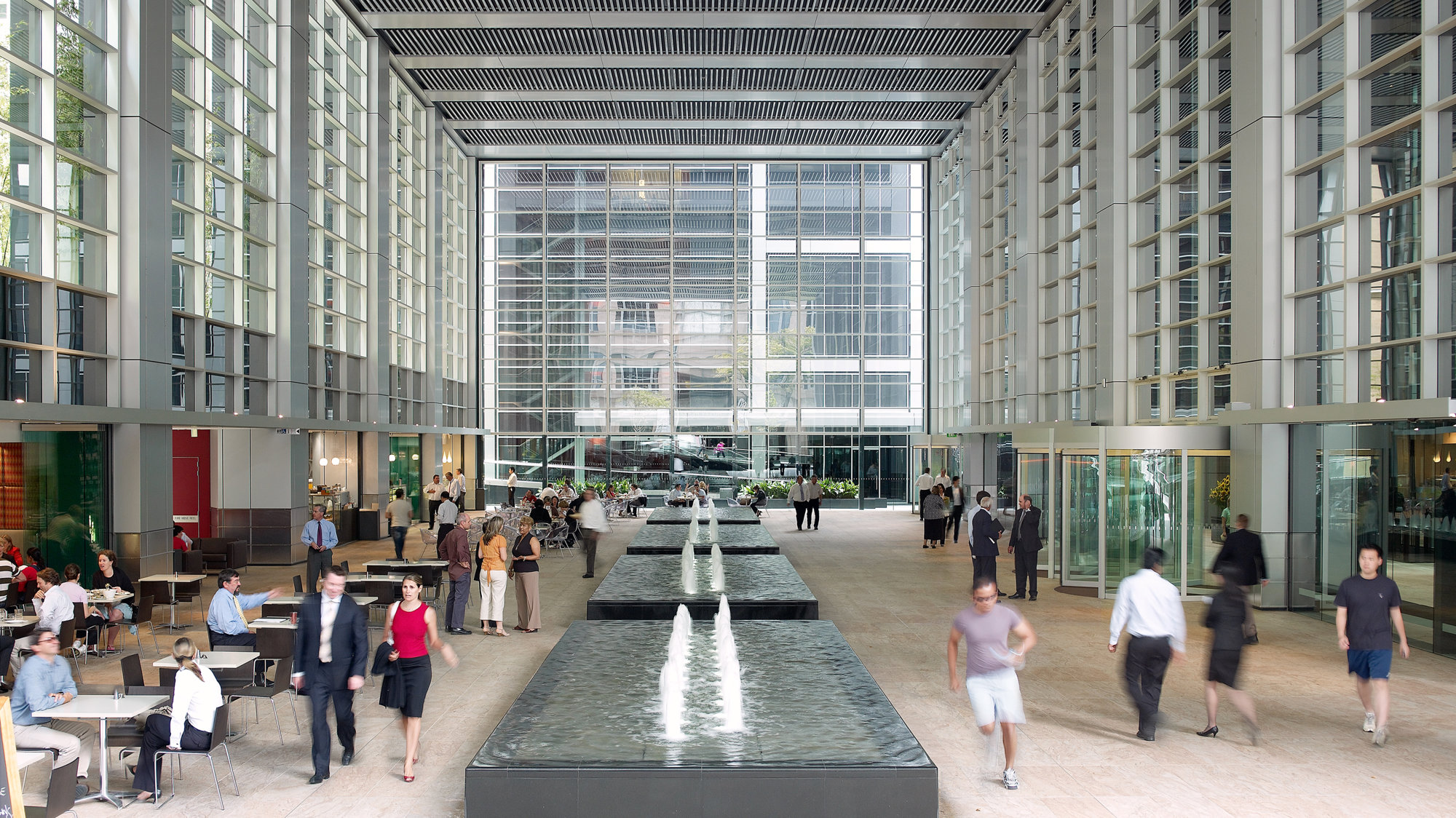 At ground level, the private world of the tower meets the public realm of the city in a four-storey covered plaza - the 'assembly'. This soaring, light-filled space functions as a busy public square. A prelude to the office lobbies, it also contains shops, cafés and a crèche. The central water feature that runs the length of the space can be controlled to enable all kinds of activities, including fashion shows and parties to take place there at any time of day.