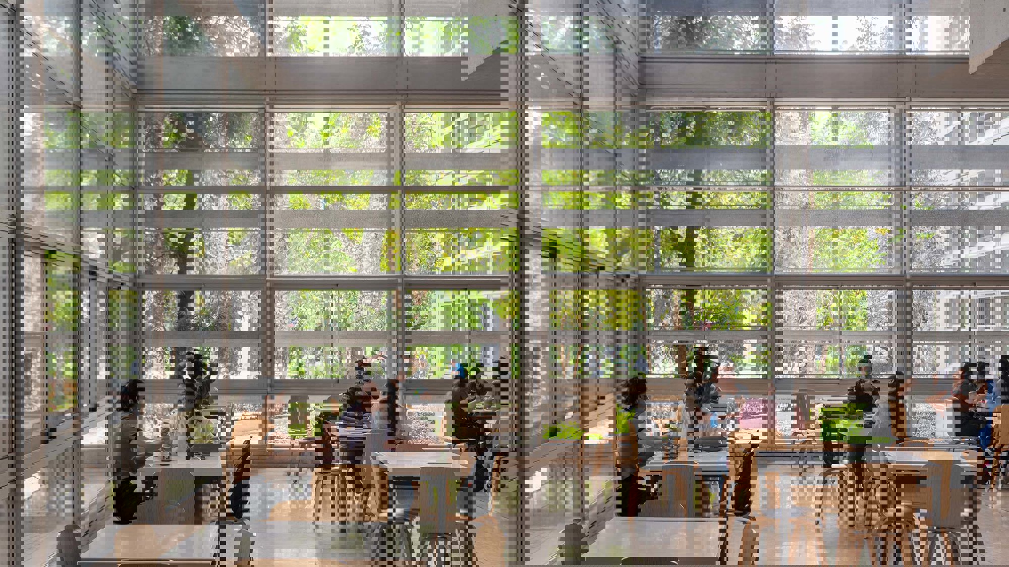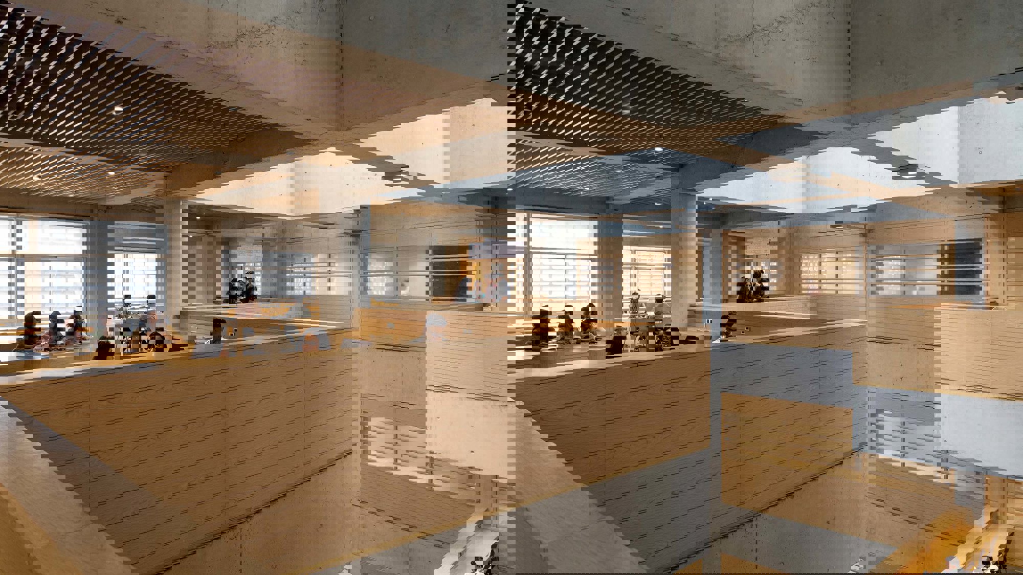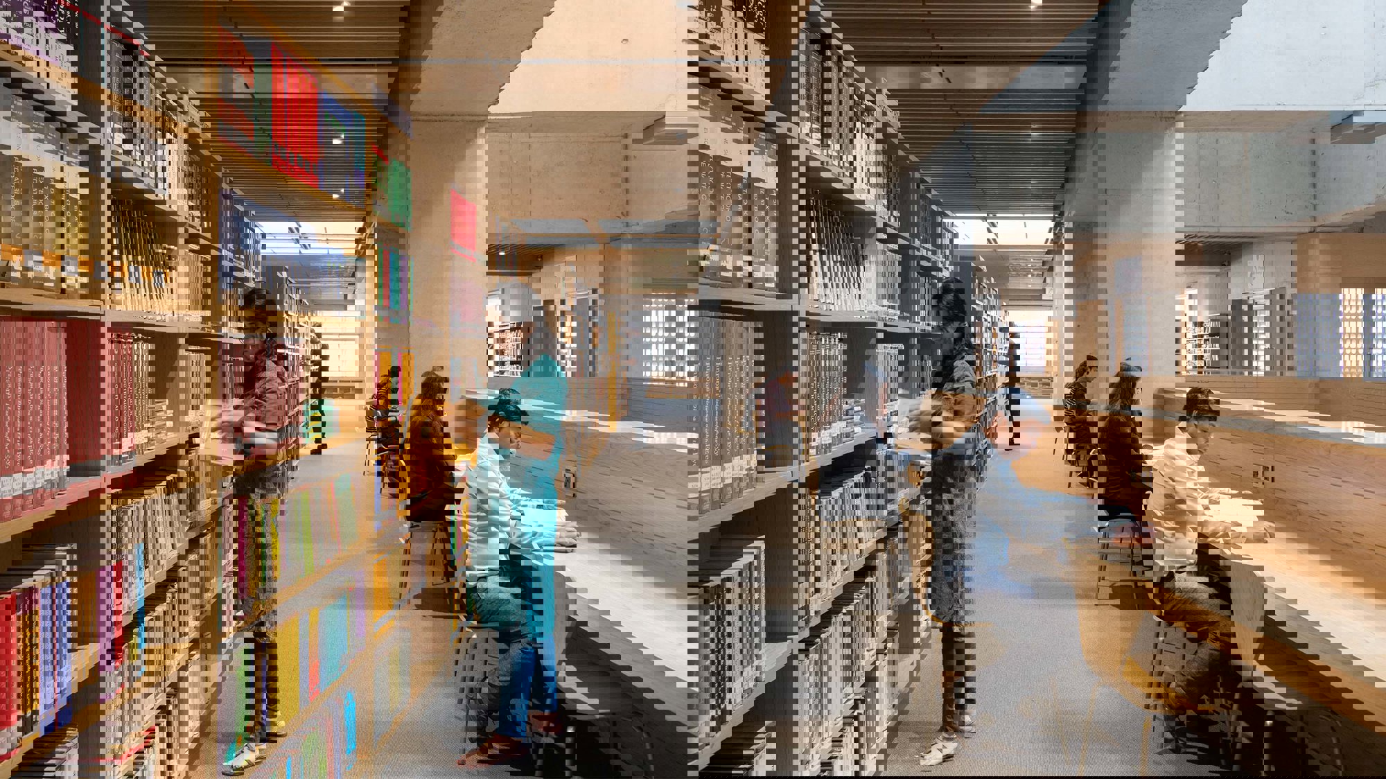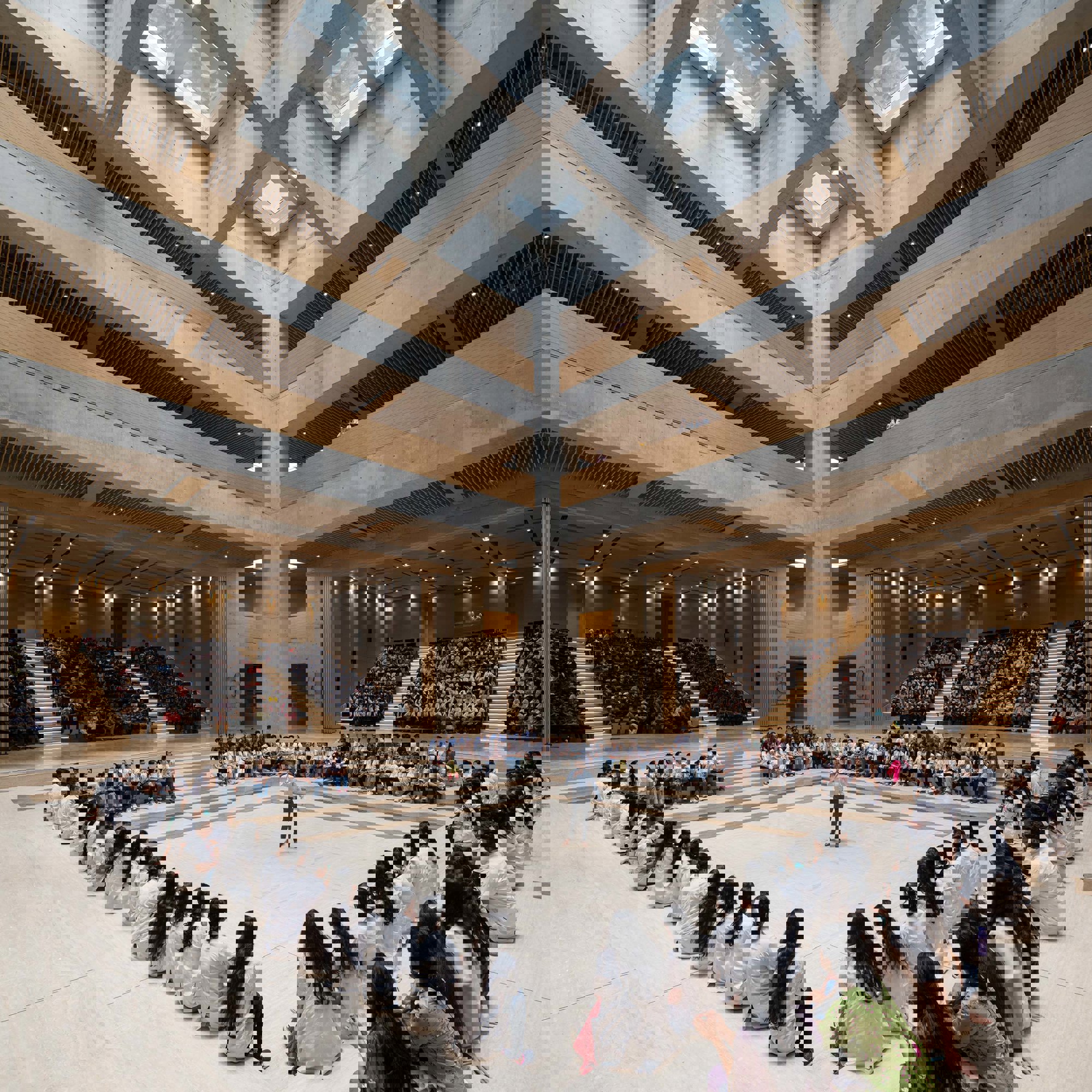 At the heart of the building, four large auditoria are arranged around a sunken amphitheatre for graduation ceremonies, performances and sporting events. The auditoria have been flexibly designed to be opened up or closed down, depending on the scale of the event. The library promotes the exchange of ideas and knowledge across four floors of the building. A sequence of tiers, balconies and stairs create a dramatic internal environment.