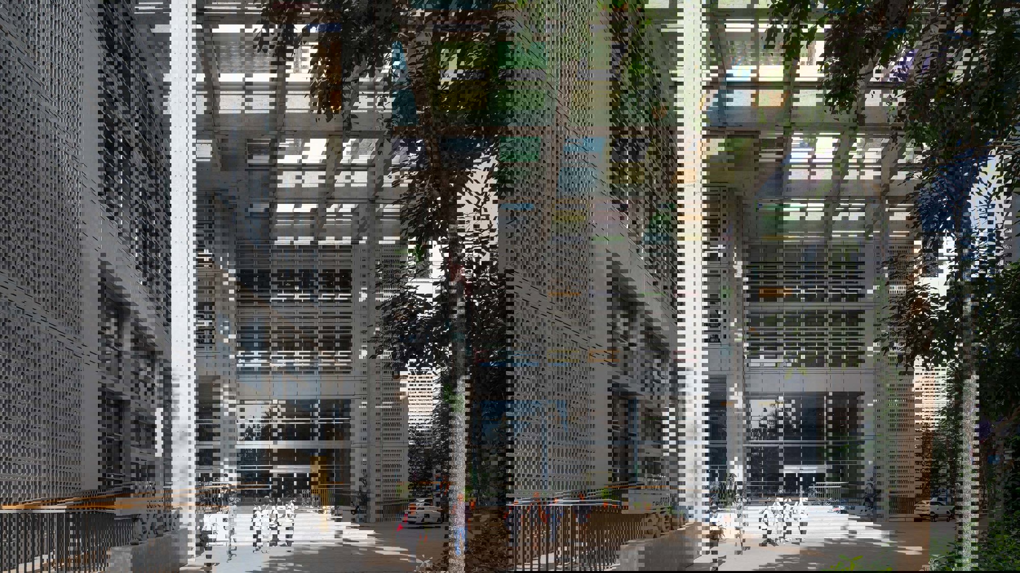 In contrast, the upper residential units are clad in lightweight cast and extruded aluminium. The corridors are naturally ventilated and offer glimpses of the spectacular two-acre sky garden which spans the full length of the building, between the academic and residential volumes.